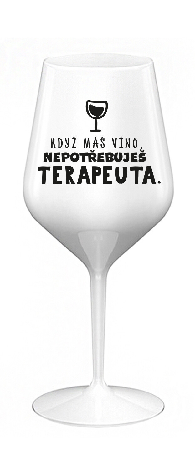 KDYŽ MÁŠ VÍNO, NEPOTŘEBUJEŠ TERAPEUTA - bílá nerozbitná sklenice na víno 470 ml
