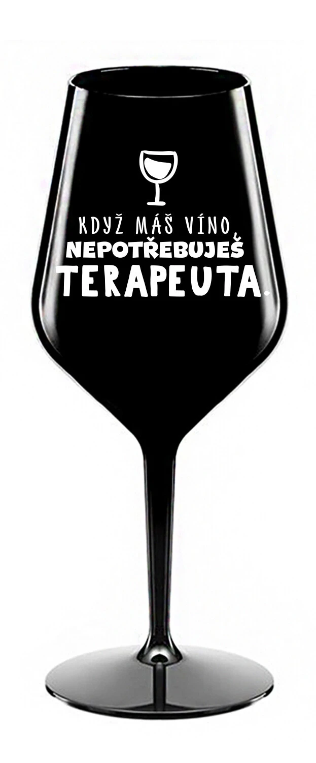 KDYŽ MÁŠ VÍNO, NEPOTŘEBUJEŠ TERAPEUTA - černá nerozbitná sklenice na víno 470 ml