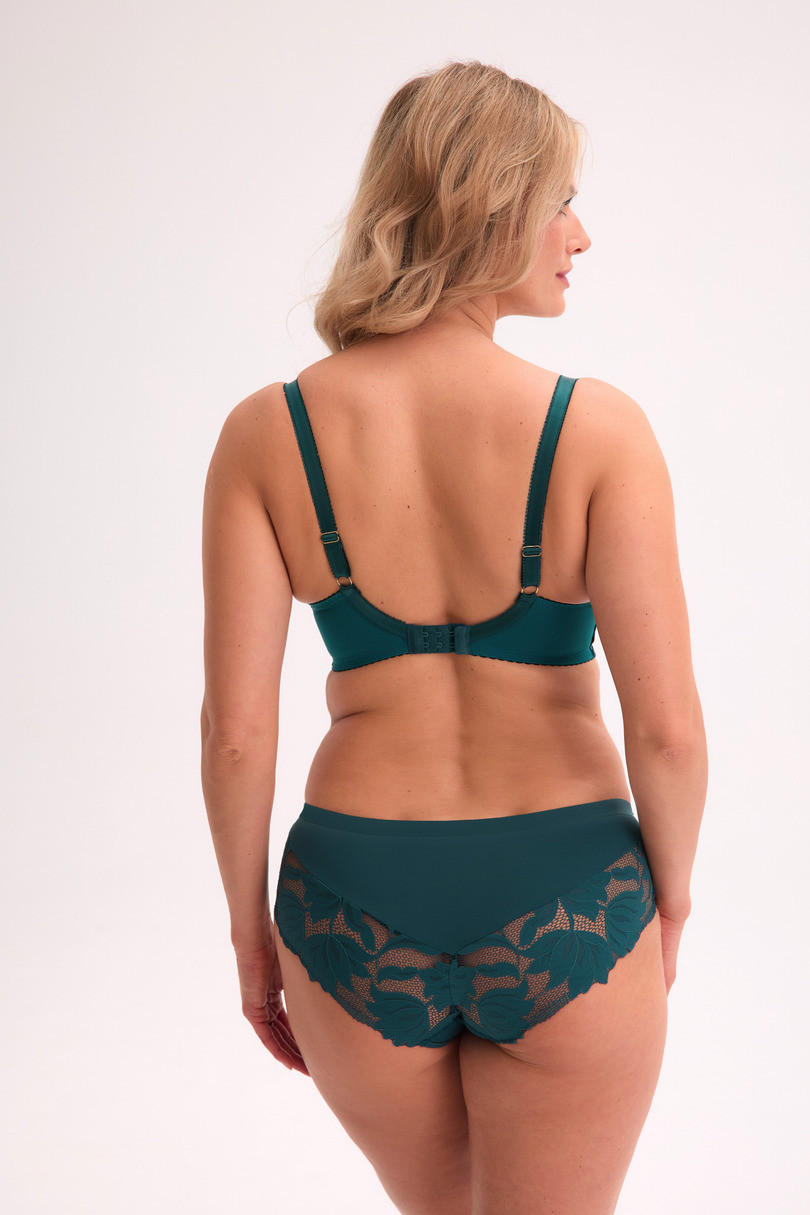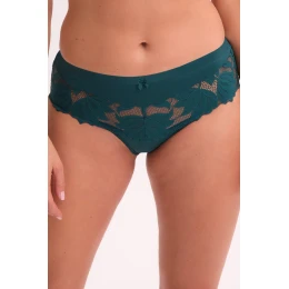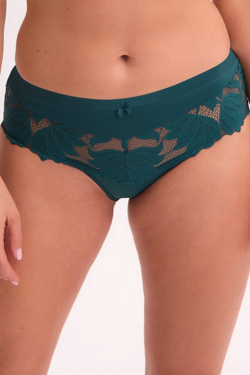 Pełne figi w odcieniu głębokiej zieleni to idealna propozycja dla kobiet ceniących komfort i elegancję w jednym. Model został wykonany z miękkiej mikrofibry oraz zmysłowej koronki z florystycznym motywem, która subtelnie oplata biodra i pośladki. Fason z wyższym stanem doskonale układa się na sylwetce, delikatnie modelując jej linie. Szeroki pas zapewnia stabilność i wygodę, a transparentne wstawki z koronki dodają lekkości i romantycznego charakteru. To figi, które łączą w sobie codzienną funkcjonalność z wyjątkowym wyglądem.