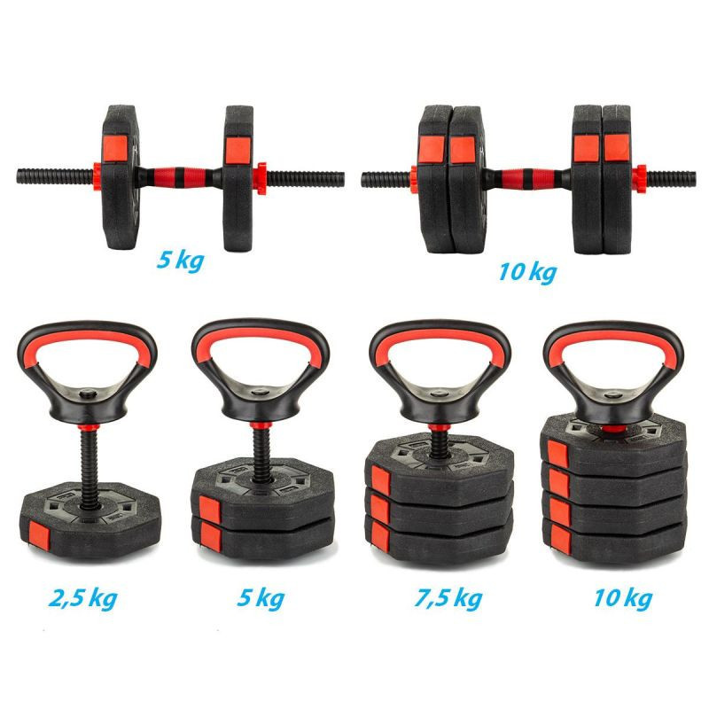 složená sada 2 v 1 o hmotnosti 10 kg s funkcí činek a kettlebellů je univerzální sadou pro každého. Slouží k silovému tréninku, všeobecnému rozvoji a rehabilitaci. Trénink se závažími vám pomůže vytvarovat svaly předloktí, paží, ramen a hrudníku. Pohyb můžete provádět ve stoje, vsedě nebo vleže na tréninkové lavici. Činky lze použít k silovému tréninku i ke kombinacím posilovacích cviků. Závaží můžete kdykoli přidat/ubrat tak, že jejich hmotnost přizpůsobíte svým potřebám.