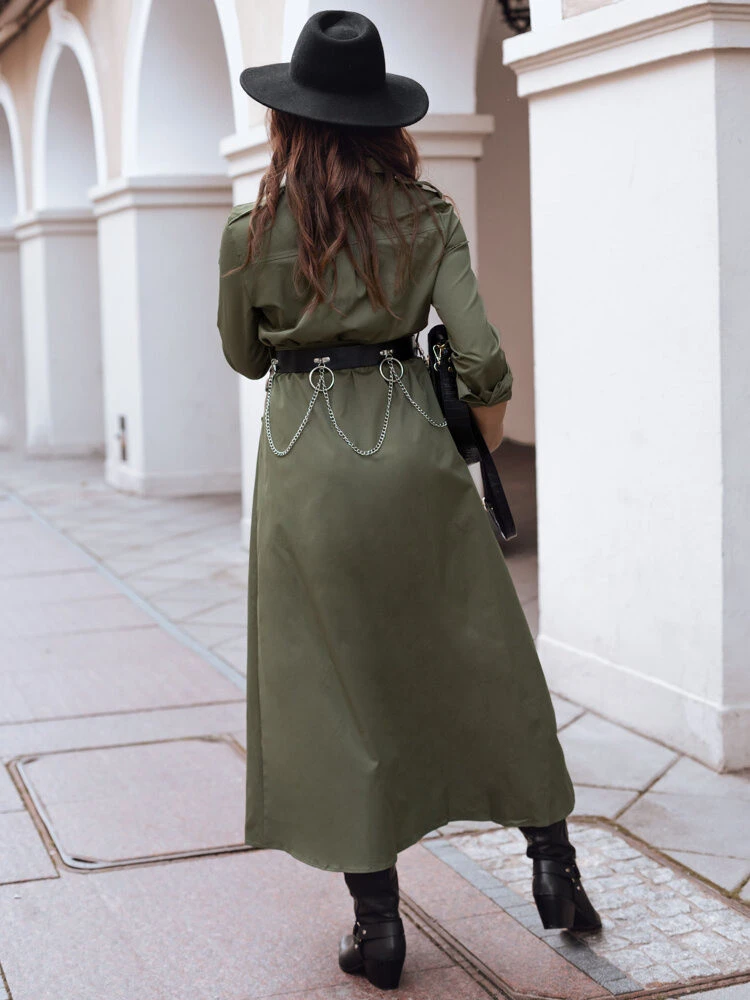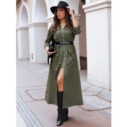 Exkluzivní šaty s podšívkou. Model se zapíná na zip. Součástí je pásek. Na předním díle jsou čtyři hluboké kapsy. Rukávy se zapínají na patentky. Šaty lze použít i jako svrchní oděv. Model má zúžený pas, který zvýrazňuje pas. Materiál není elastický.