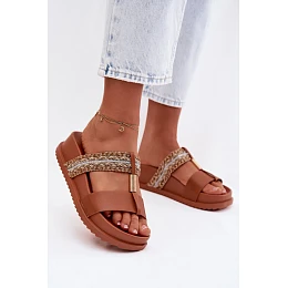 Dámské pantofle na platformě jsou stylovou nabídkou na teplé dny. Model se vyznačuje lesklým páskem s tkaním, který přitahuje pozornost a dodává celku módní charakter. Zlatý detail spojující dva pásky představuje elegantní prvek, který zdůrazňuje výjimečný vzhled obuvi. Platforma zajišťuje pohodlné nošení a stabilitu, díky čemuž se pantofle skvěle hodí do letních stylizací.
