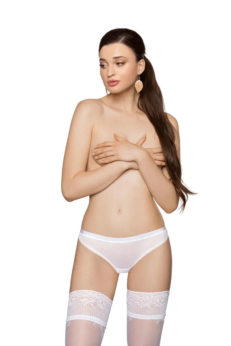 Veľmi jemné klasické plné nohavičky z elastického priesvitného tylu s čipkovým lemom. Vyšívaný kvetinový motív na zadnej strane v kombinácii s úzkymi a jemnými šnúrkami dodáva pikantnosť.