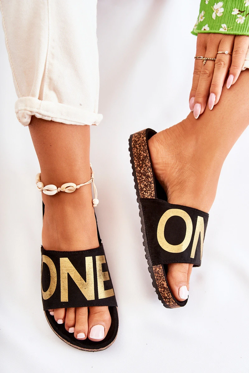 Klasické nazouvací pantofle s nápisem Černá a zlatá Bahari