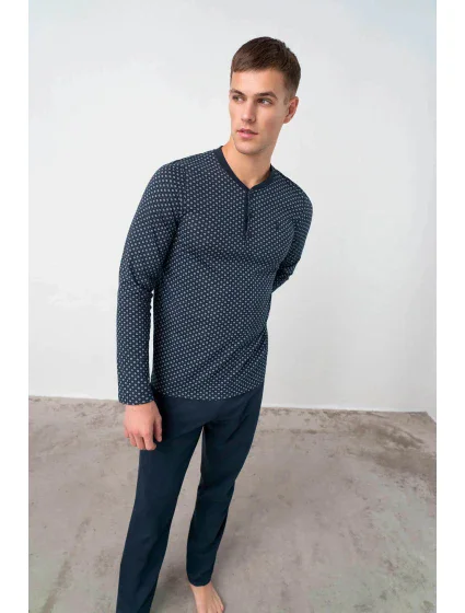 Pohodlné dvoudílné pánské pyžamo pro kvalitní spánek a volný čas. Komplet sestává z trika dlouhým rukávem, výstřihem do V a knoflíkovou légou, který doplňují dlouhé jednobarevné kalhoty. Toto pánské pyžamo je vyrobené z vysoce kvalitní, genetický nemodifikované řecké bavlny, která poskytuje vysoké pohodlí, příjemný pocit na dotek, prodyšnost, pružnost a odolnost.