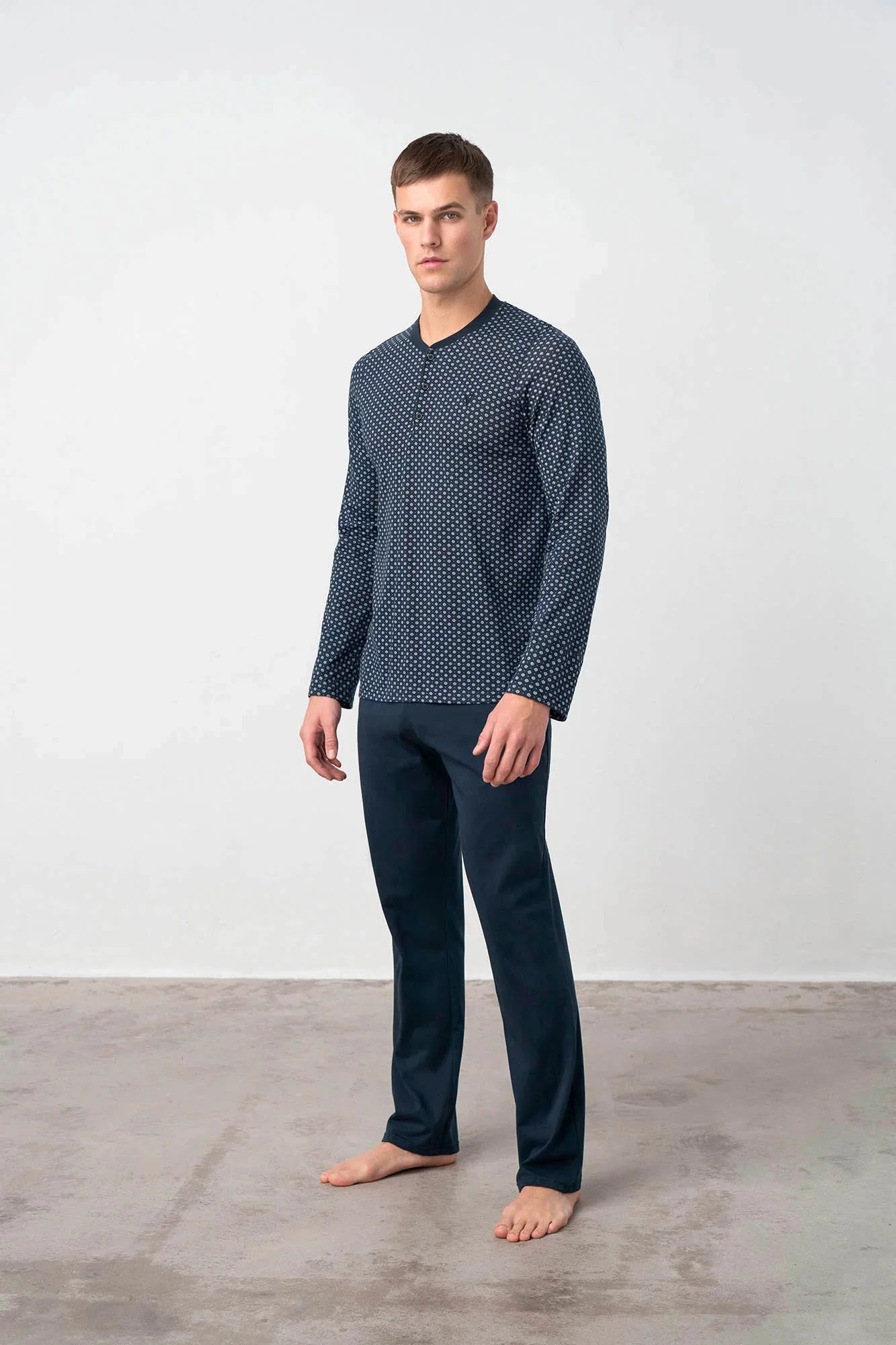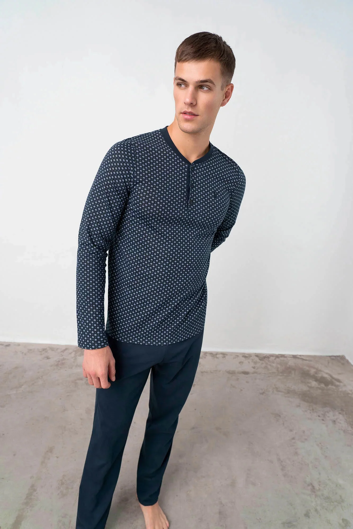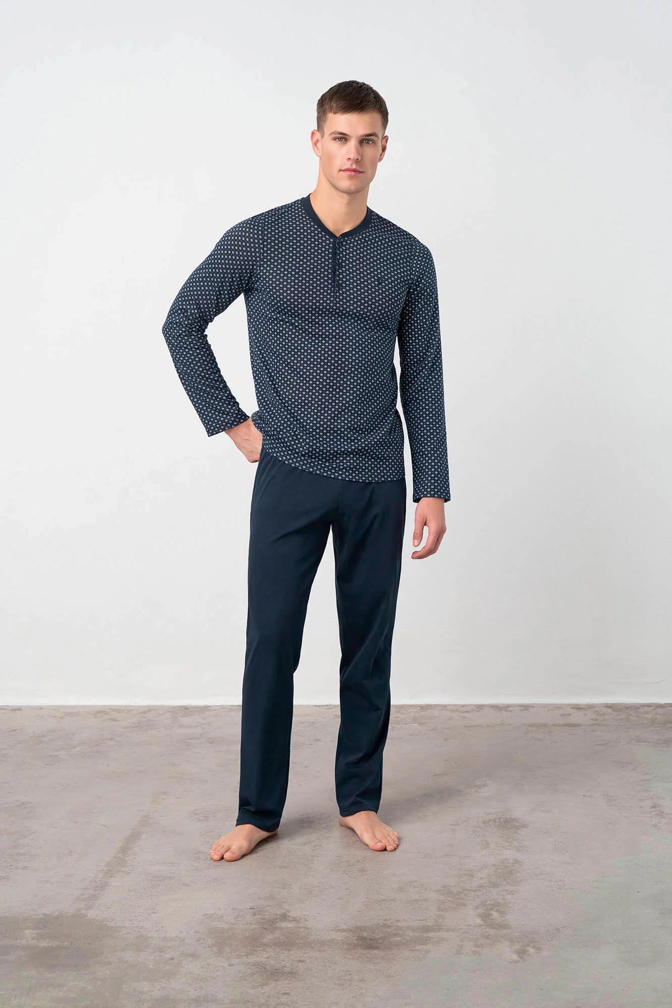 Pohodlné dvoudílné pánské pyžamo pro kvalitní spánek a volný čas. Komplet sestává z trika dlouhým rukávem, výstřihem do V a knoflíkovou légou, který doplňují dlouhé jednobarevné kalhoty. Toto pánské pyžamo je vyrobené z vysoce kvalitní, genetický nemodifikované řecké bavlny, která poskytuje vysoké pohodlí, příjemný pocit na dotek, prodyšnost, pružnost a odolnost.