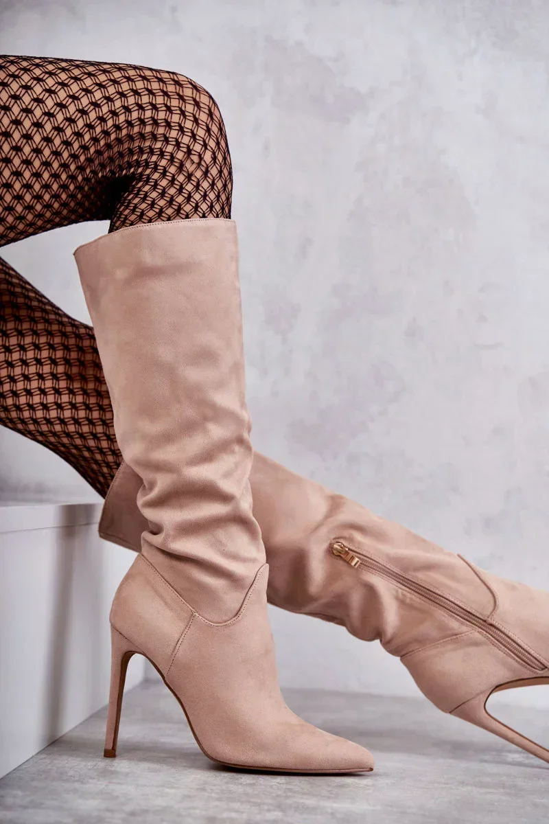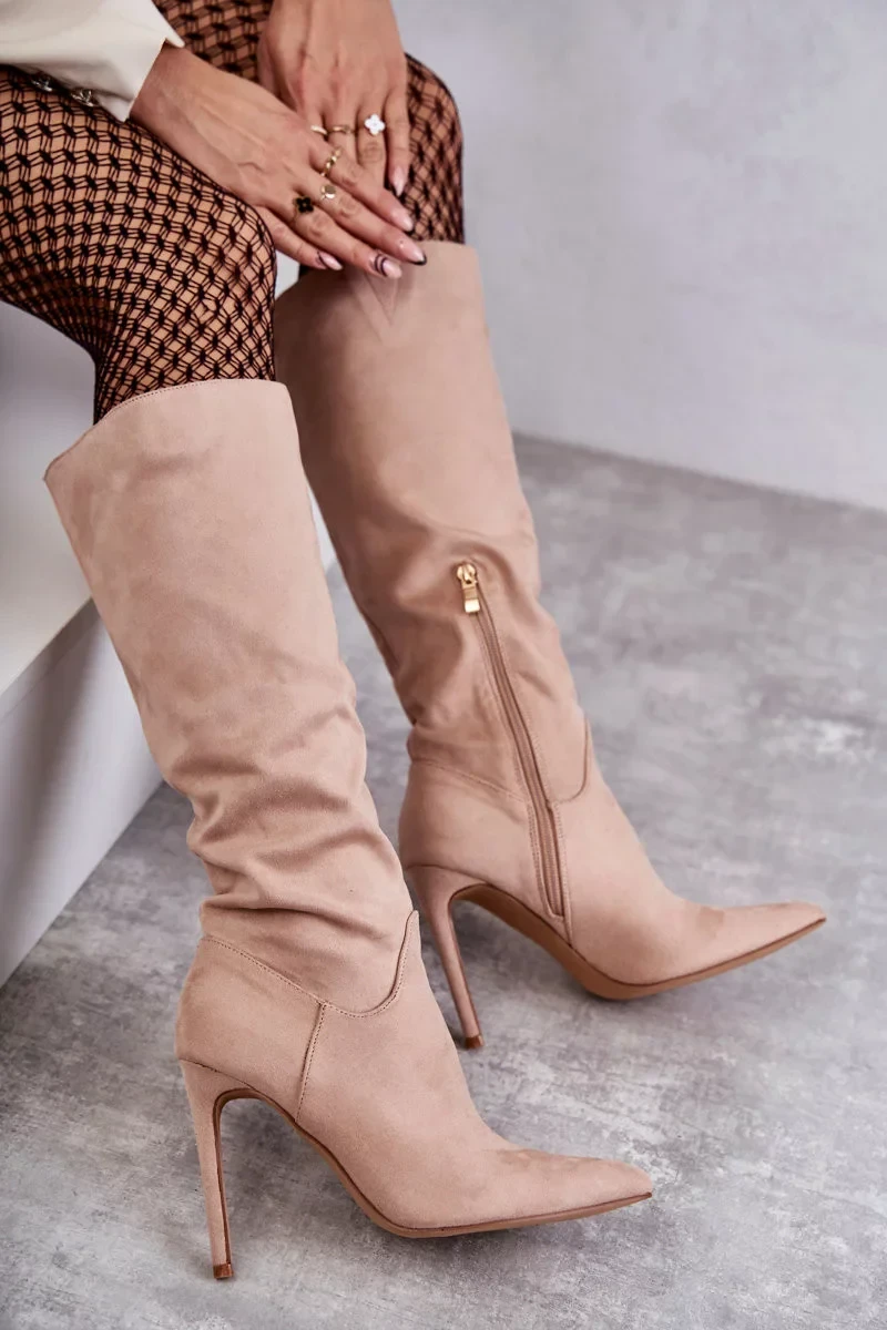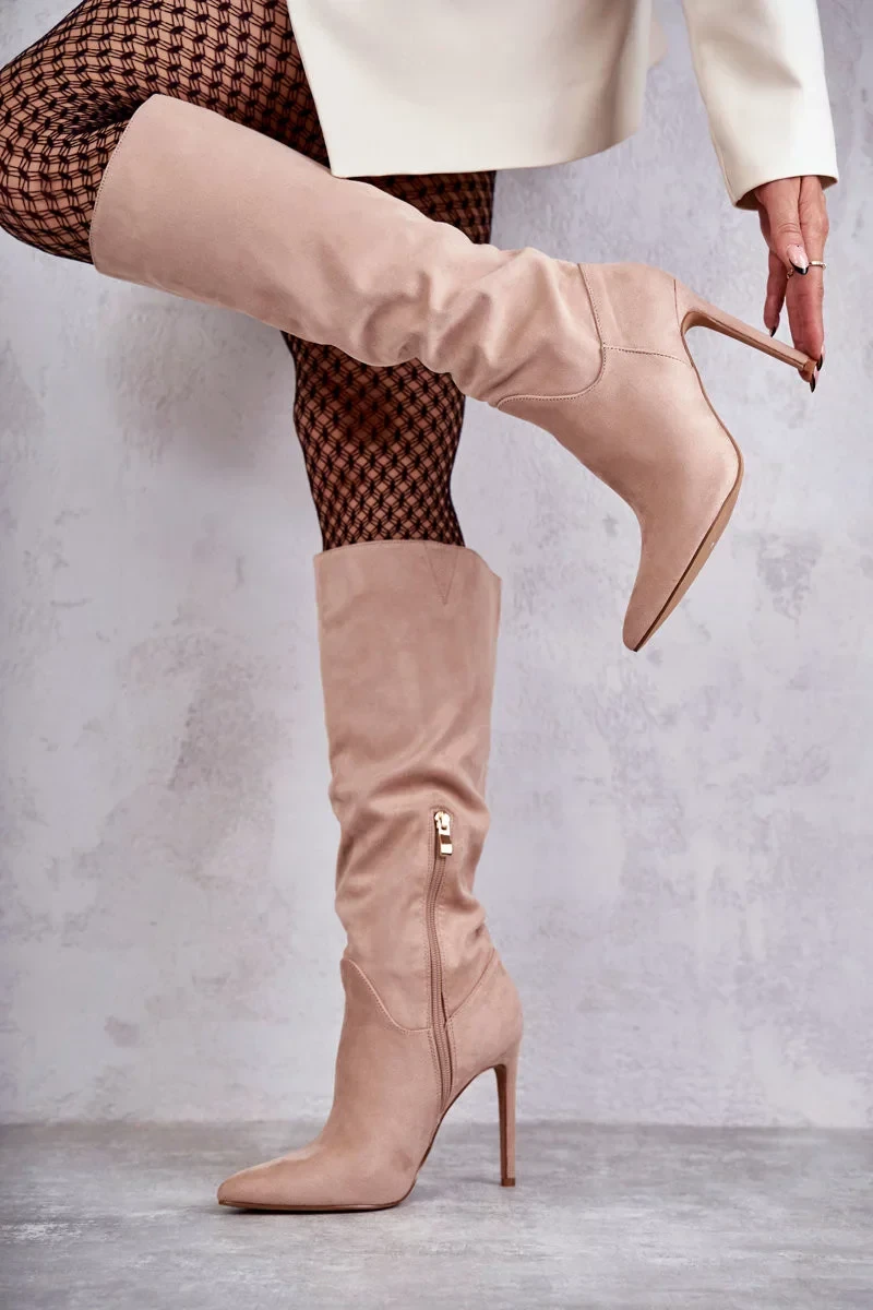 Klasické dámské kozačky se svrškem nad kolena. Mají jemné prošívání. Vyrobeno z ekologického semiše příjemného na dotek. Model byl upevněn na podpatku ve formě čepu. Vyztužená pata. Zapínání na zip na boku. Pohodlný model, který by neměl chybět ve vašem šatníku! Využijete je v mnoha stylech! Musí být vaše! Při výběru velikosti použijte tabulku velikostí.