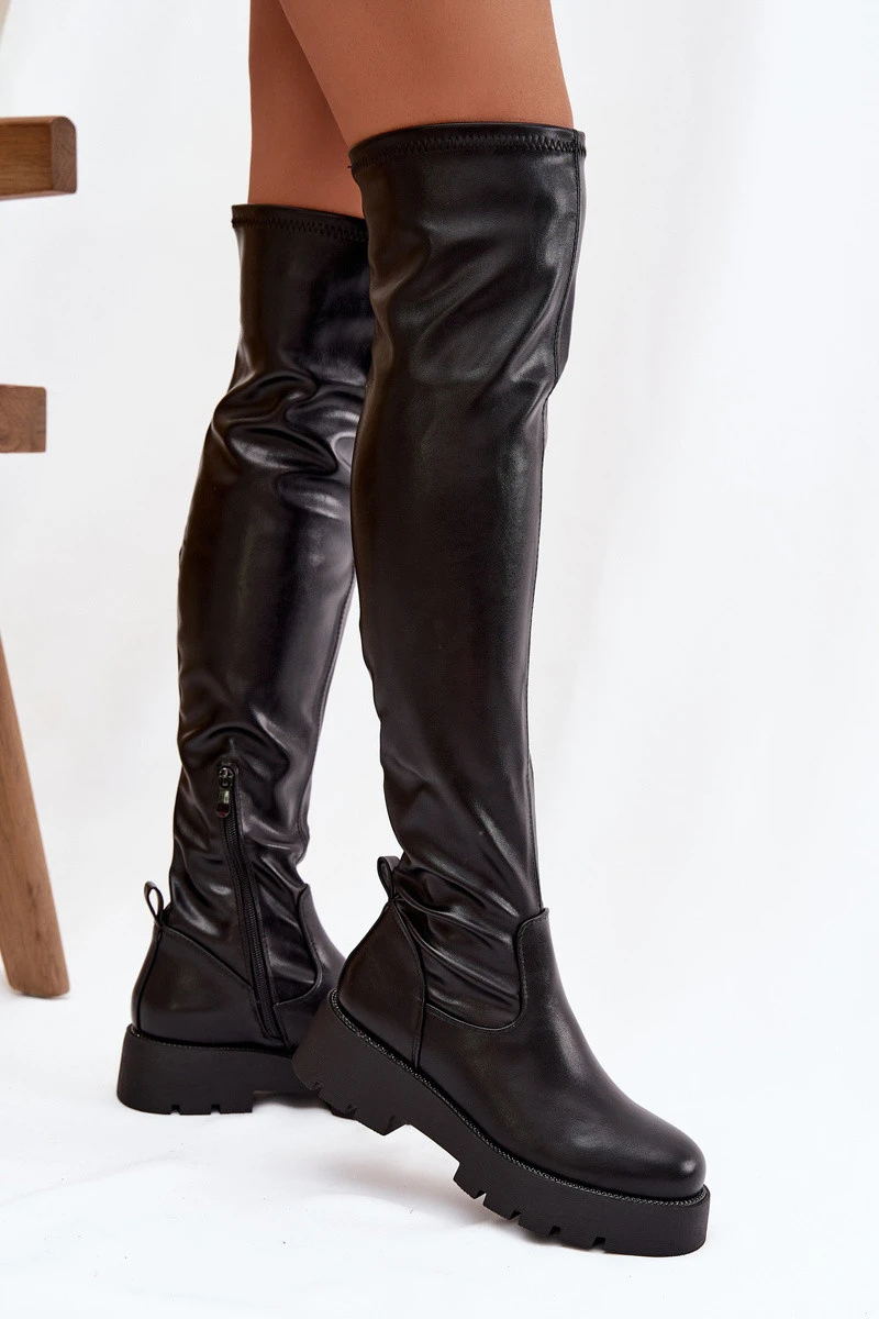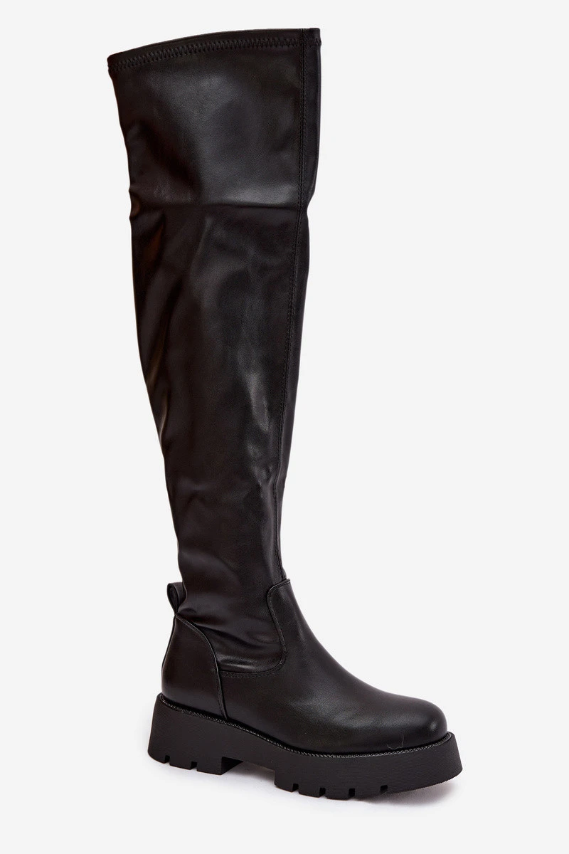 Dámské kozačky s vysokým límcem sahajícím za koleno jsou nápadný model, který krásně zvýrazní nohy. Nazouvací styl doplněný zipem umístěným dole usnadňuje obouvání a poskytuje pohodlné přizpůsobení. Na okraji podrážky jsou drobné zirkony, které dodávají celku jemný, lesklý akcent. Ideální obuv k stylizacím s šaty, sukněmi nebo koženými šortkami — skvělé jak na každý den, tak na výjimečné příležitosti. Při výběru velikosti se řiďte tabulkou velikostí. Při výběru velikosti se řiďte tabulkou velikostí.EAN čárové kódy zboží jsou: