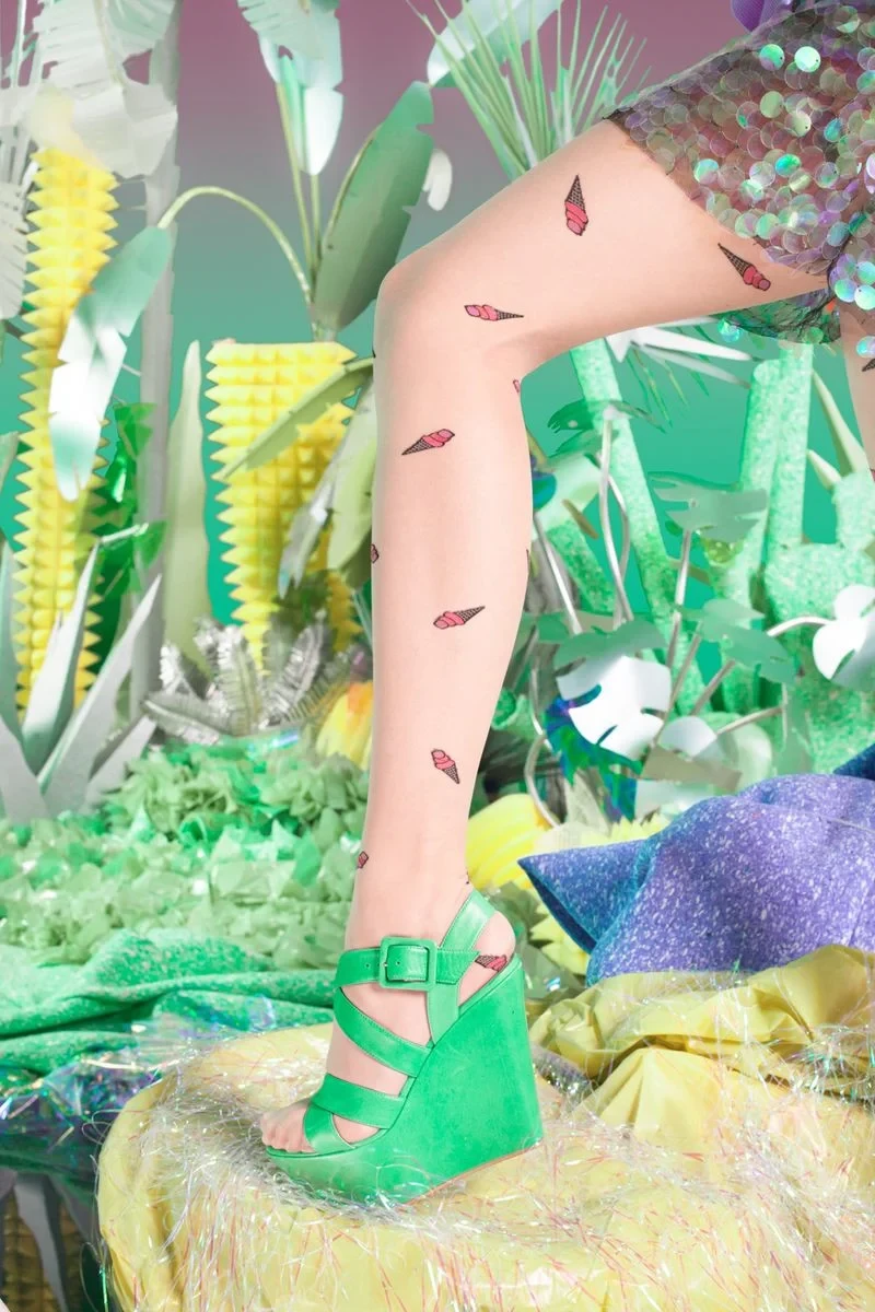Zajímavé punčochové kalhoty 20 DEN zdobené neobvyklým a zajímavým vzorem - růžovou zmrzlinou. Určitě upoutají pozornost každého módního nadšence. Vyrobeno z elastického vlákna s dvojitou podšívkou z polyamidového hedvábí. Složení: 85 % polyamid, 15 % elastan.