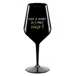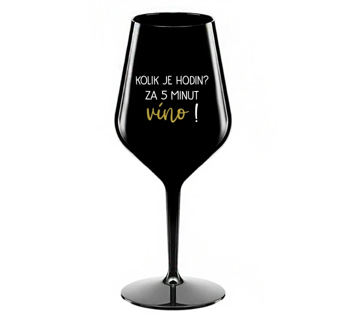 KOLIK JE HODIN? ZA 5 MINUT VÍNO! - černá nerozbitná sklenice na víno 470 ml
