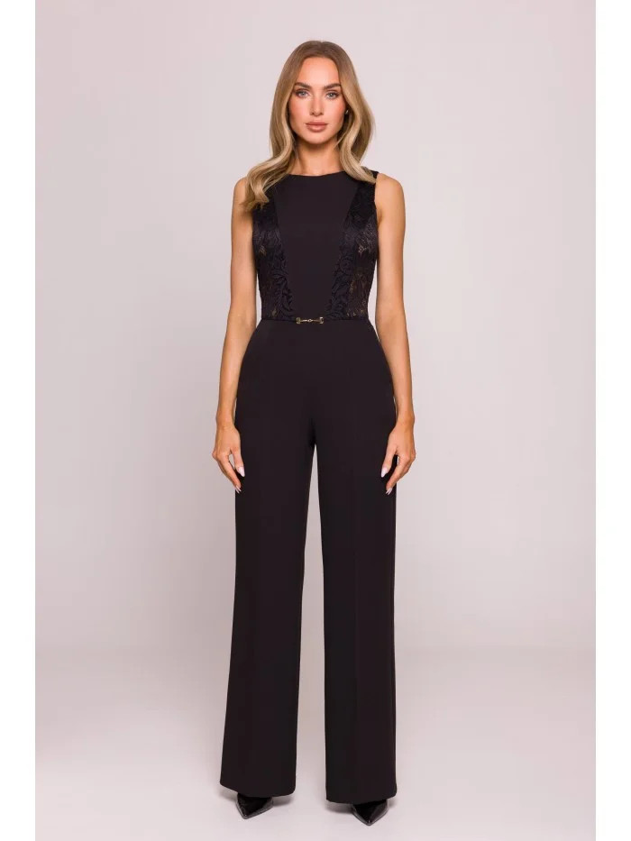 Krajka: 90% nylon 10% spandex Hlavní tkanina: 95% polyester 5% elastan MATERIÁL Materiál: hladká tkanina; krajkové vsadky na bocích PODROBNOSTI O PRODUKTU Výstřih: vysoký, kulatý výstřih Rukávy: bez rukávů Zapínání: skrytý zip na zádech Pas: ohraničený, s ozdobným kovovým detailem vpředu Kapsy: žádné Nohy: dlouhé, široké, s předním řasením Model: M866 Navrženo a vyrobeno v Polsku Modelka na fotografii měří 171 cm a má na sobě velikost S STŘIH A VÝSTŘIH Střih: vypasovaný živůtek s volnými, elegantními kalhotami Tvar: silueta na míru s geometrickými krajkovými panely, které opticky tvarují pas Délka: plná délka nohavic