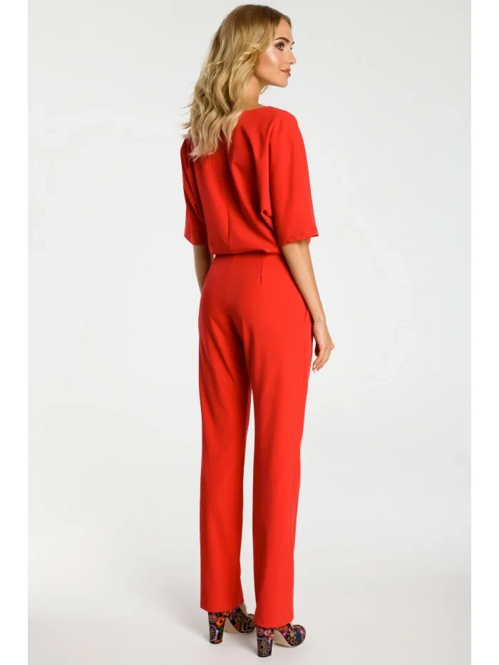 - 65 % polyester - 30 % viskóza - 5 % elastan Kombinéza s kimonovým vrškem a elegantními kalhotami s rovnými nohavicemi. Jednoduché a prosté, přesto velmi elegantní pro každodenní i večerní nošení.