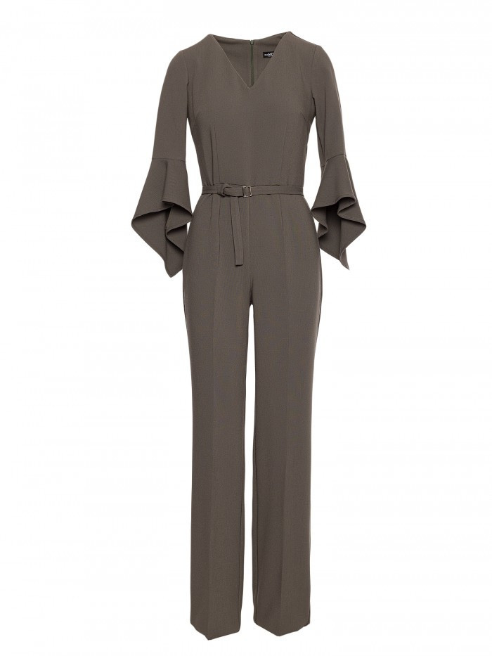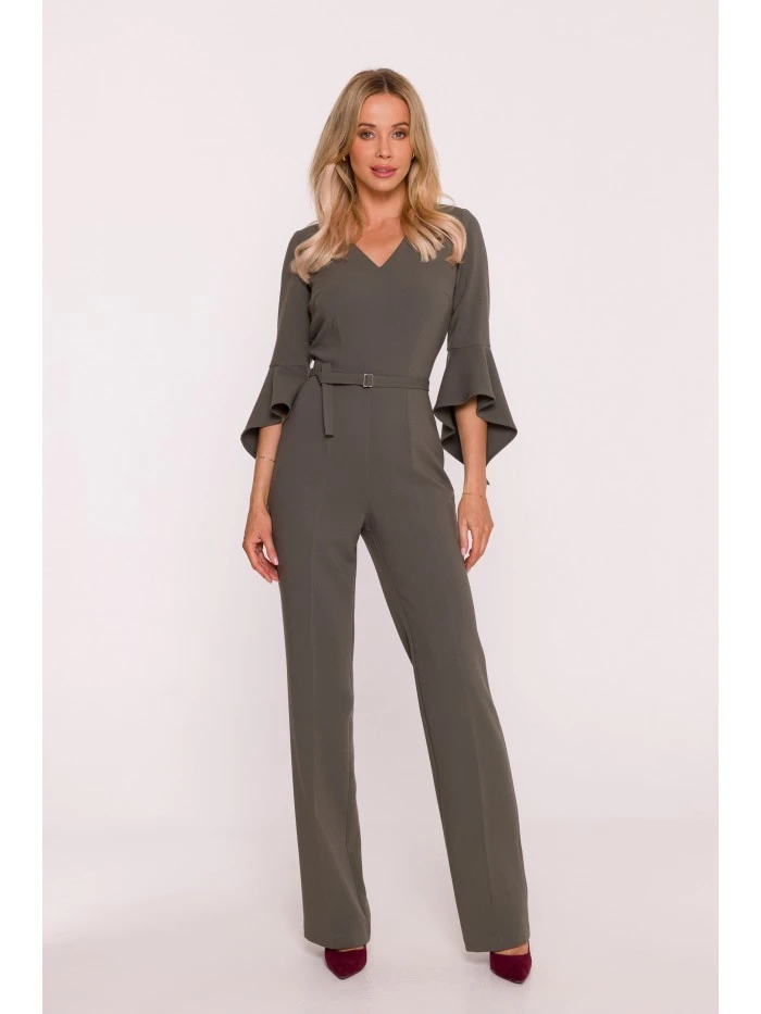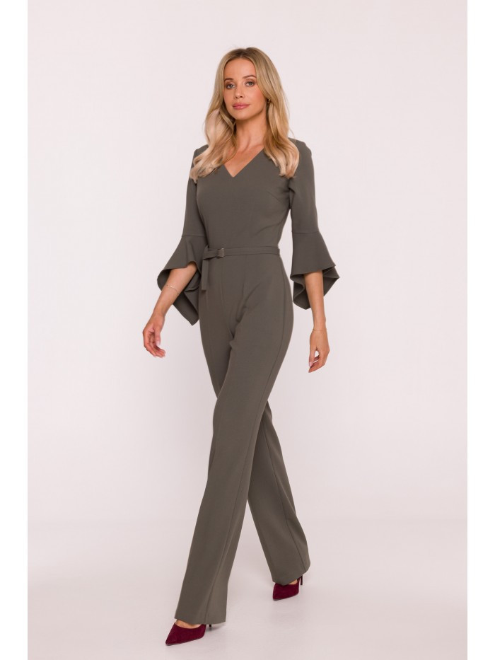 63% polyester 33% viskóza 4% elastan LÁTKA Materiál: hladká tkaná látka s jemným povrchem PODROBNOSTI O PRODUKTU Výstřih: výstřih do V Rukávy: délka 7/8, zakončené volánky Nohy: rovné, s řasením Pas: zvýrazněný páskem a sponou Zapínání: skrytý zip na zádech Kapsy: žádné Podšívka: žádná Model: S416 Navrženo a vyrobeno v Polsku Modelka je vysoká 174 cm a nosí velikost S STYL A STŘIH Styl: ženský overal s ozdobnými rukávy Tvar: vypasovaný vršek, rovné nohy Délka: po celé délce, až na zem