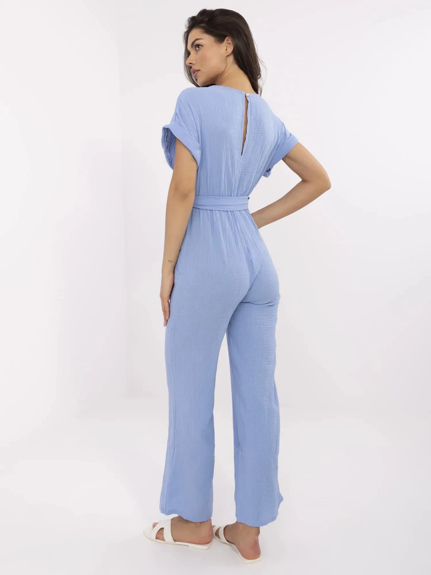 Wymiary kombinezonu w rozmiarze one size mierzone na płasko: szerokość pod pachami - 48 cm, szerokość w talii - 32 cm (na płasko), szerokość w talii - 55 cm ( po rozciągnięciu), długość rękawa - 24 cm, szerokość w biodrach - 46 cm, długość całkowita - 142 cm.