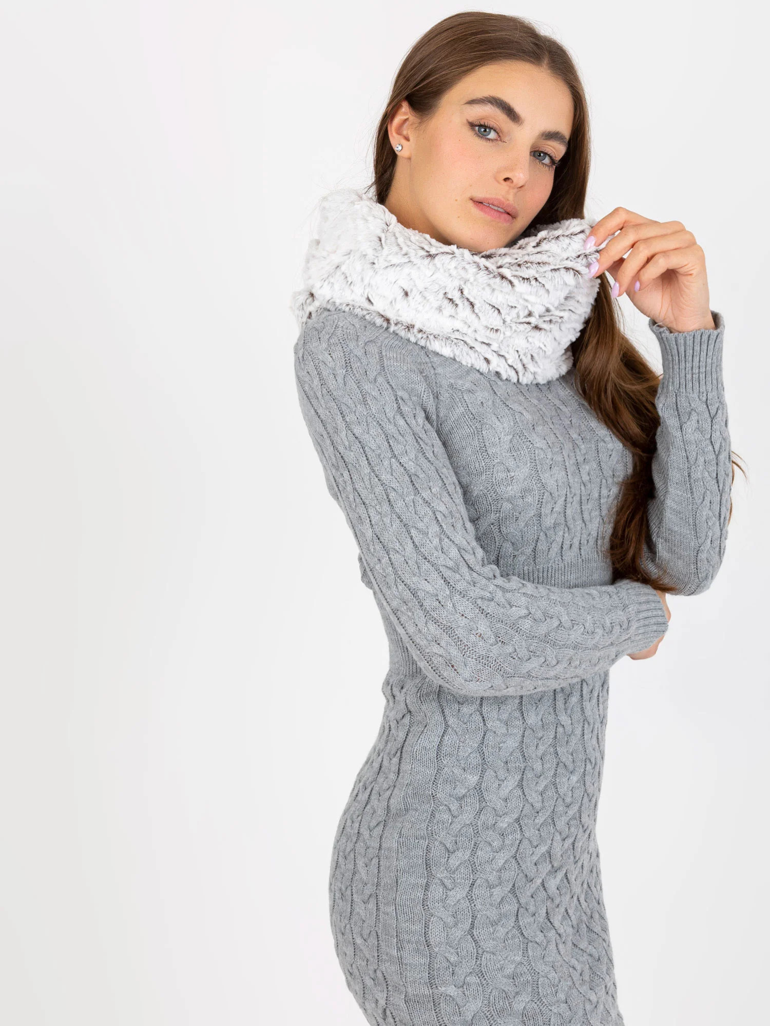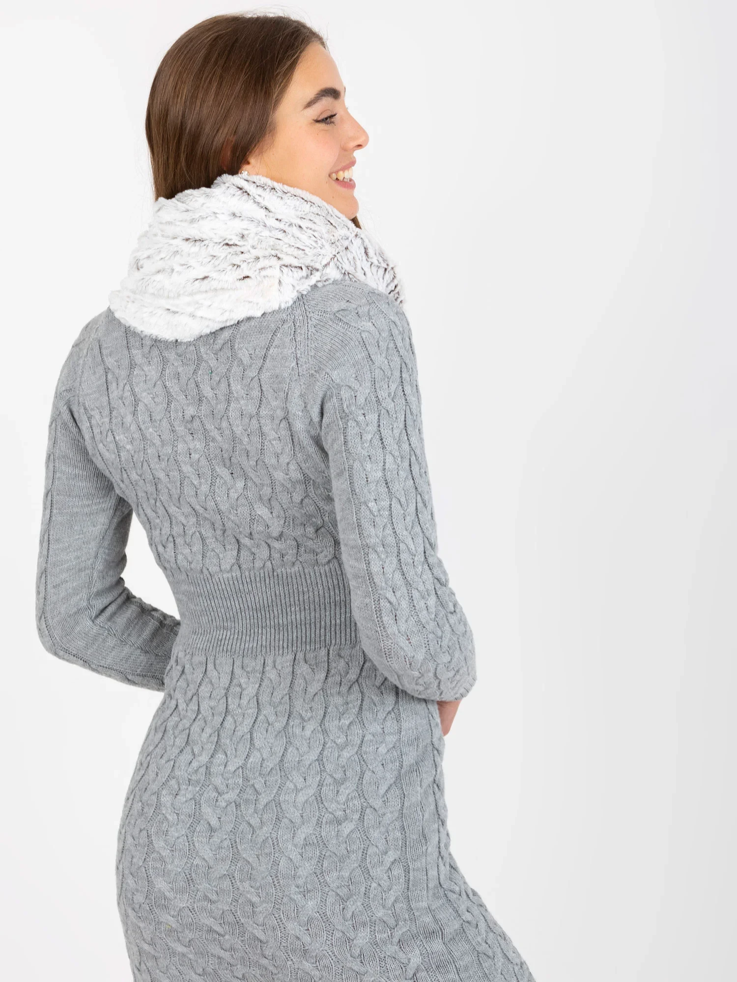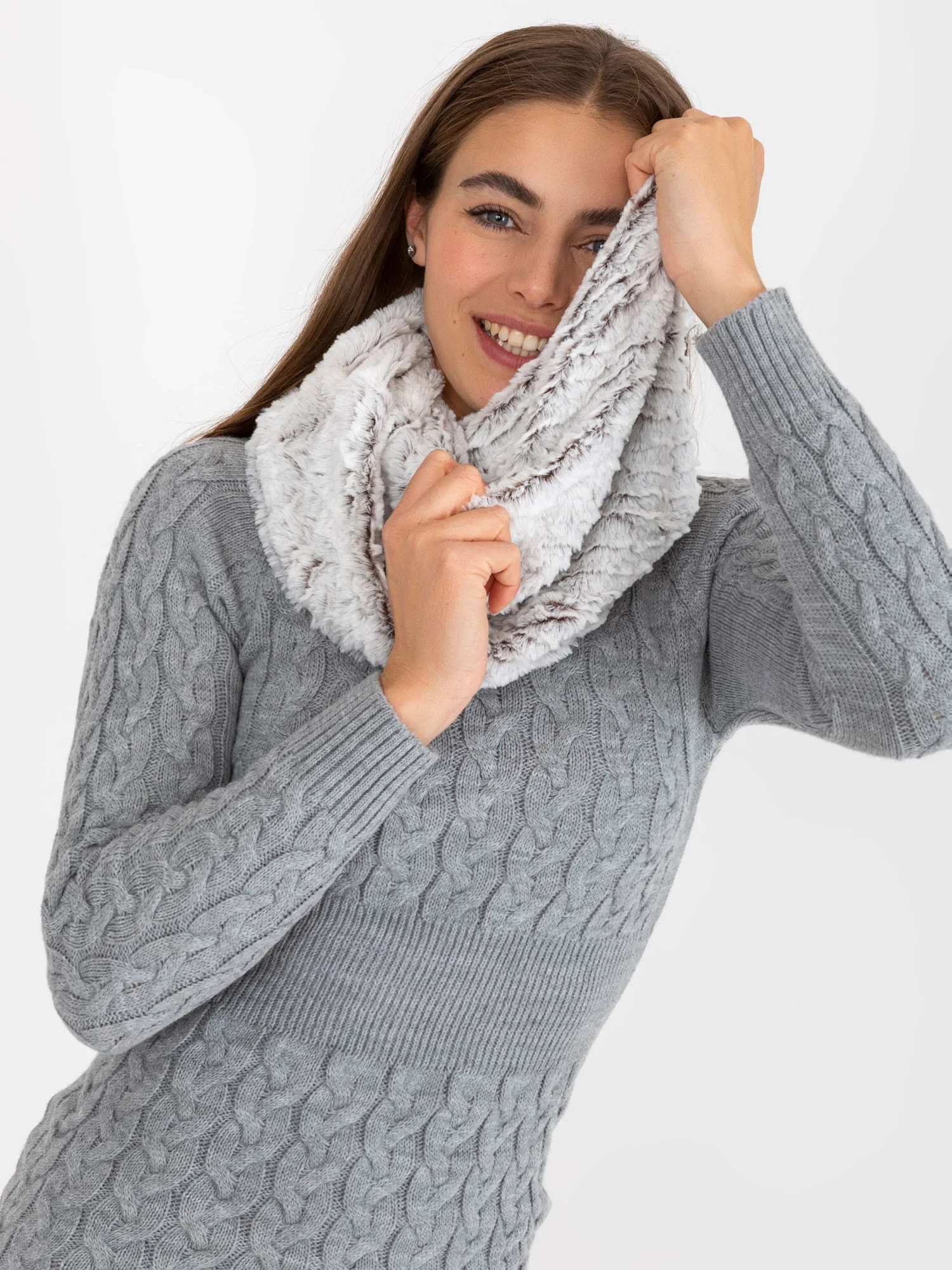 Bílý a tmavě hnědý komín z umělé kožešiny .