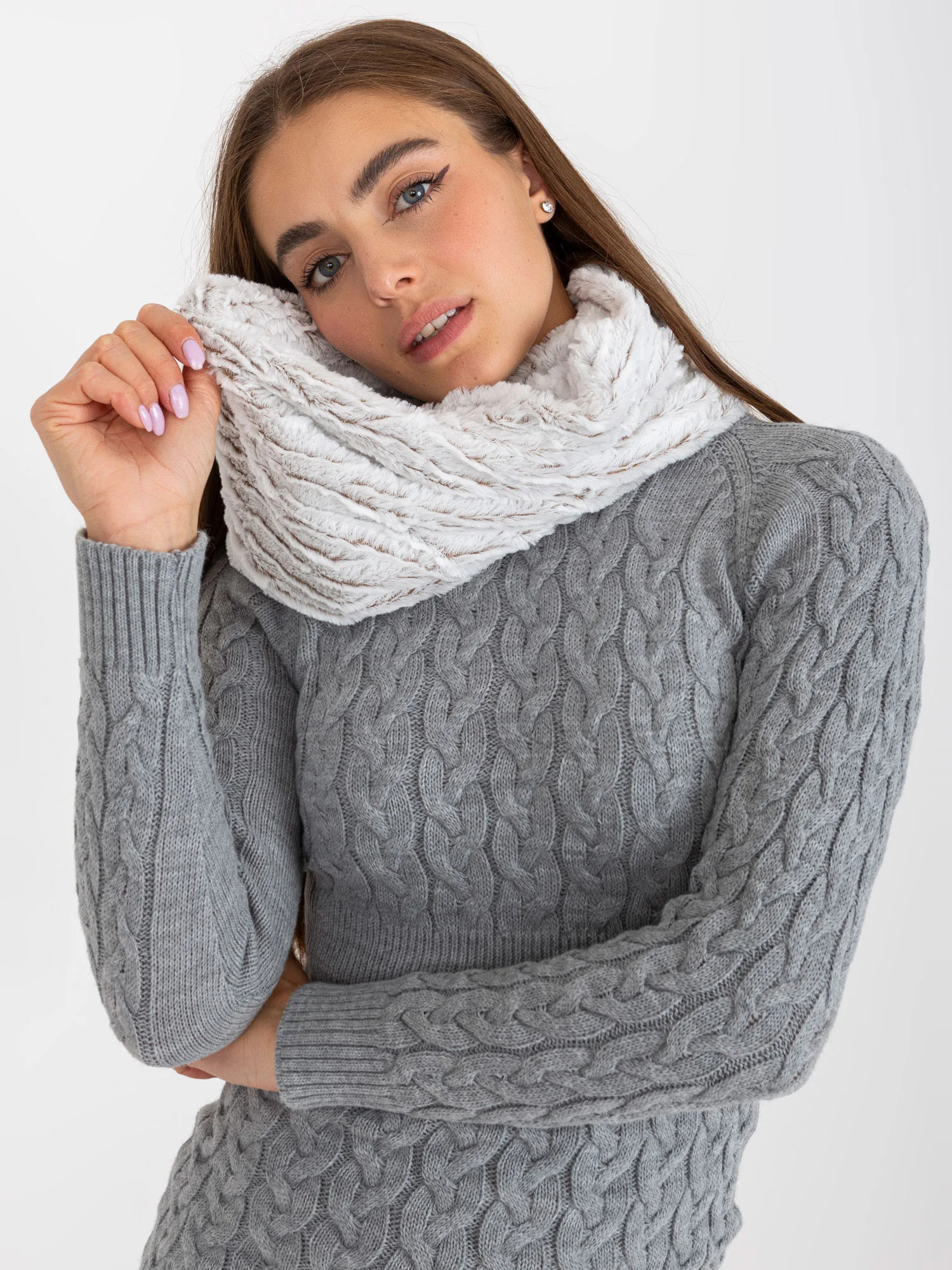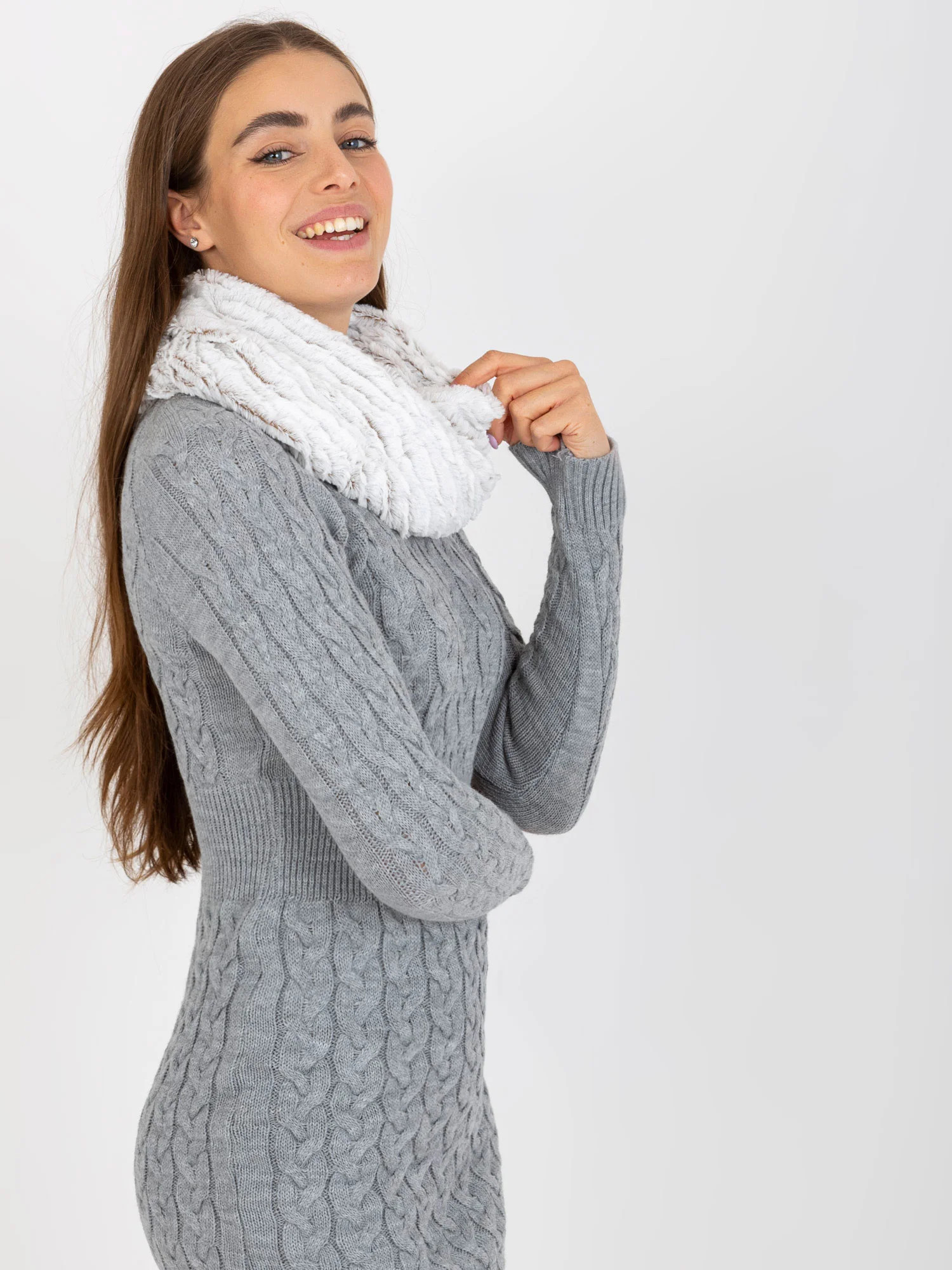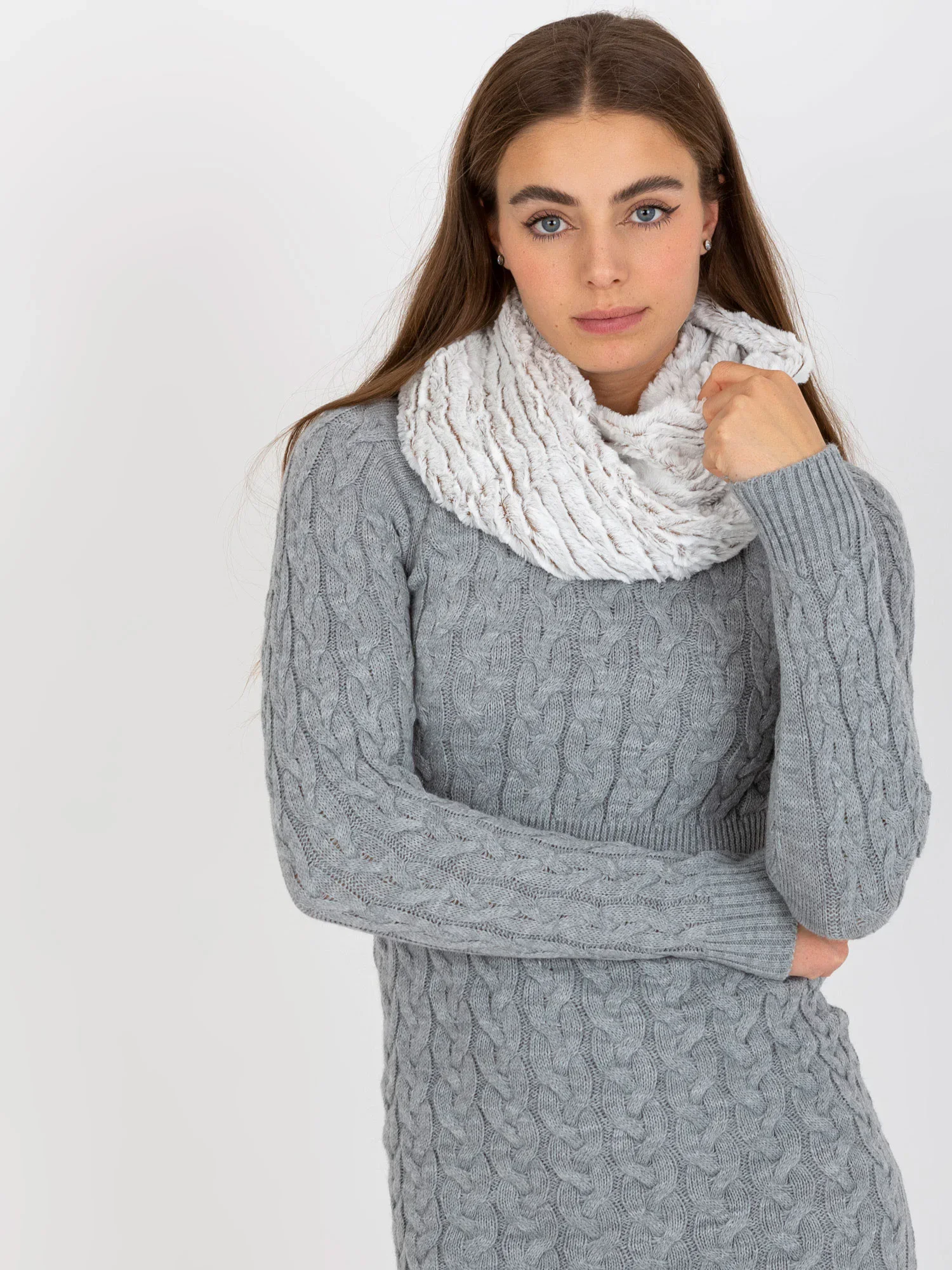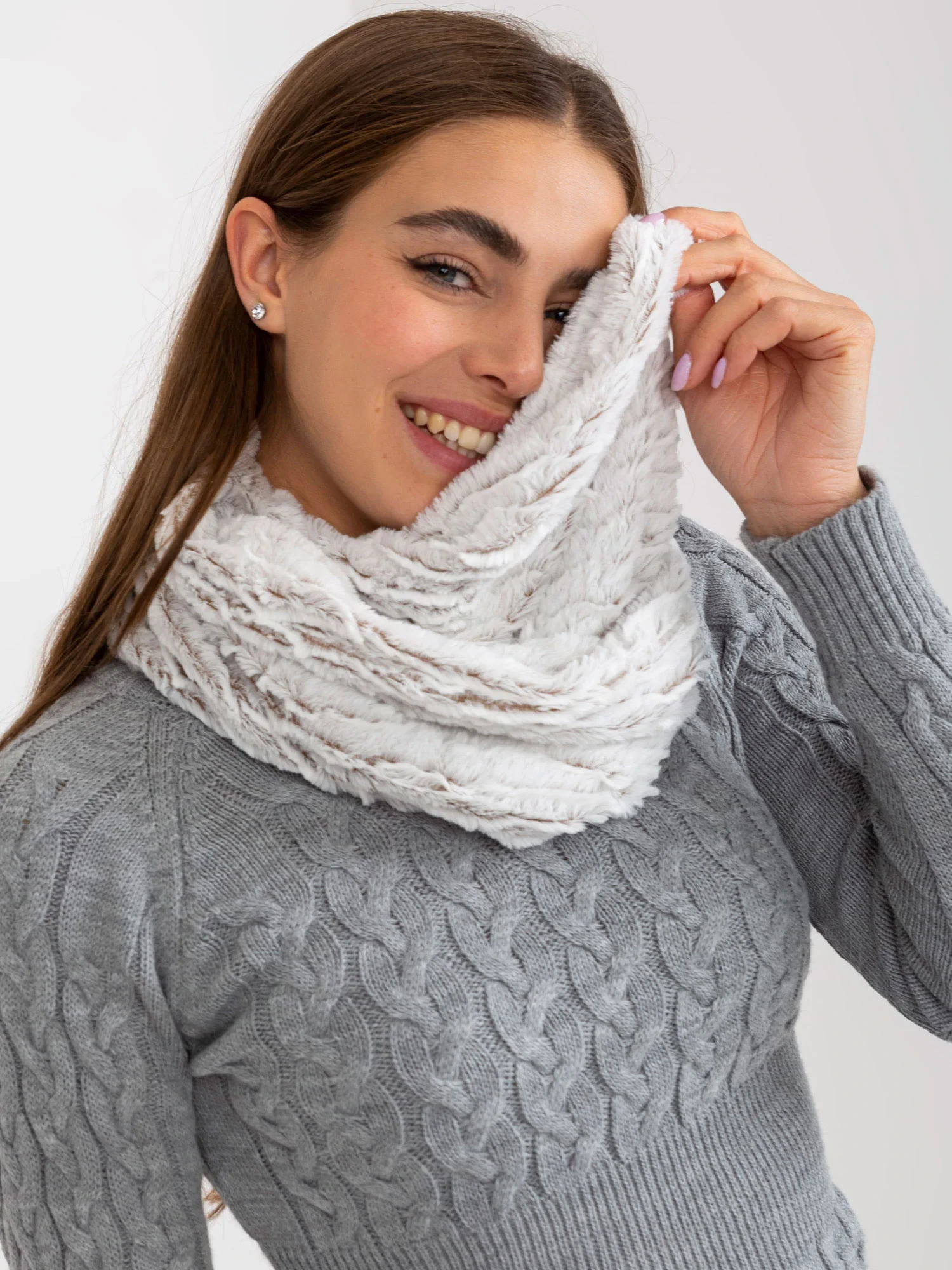Bílý a hnědý teplý komín z umělé kožešiny .