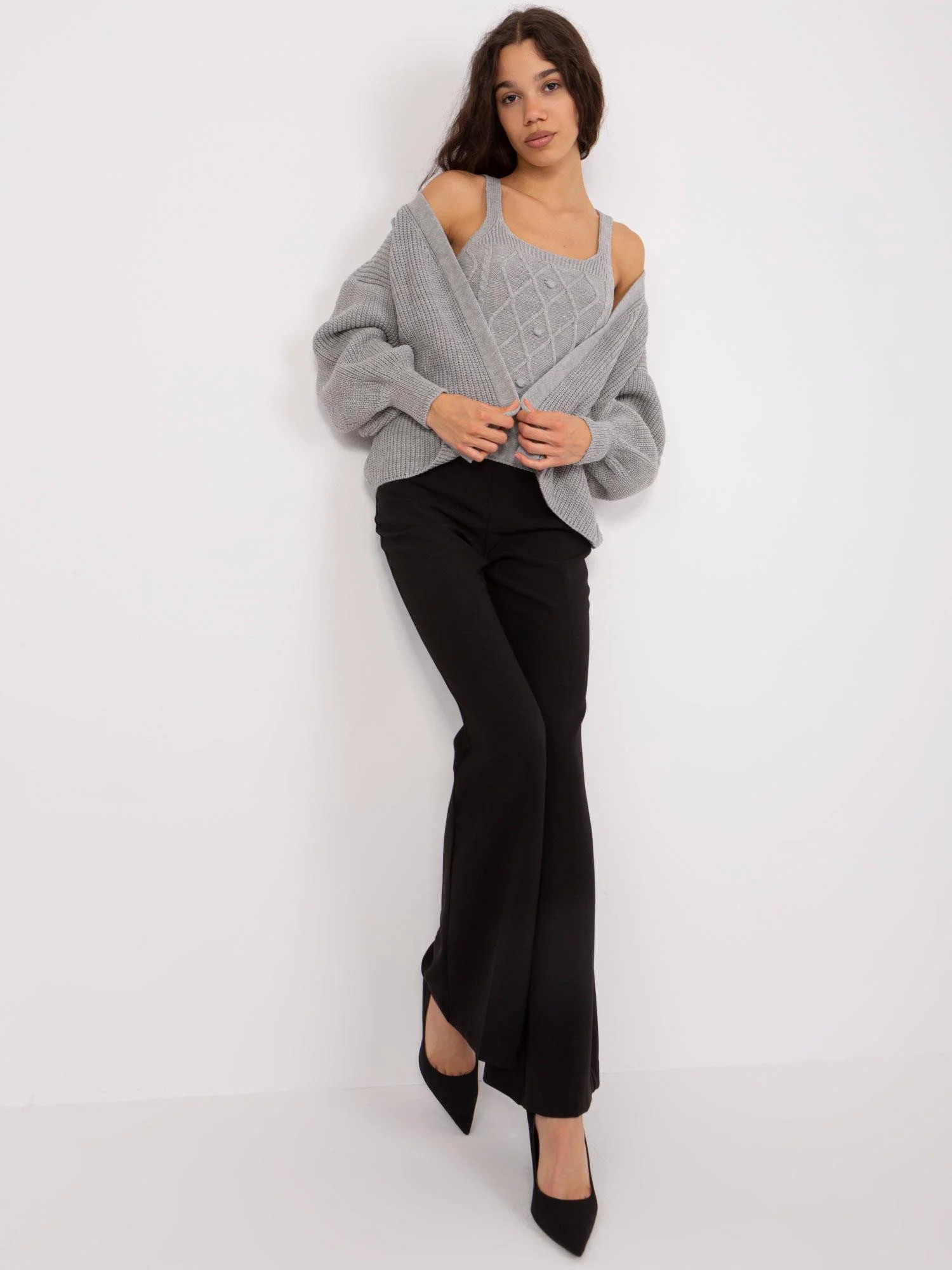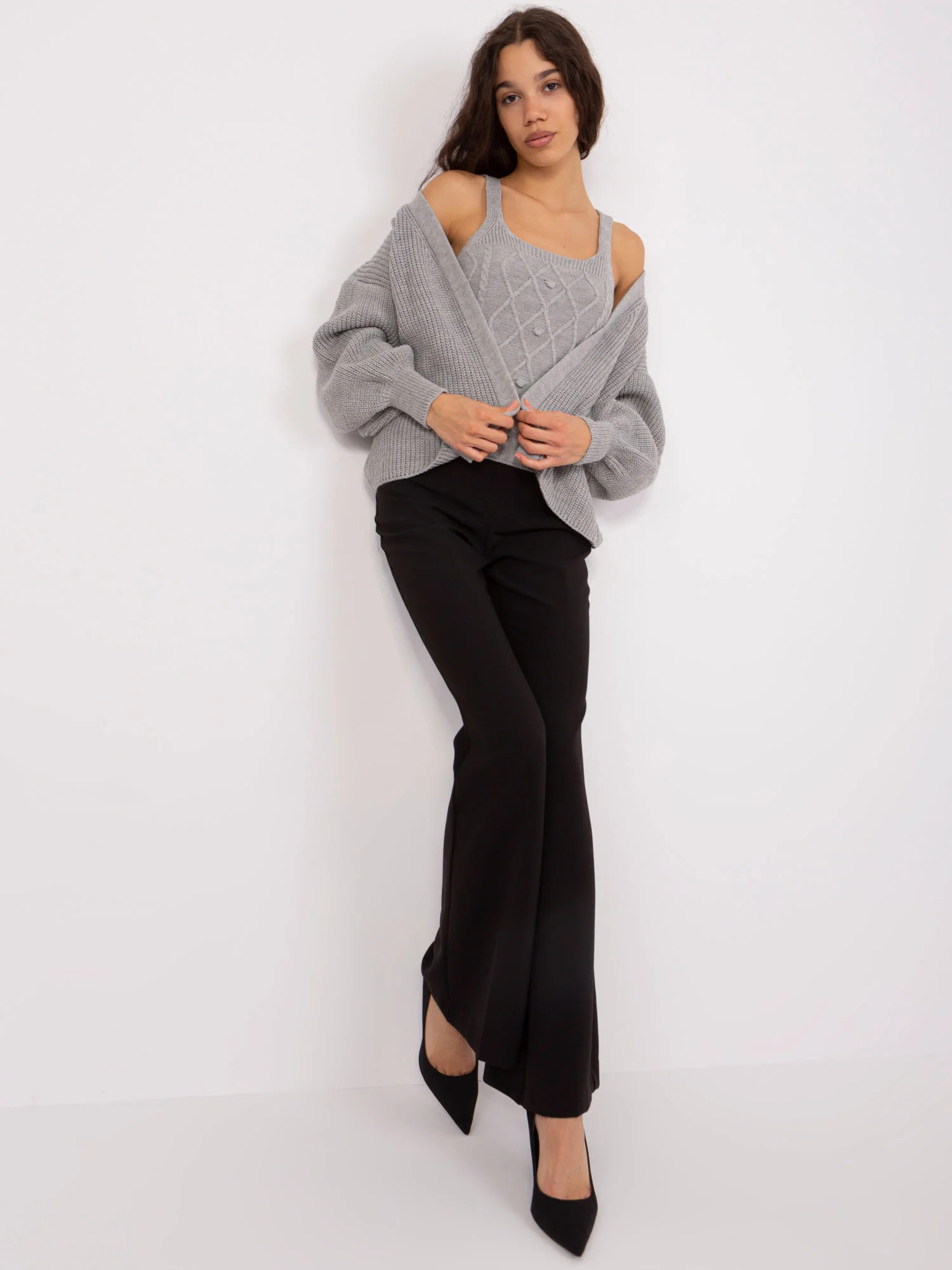 Wymiary kompletu w rozmiarze one size mierzone na płasko: szerokość topu pod pachami - 45 cm, długość topu - 55 cm, szerokość kardiganu pod pachami - 75 cm, długość rękawa - 58 cm, długość kardiganu - 57 cm.