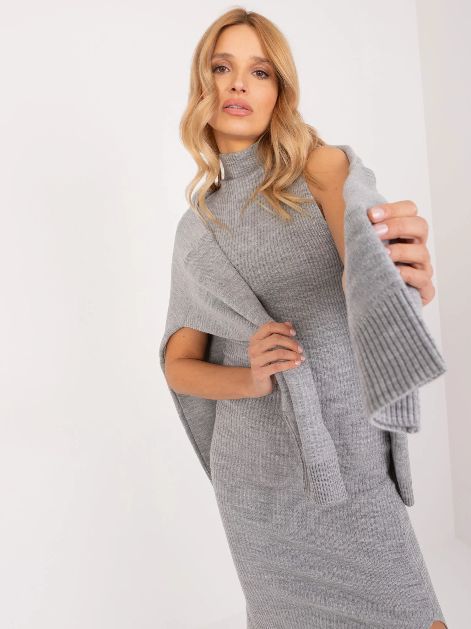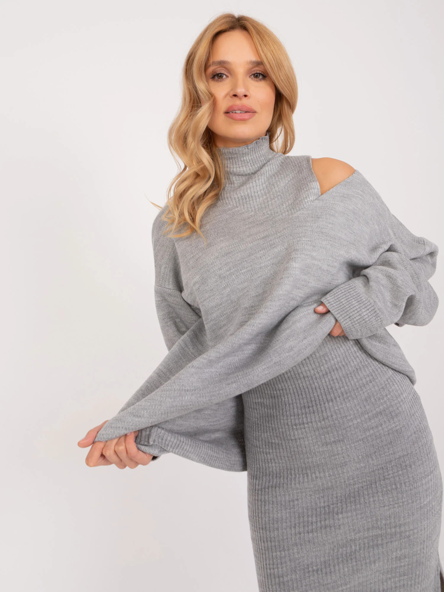 Wymiary kompletu w rozmiarze one size mierzone na płasko: szerokość swetra pod pachami - 72 cm, długość rękawa - 65 cm, długość swetra - 71 cm, szerokość sukienki pod pachami - 40 cm, długość sukienki - 127 cm .
