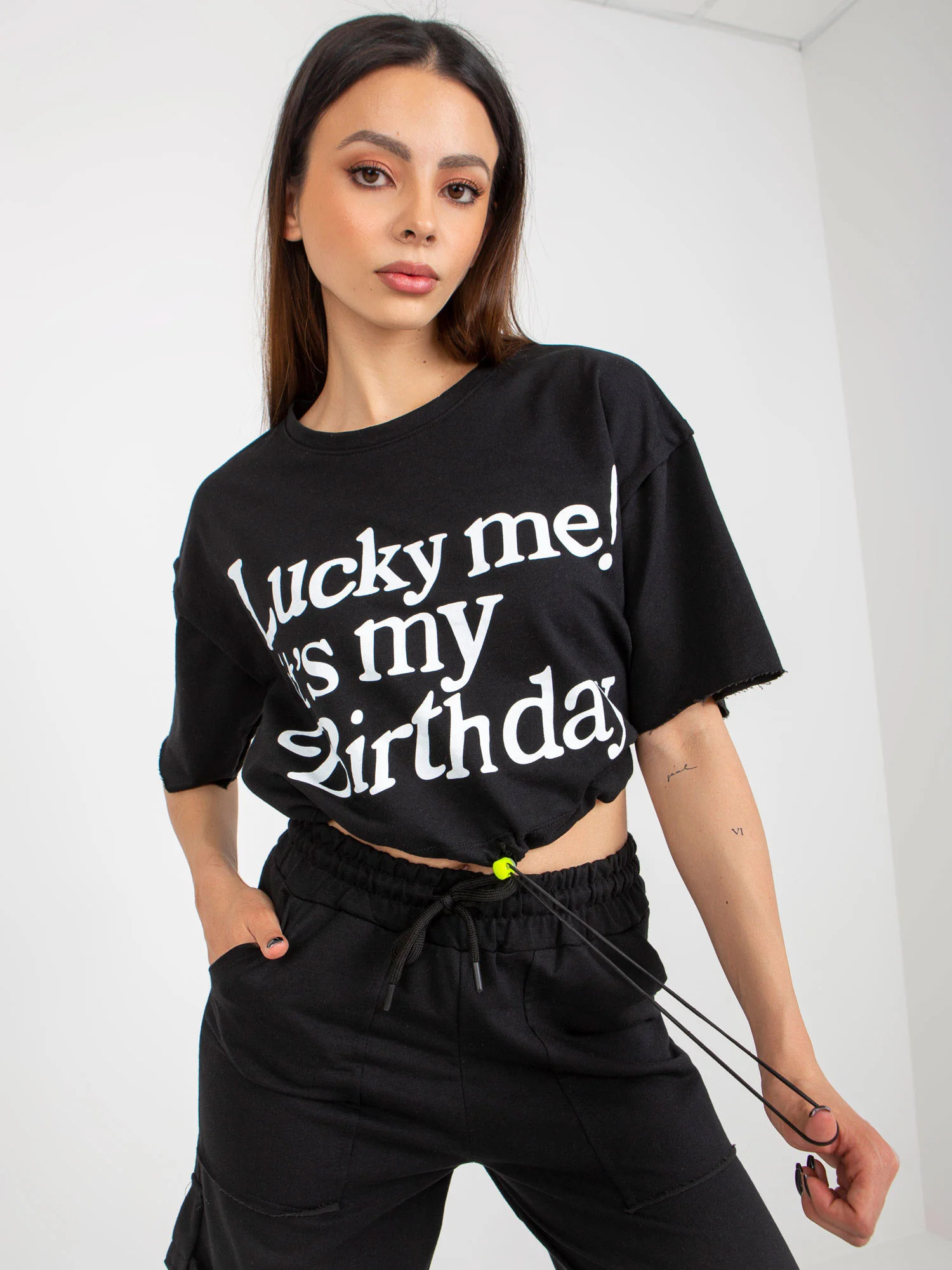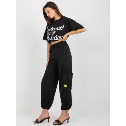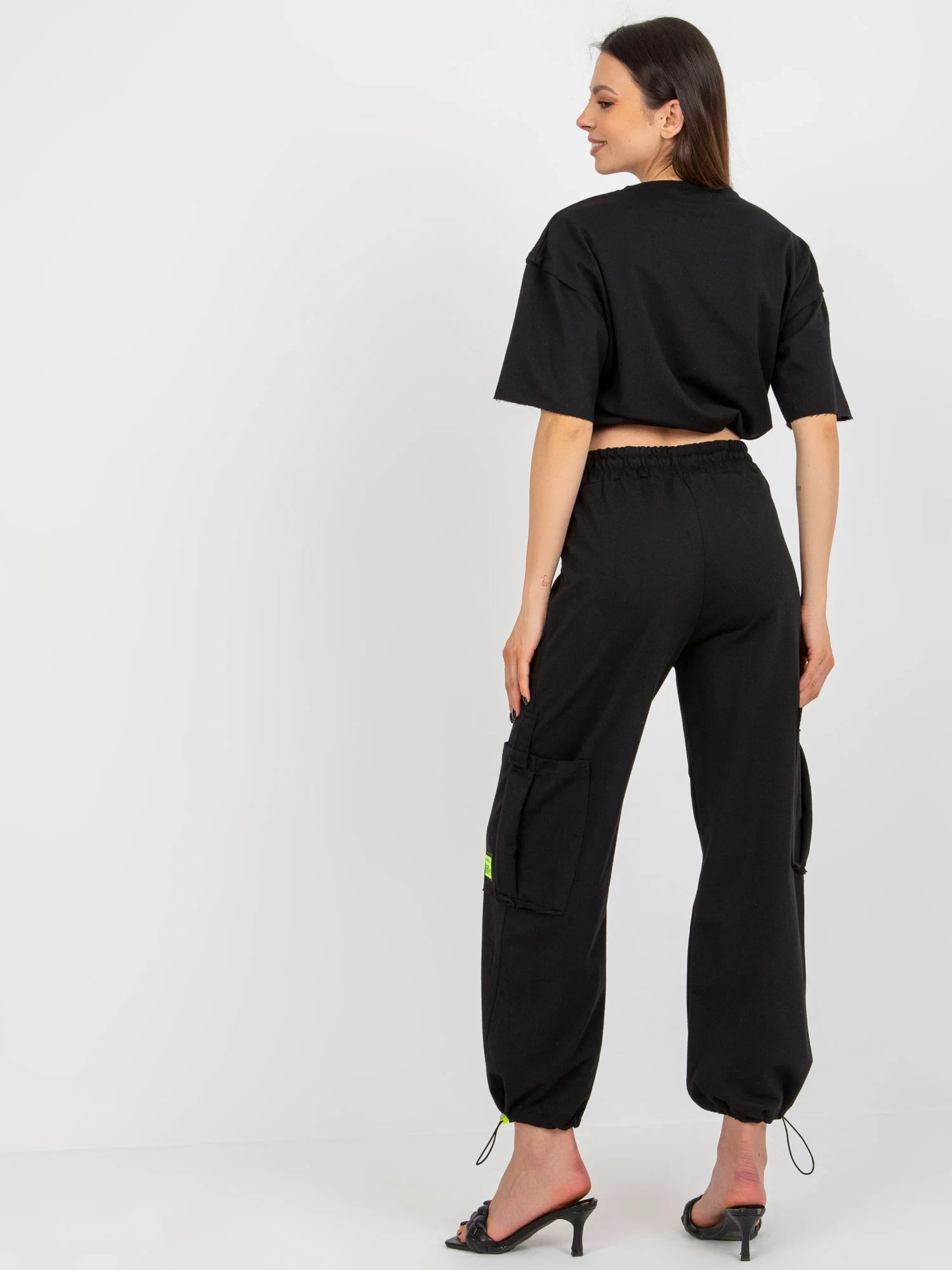 Wymiary kompletu w rozmiarze S mierzone na płasko: szerokość bluzki pod pachami - 57 cm, długość bluzki - 48 cm, szerokość spodni w pasie - 35 cm, wysokość stanu - 33 cm, długość spodni - 99 cm.