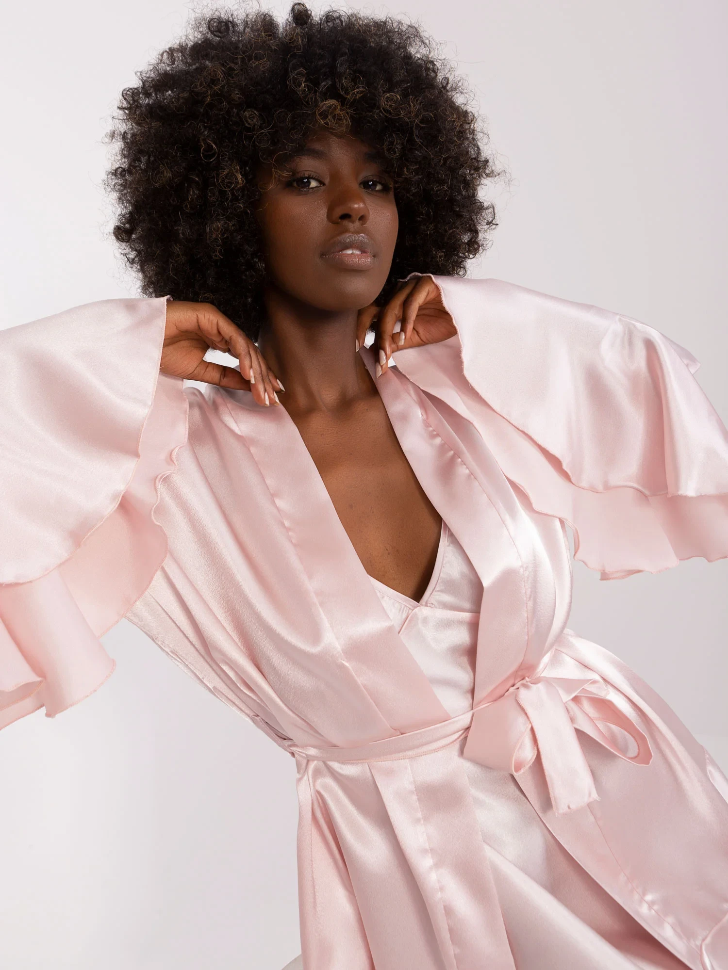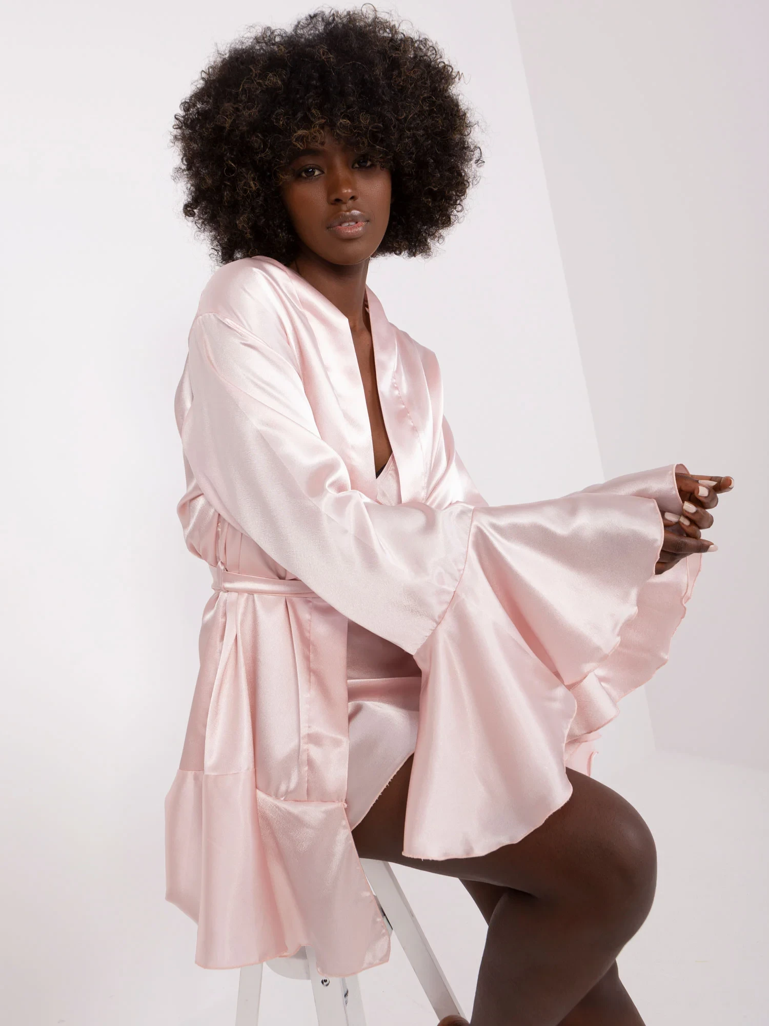 Wymiary kompletu w rozmiarze S mierzone na płasko: szerokość koszuli pod pachami - 42 cm, długość koszuli - 82 cm, szerokość szlafroku pod pachami - 57 cm, długość rękawa - 64 cm, długość szlafroka - 87 cm.