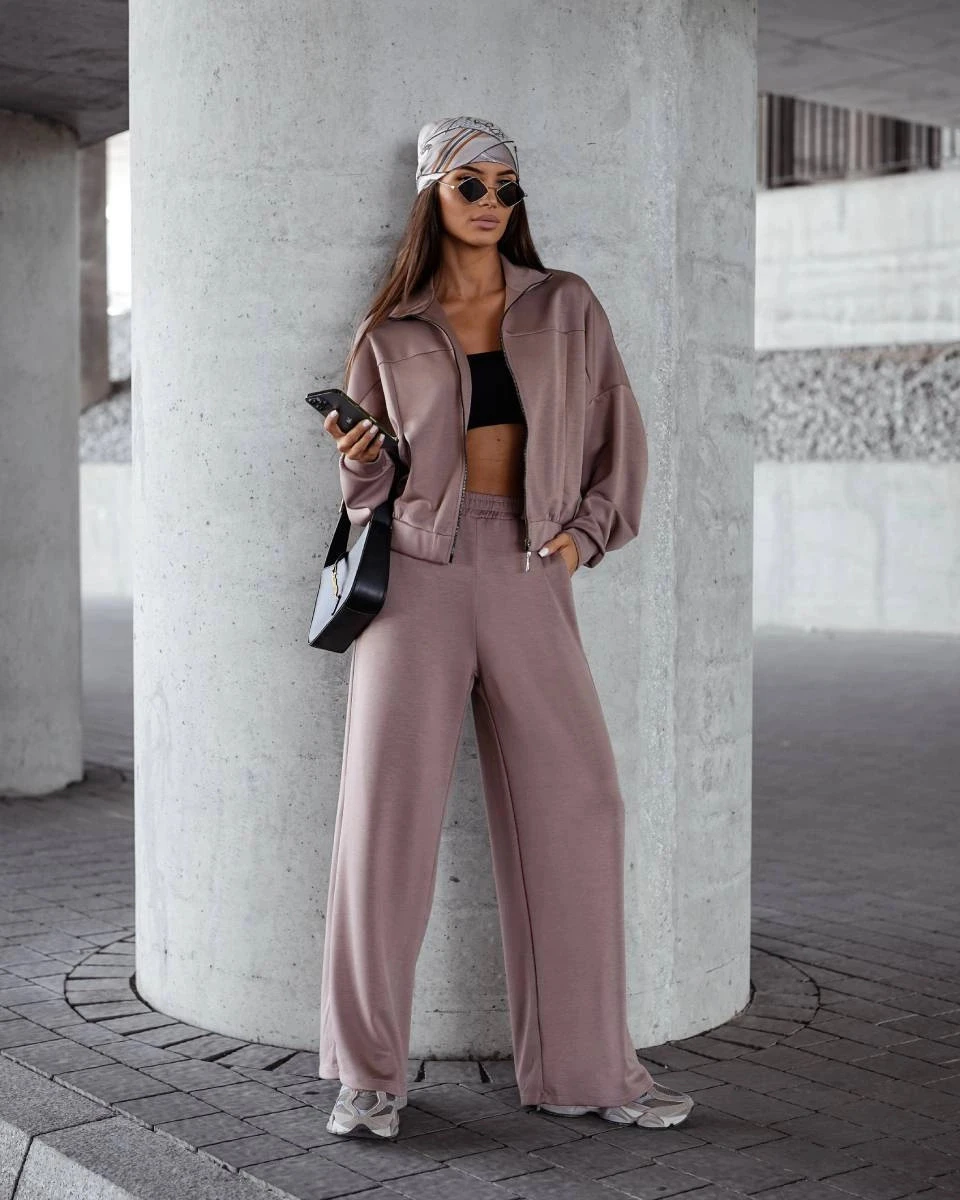 Komplet damski szerokie spodnie i bluza ze stójką cappuccino (821109)