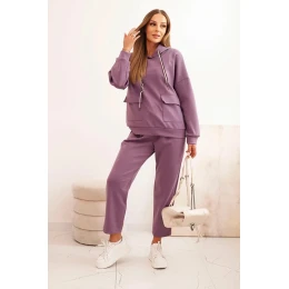 Komplet dámský máslový mikina s kapucí a kalhoty s páskem fialový