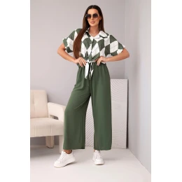 Komplet dámský viskózový košile s vázáním a kalhoty s gumou khaki