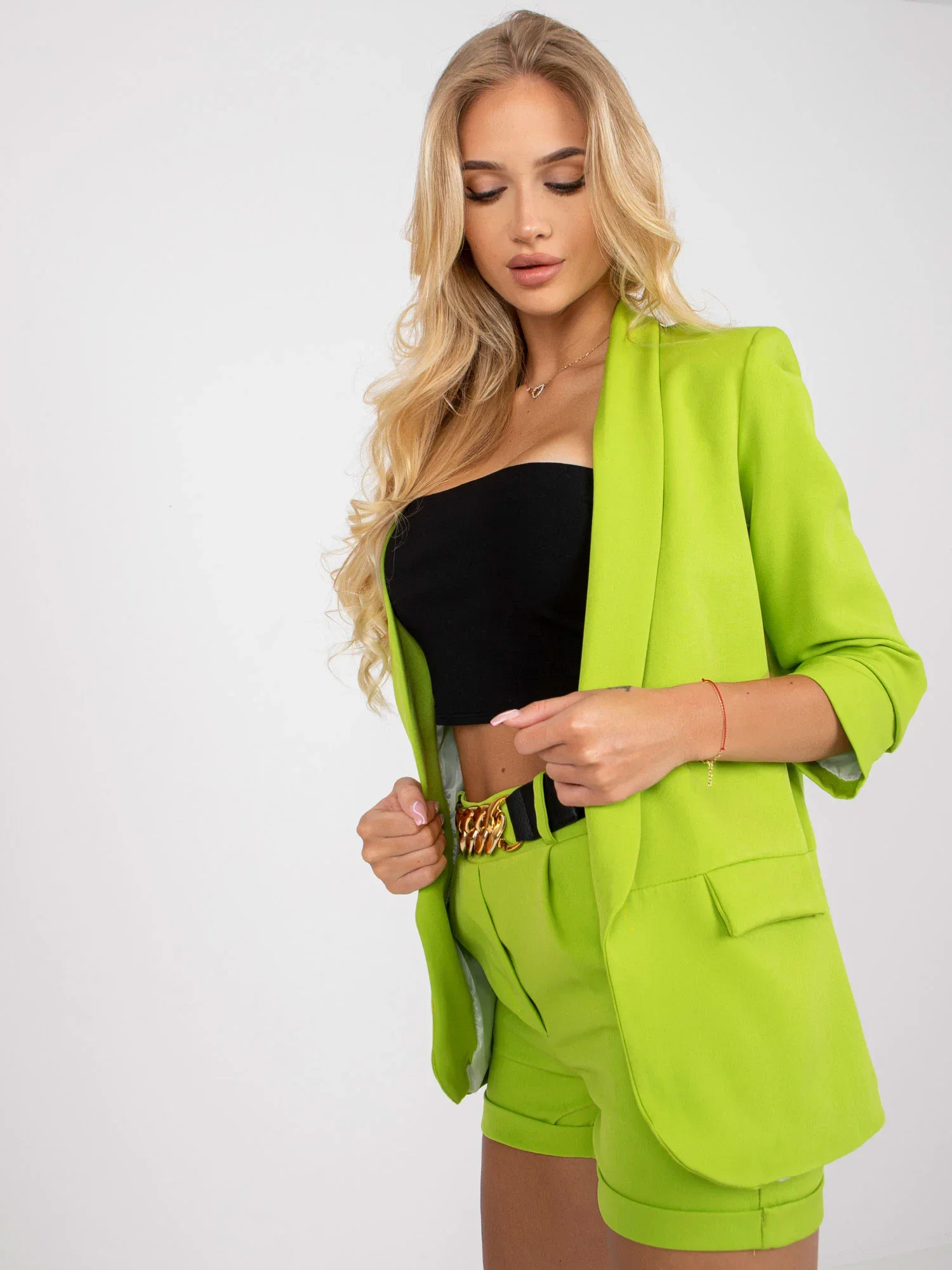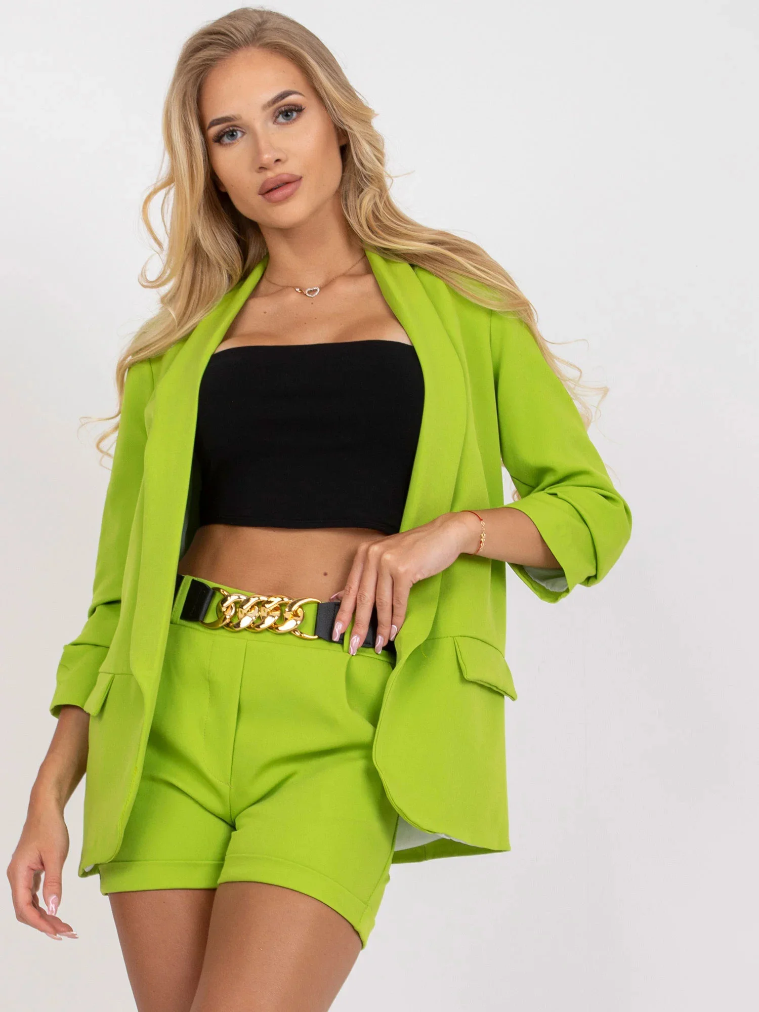 Wymiary kompletu w rozmiarze S mierzone na płasko: szerokość marynarki pod pachami - 48 cm, długość marynarki - 70 cm, długość rękawa - 47 cm, szerokość szortów w pasie - 33 cm, długość szortów - 38 cm.