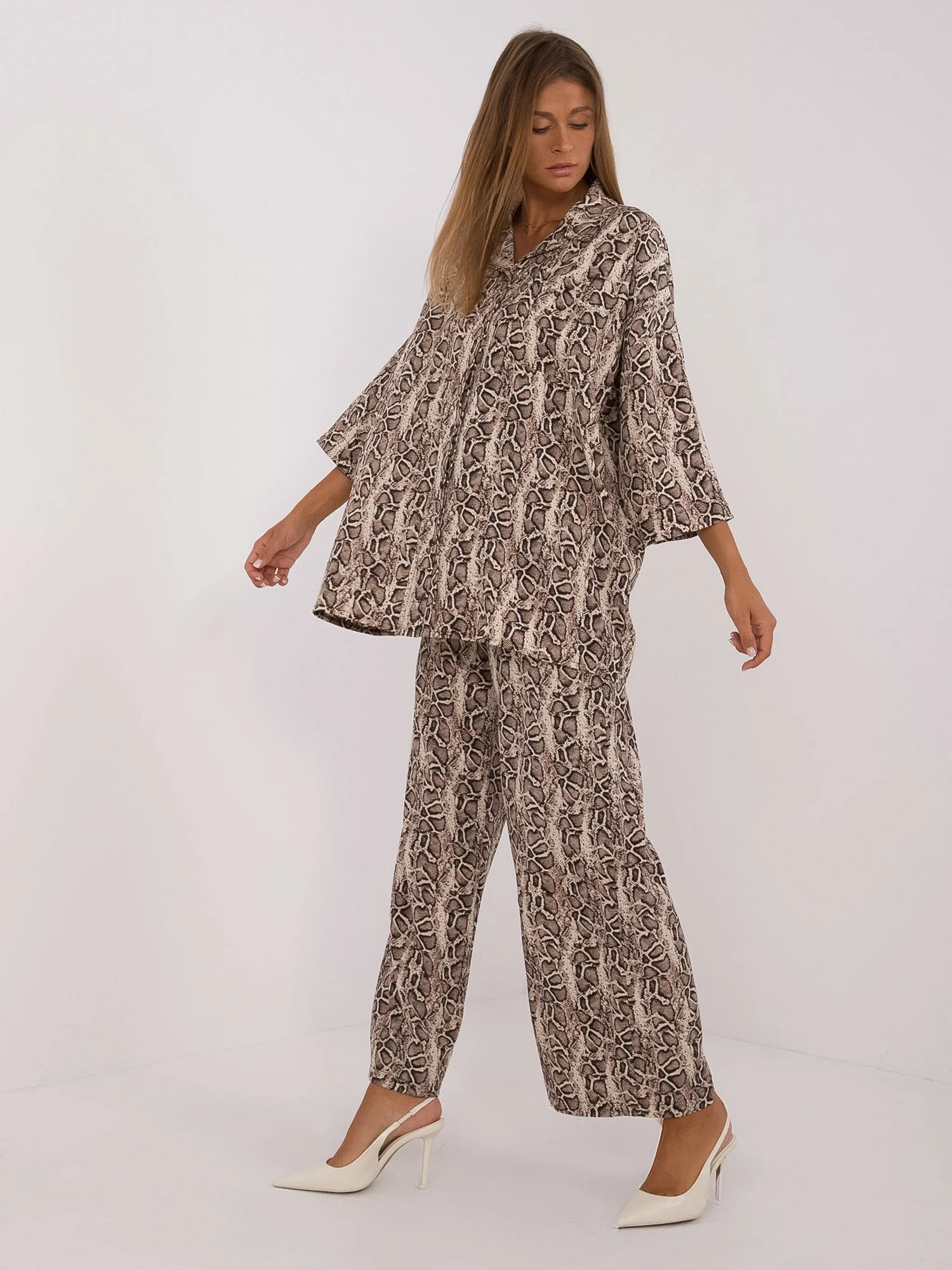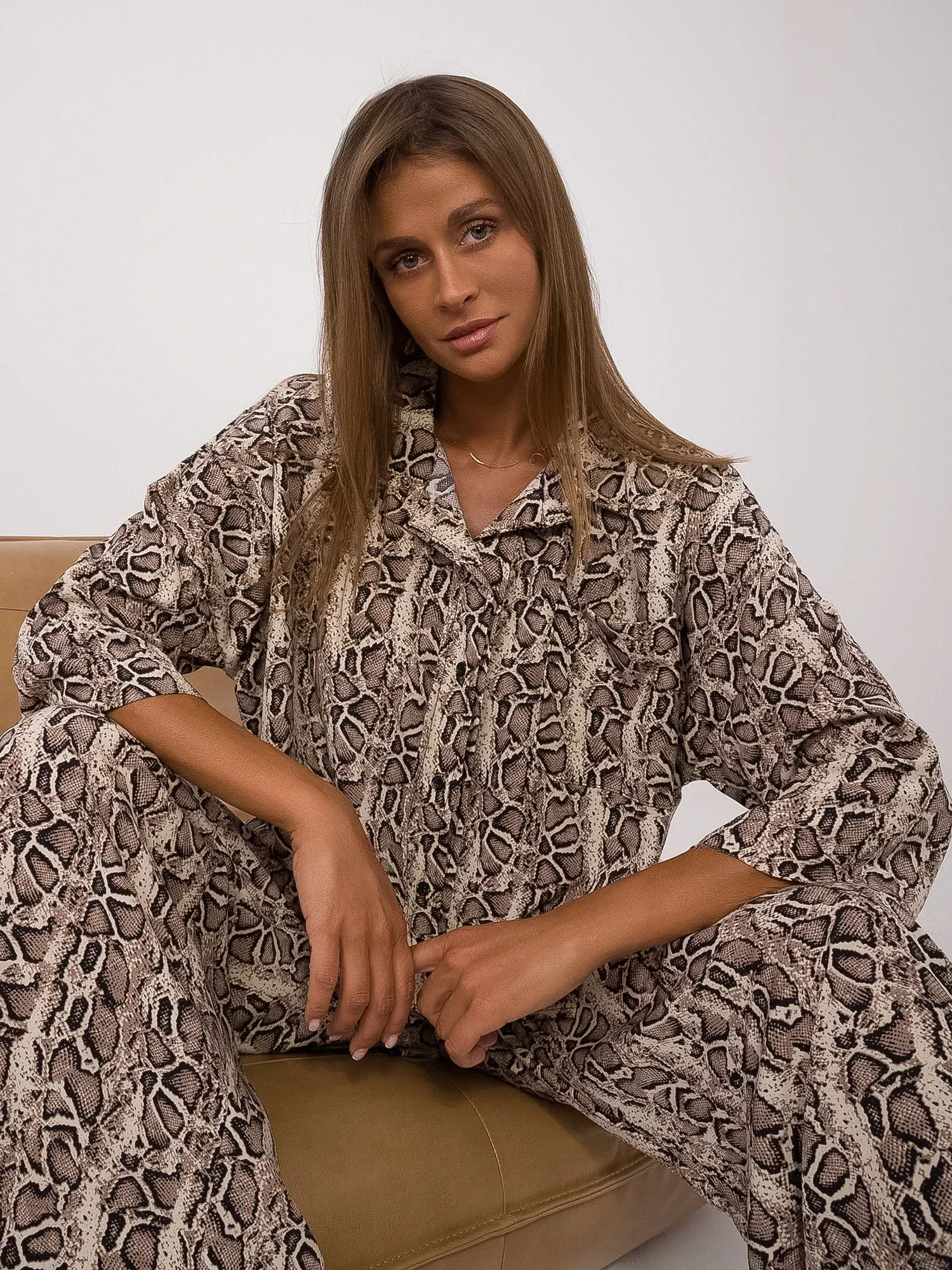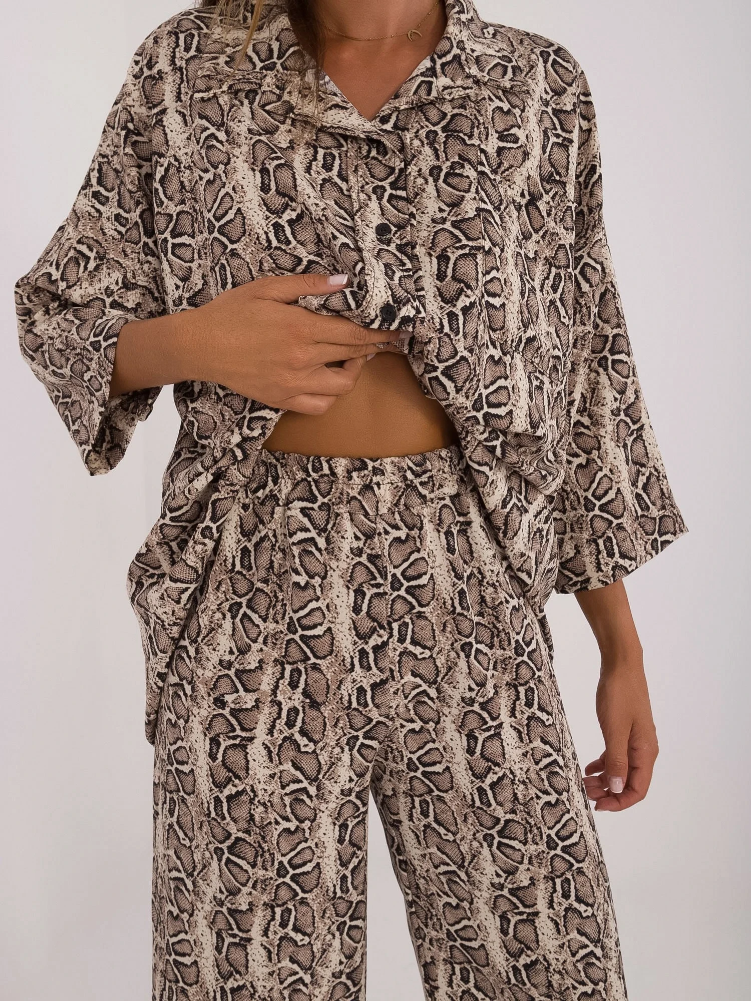 Wymiary kompletu w rozmiarze S/M. mierzone na płasko: szerokość koszuli pod pachami - 70 cm, długość rękawa - 47 cm, długość koszuli - 75 cm, szerokość spodni w pasie - 34 cm, długość spodni - 100 cm.