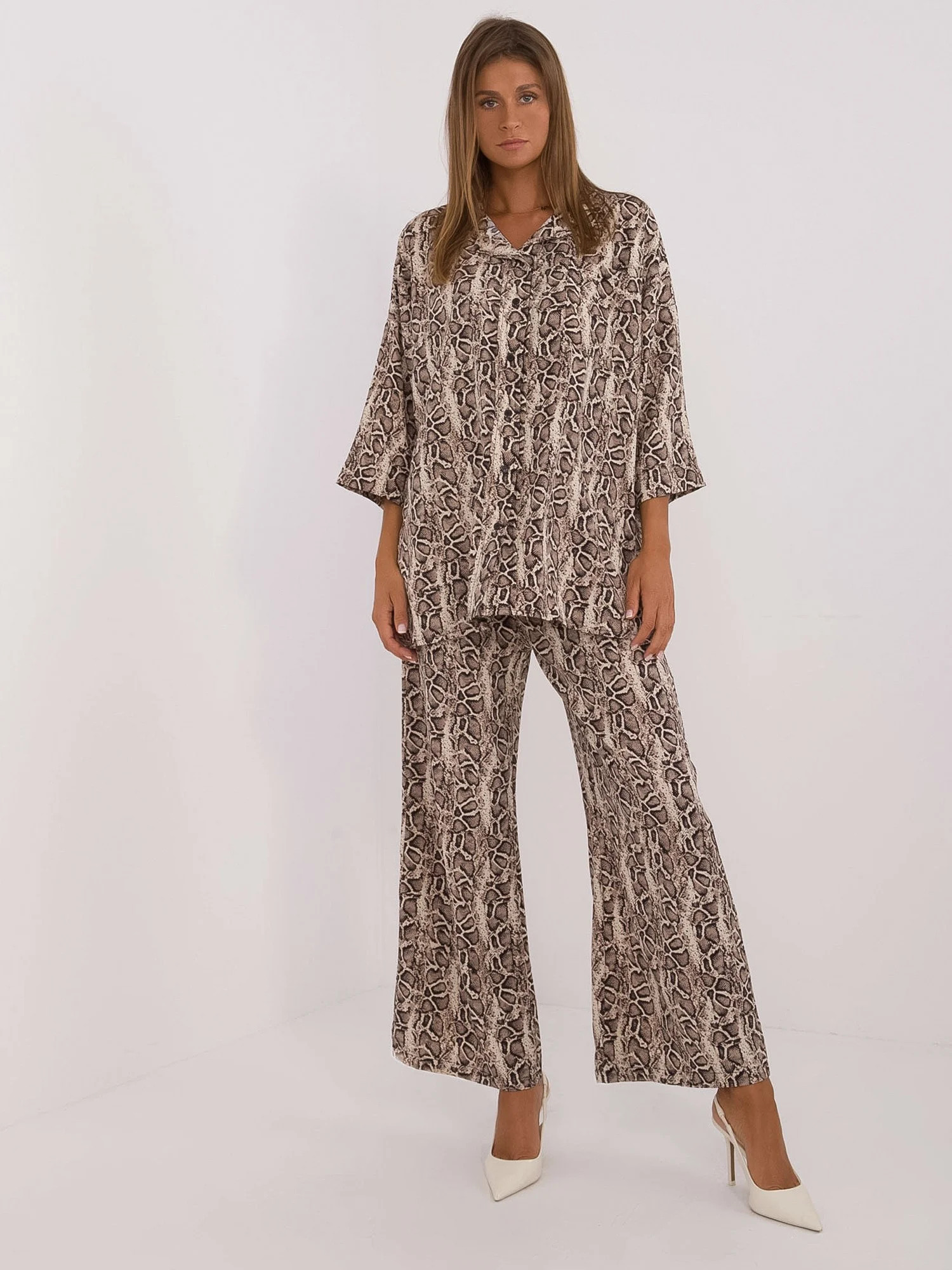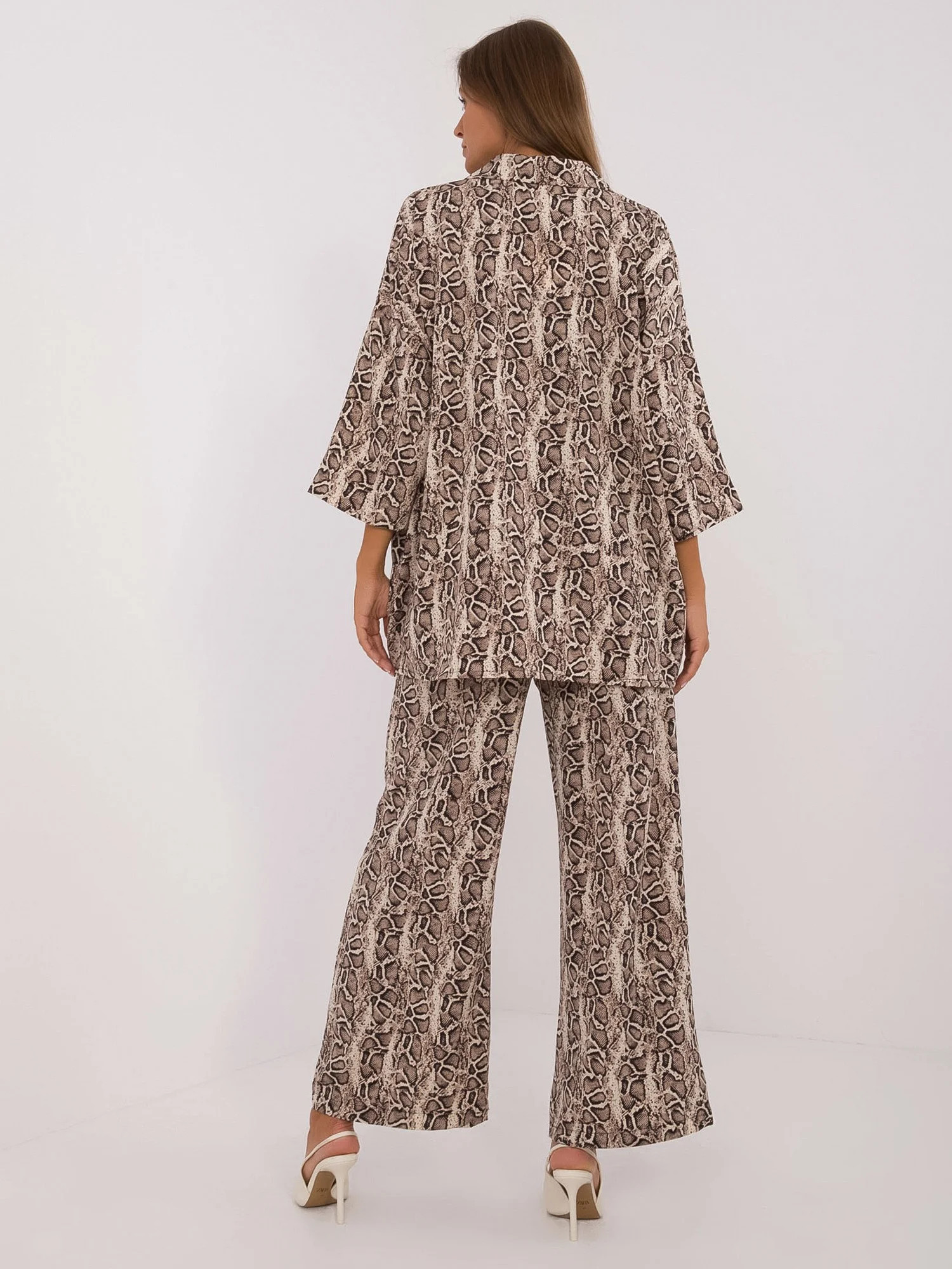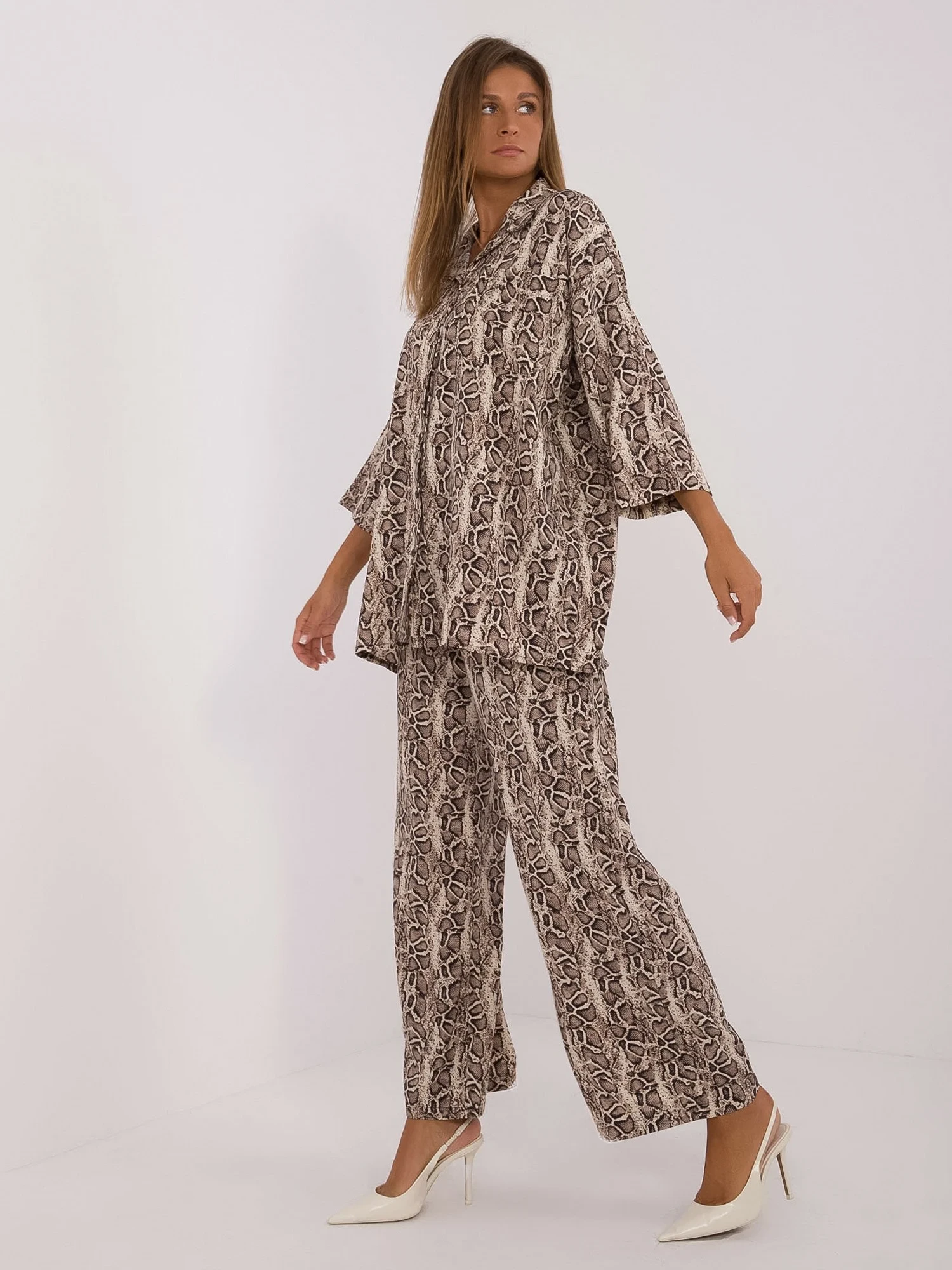 Wymiary kompletu w rozmiarze S/M. mierzone na płasko: szerokość koszuli pod pachami - 70 cm, długość rękawa - 47 cm, długość koszuli - 75 cm, szerokość spodni w pasie - 34 cm, długość spodni - 100 cm.