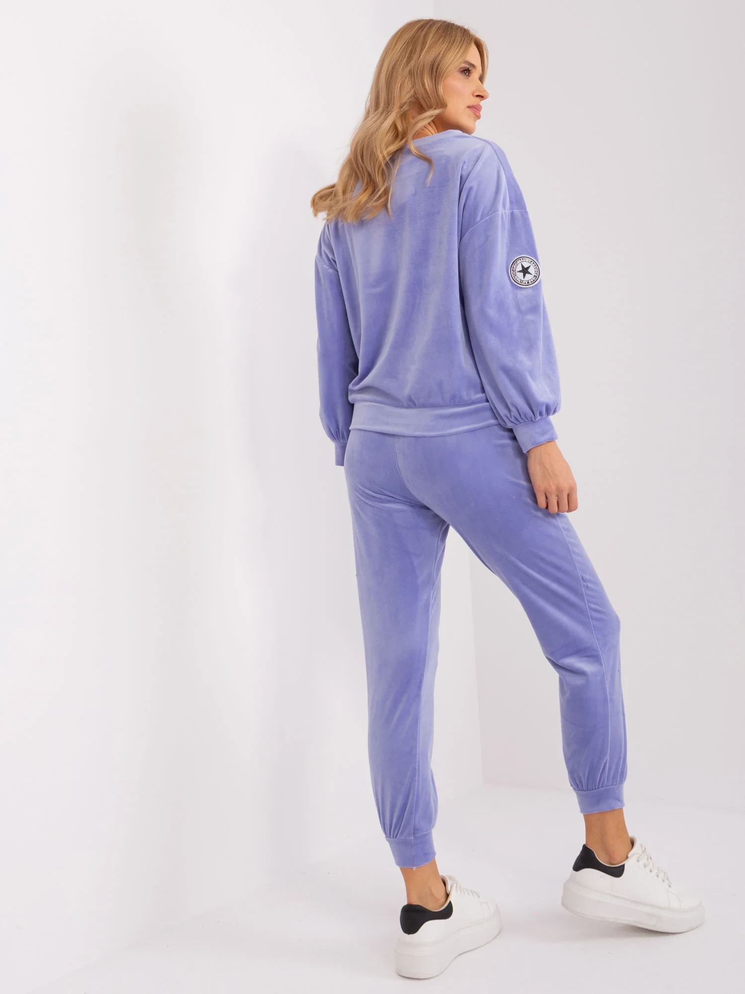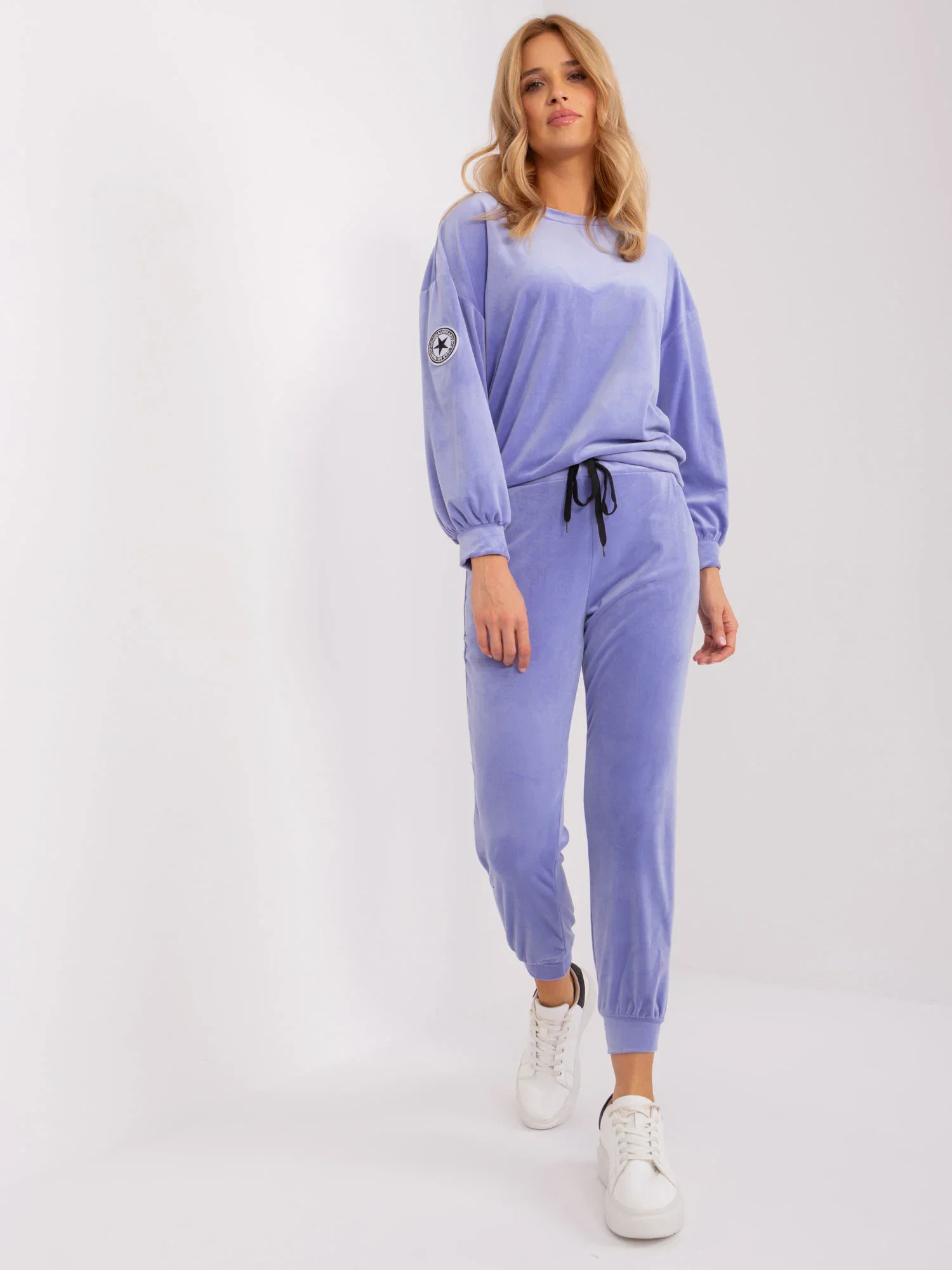 Wymiary kompletu w rozmiarze one size mierzone na płasko: szerokość pod pachami - 55 cm, długość rękawa - 52 cm, długość bluzy - 60 cm, szerokość w pasie - 37 cm, długość spodni - 94 cm.