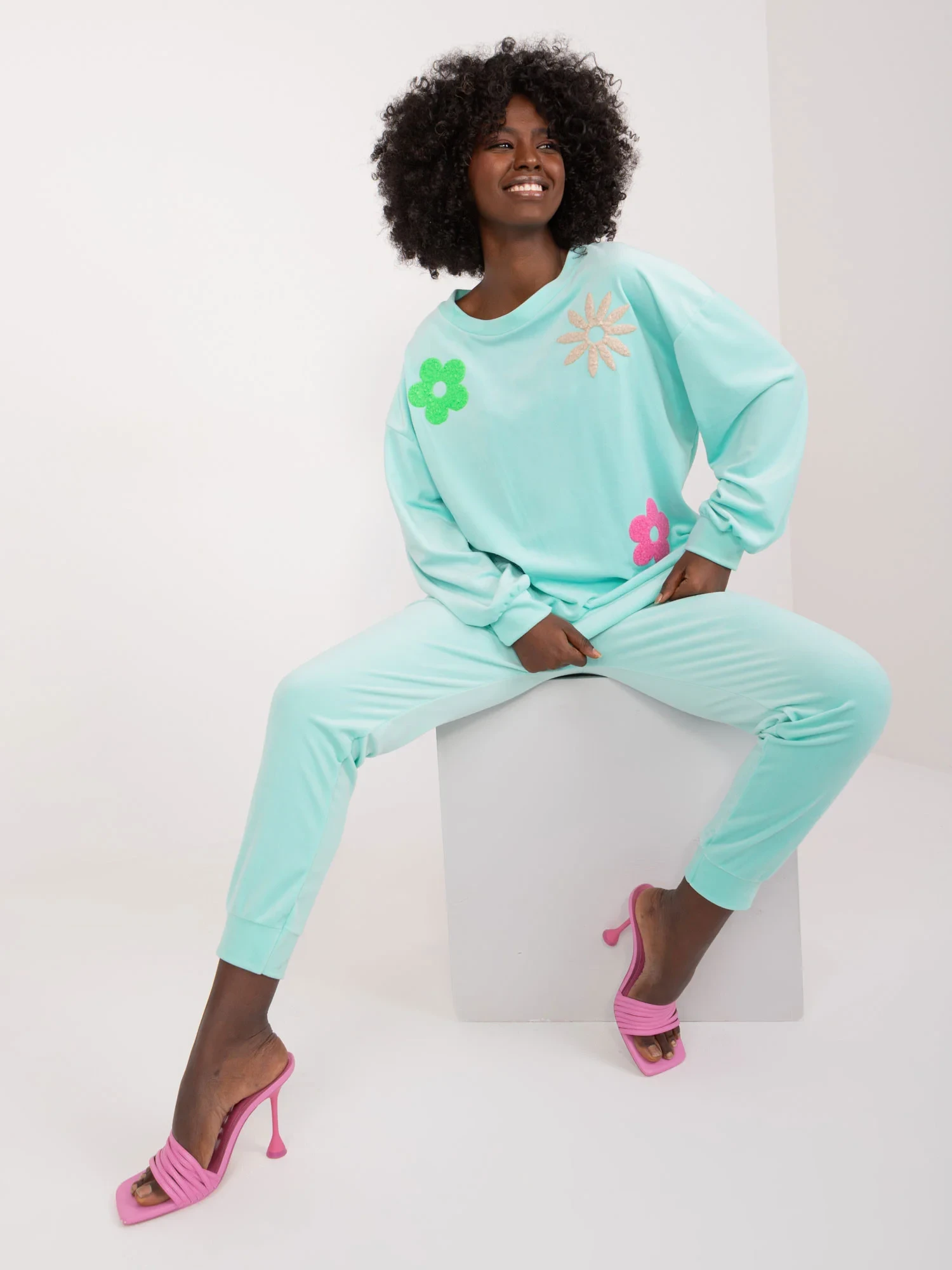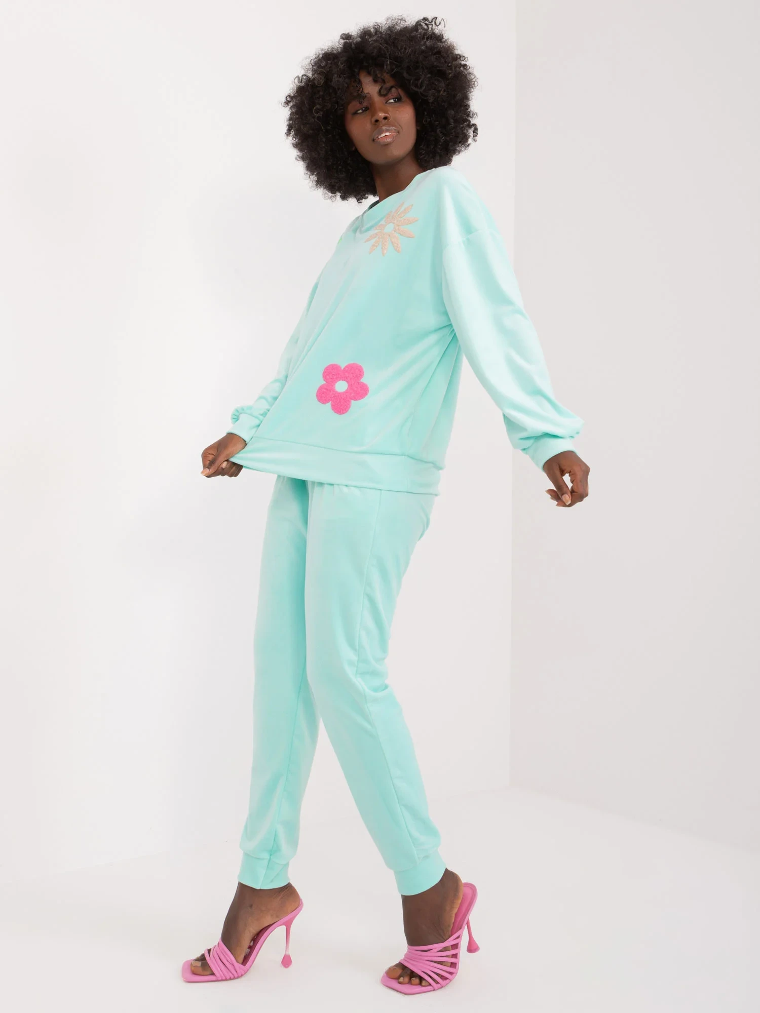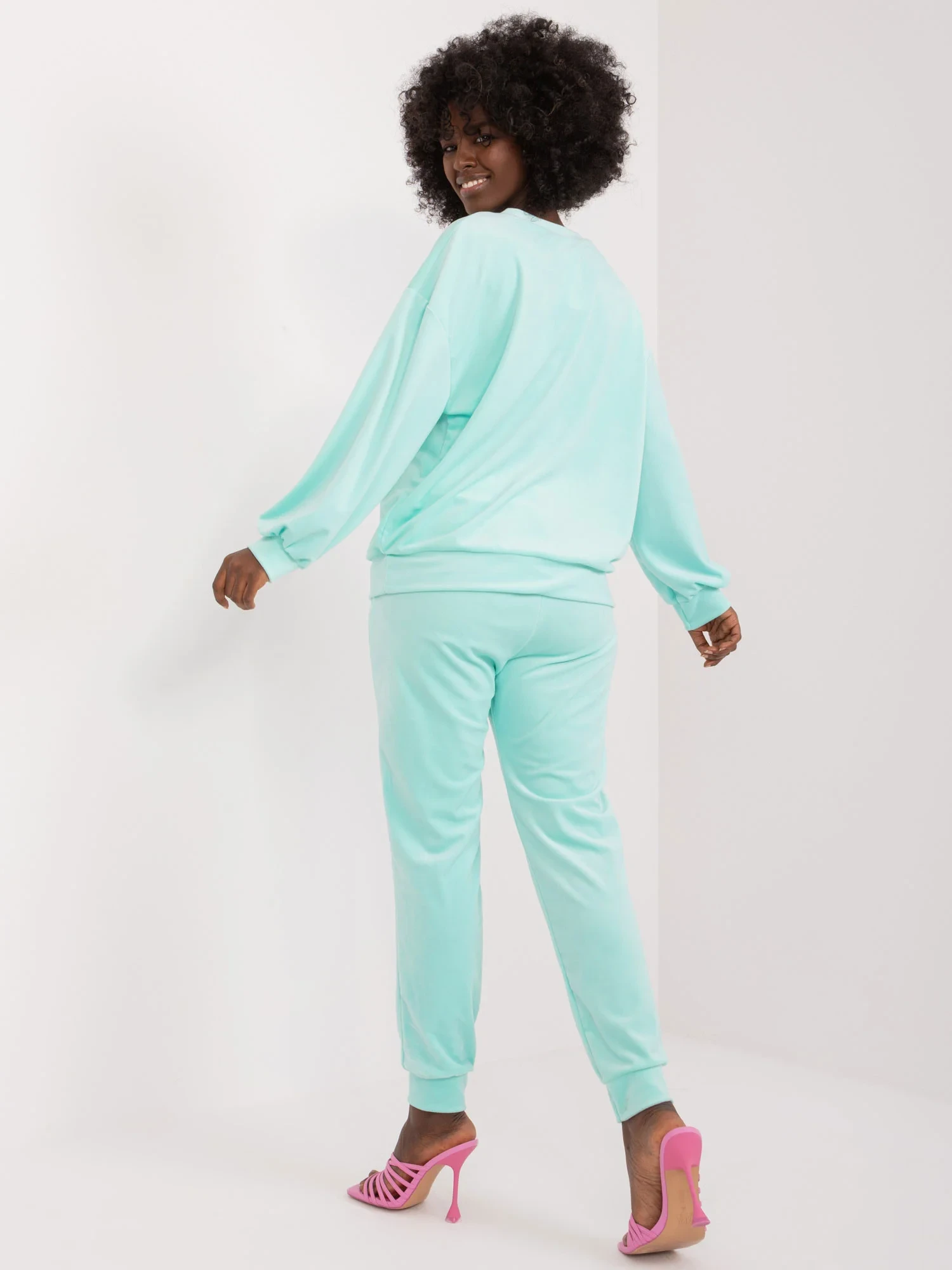 Wymiary kompletu w rozmiarze one size mierzone na płasko: szerokość bluzy pod pachami - 57 cm, długość bluzy - 57 cm, długość rękawa - 53 cm, szerokość w pasie - 37 cm, długość spodni - 95 cm, wysokość w pasie - 31 cm
