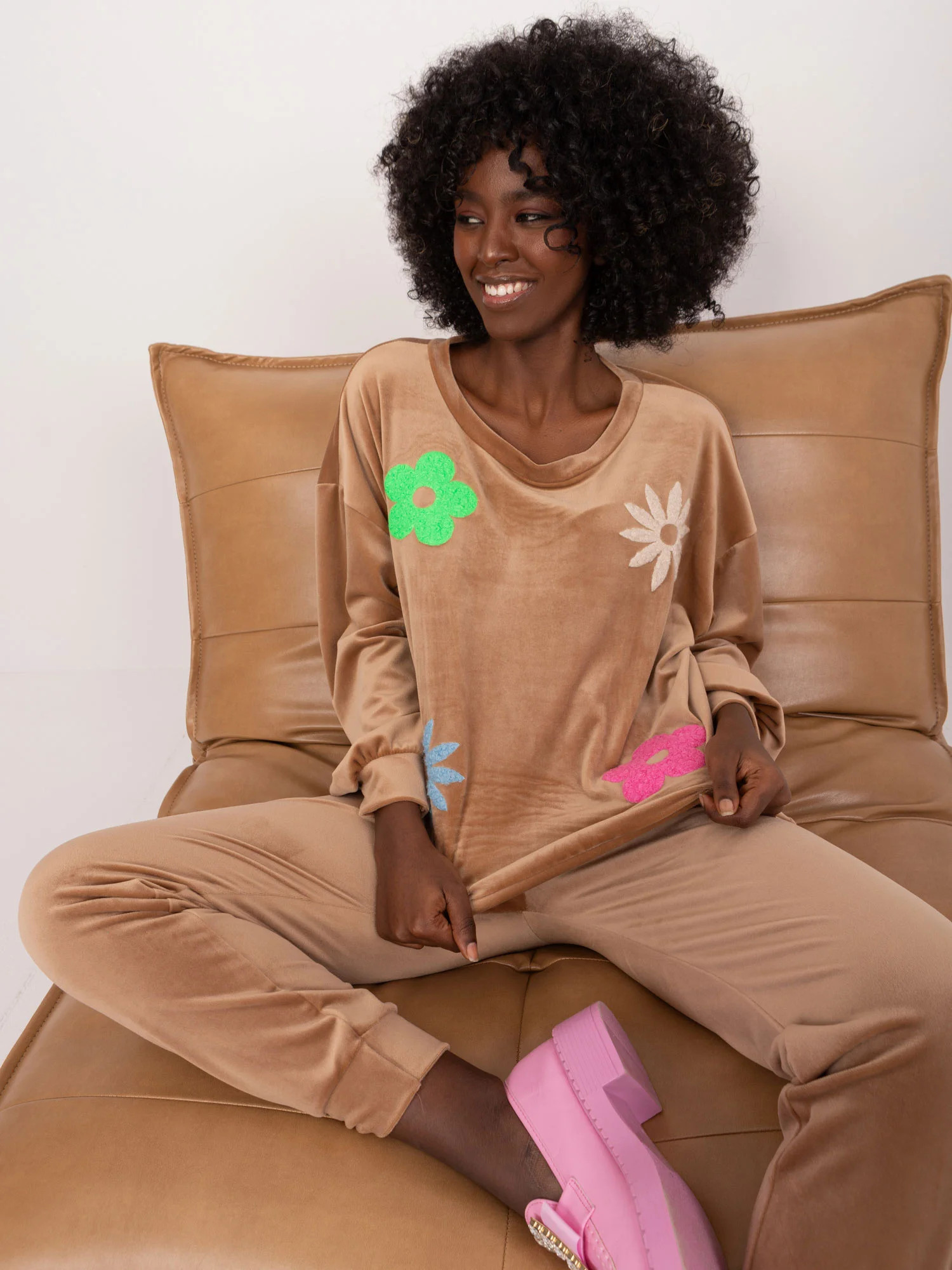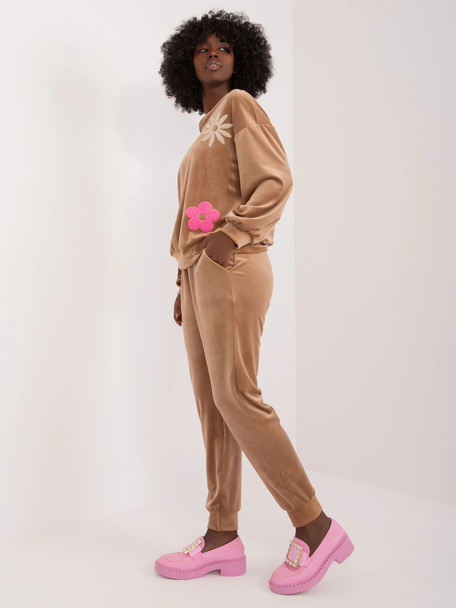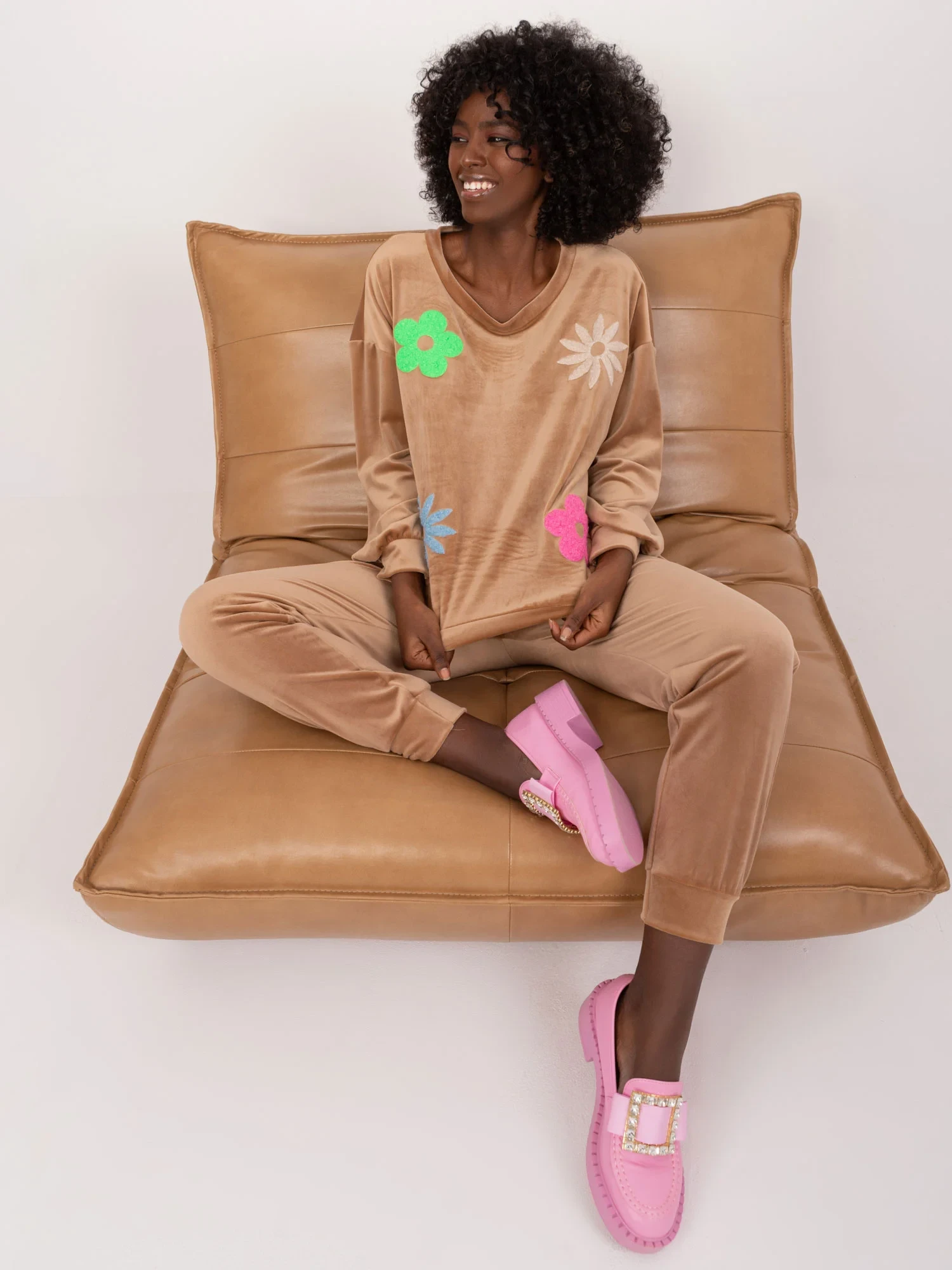 Wymiary kompletu w rozmiarze one size mierzone na płasko: szerokość bluzy pod pachami - 57 cm, długość bluzy - 57 cm, długość rękawa - 53 cm, szerokość w pasie - 37 cm, długość spodni - 95 cm, wysokość w pasie - 31 cm