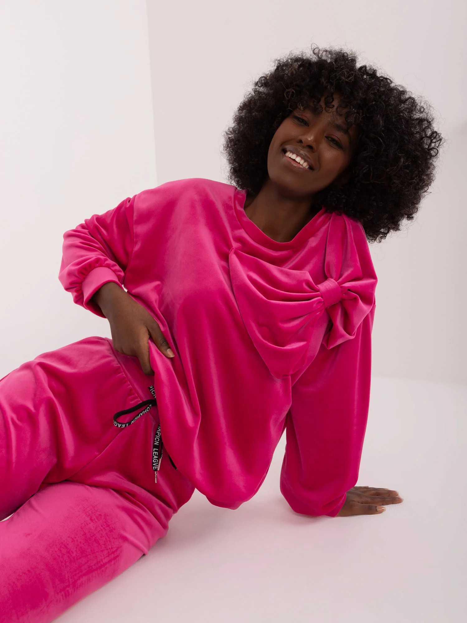 Wymiary kompletu w rozmiarze one size mierzone na płasko: szerokość bluzy pod pachami - 56 cm, długość bluzy - 62 cm, długość rękawa - 56 cm, szerokość w pasie - 37 cm, długość spodni - 94 cm, wysokość w pasie - 30 cm