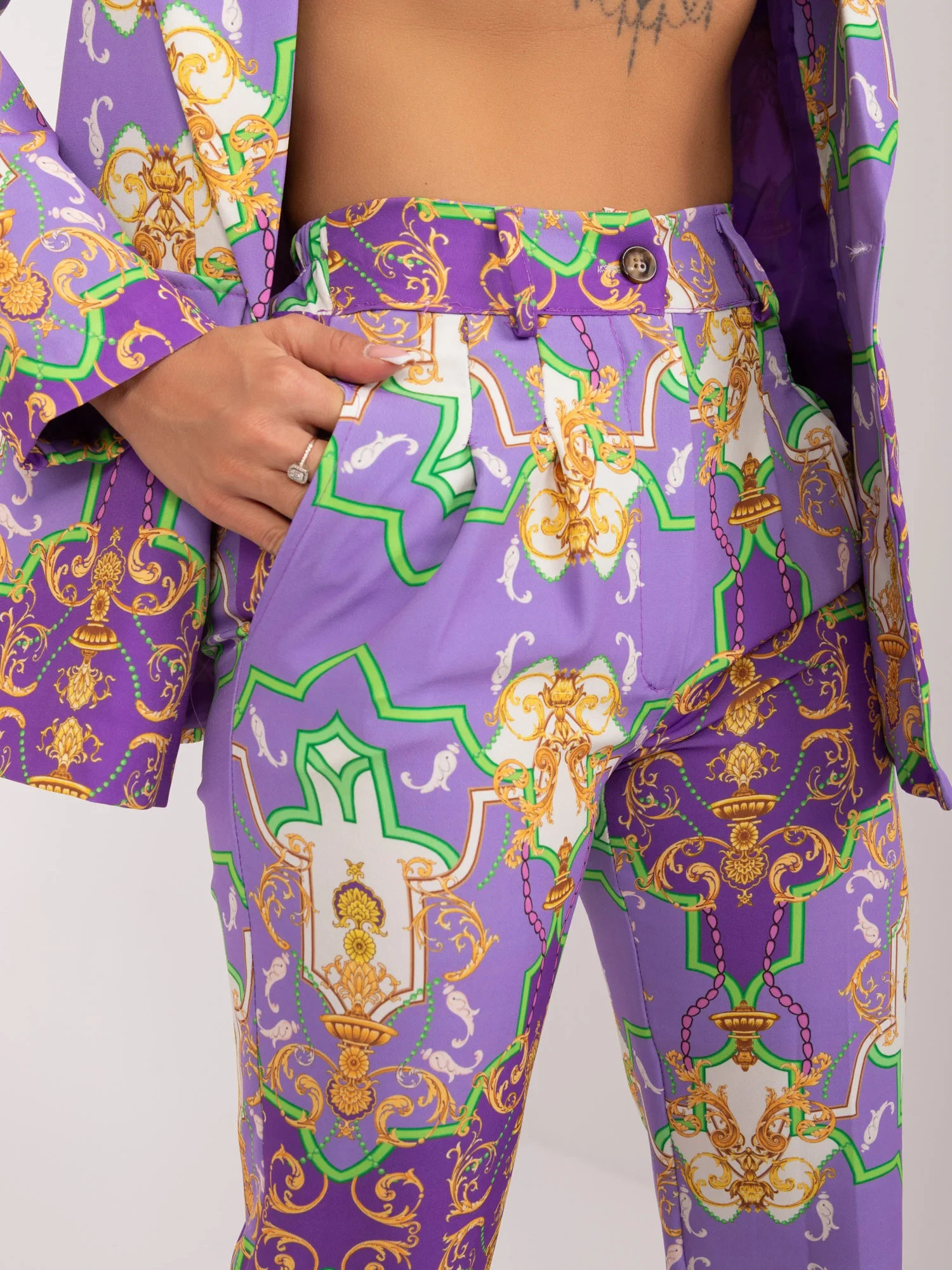 Wymiary kompletu w rozmiarze S mierzone na płasko: szerokość marynarki pod pachami - 48 cm, długość rękawa - 57 cm, długość marynarki - 66 cm, szerokość spodni w pasie- 31 cm, wysokość stanu - 29 cm, długość spodni- 97 cm .