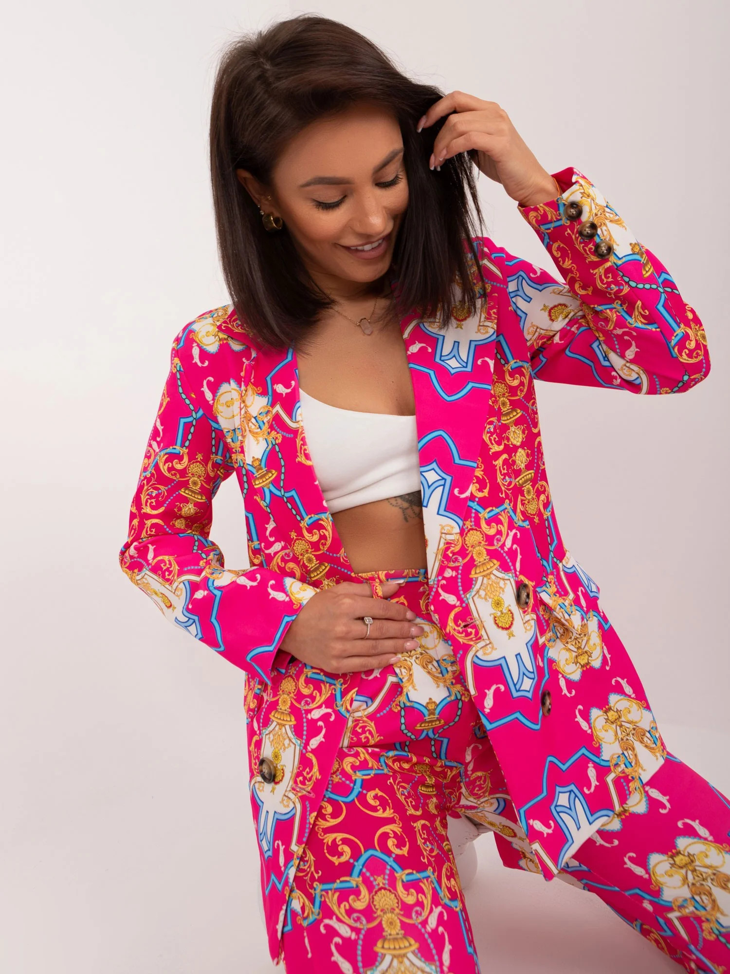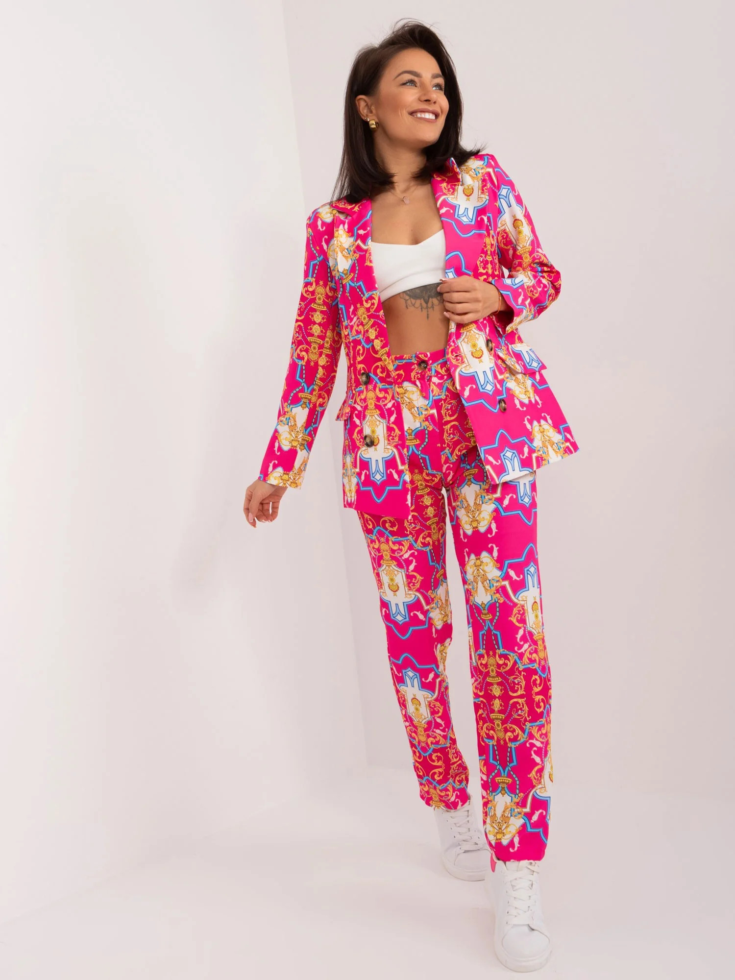 Wymiary kompletu w rozmiarze S mierzone na płasko: szerokość marynarki pod pachami - 48 cm, długość rękawa - 57 cm, długość marynarki - 66 cm, szerokość spodni w pasie- 31 cm, wysokość stanu - 29 cm, długość spodni- 97 cm .