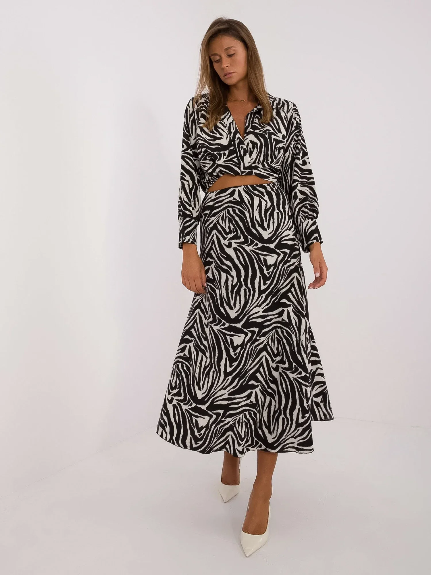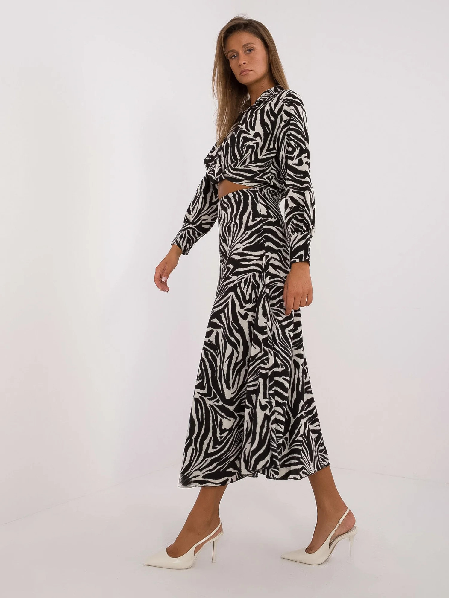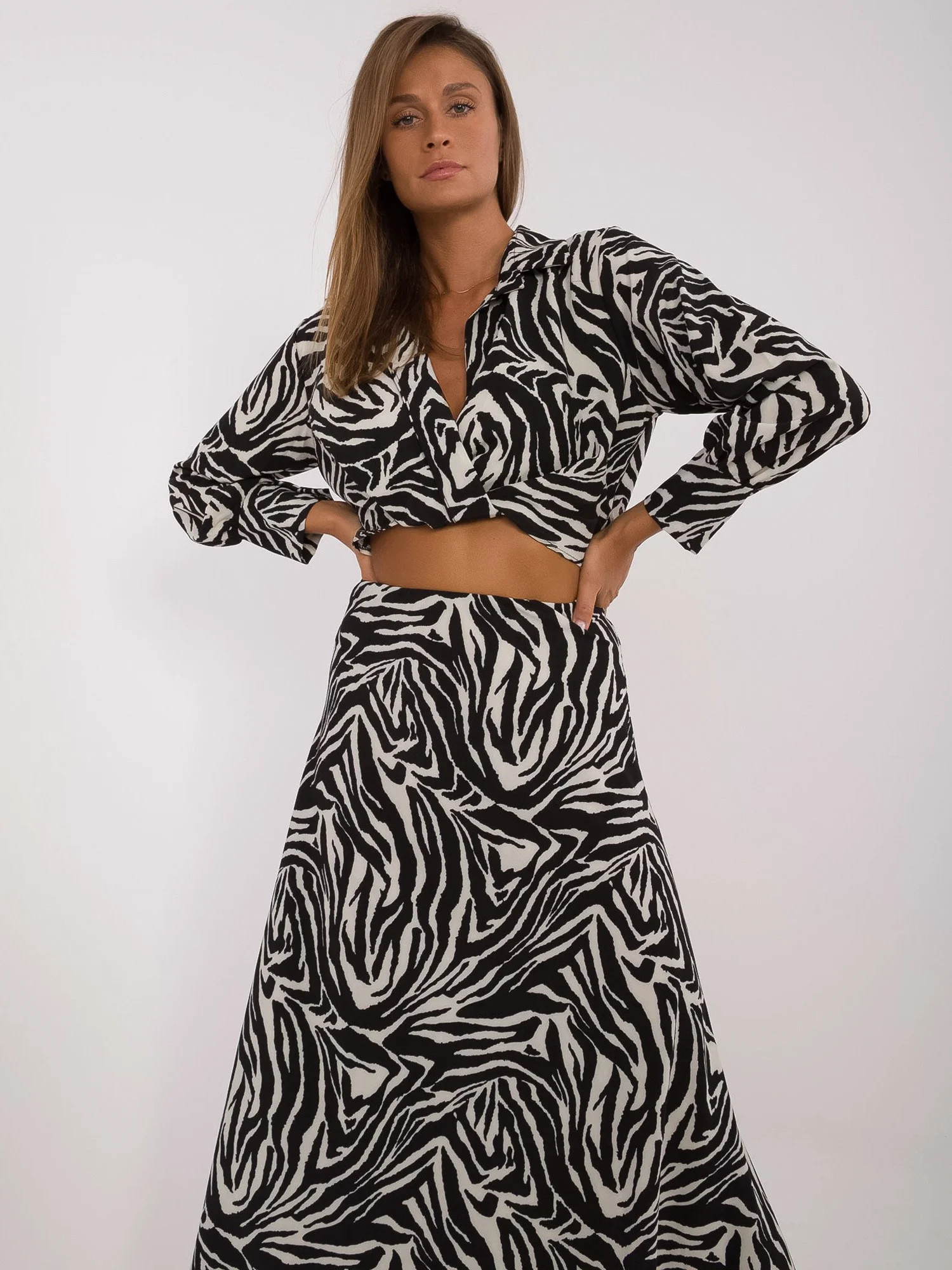 Wymiary kompletu w rozmiarze one size mierzone na płasko: szerokość bluzki pod pachami - 51 cm, długość bluzki - 40 cm, długość rękawa - 55 cm, szerokość spódnicy w pasie - 38 cm, długość spódnicy - 91 cm.
