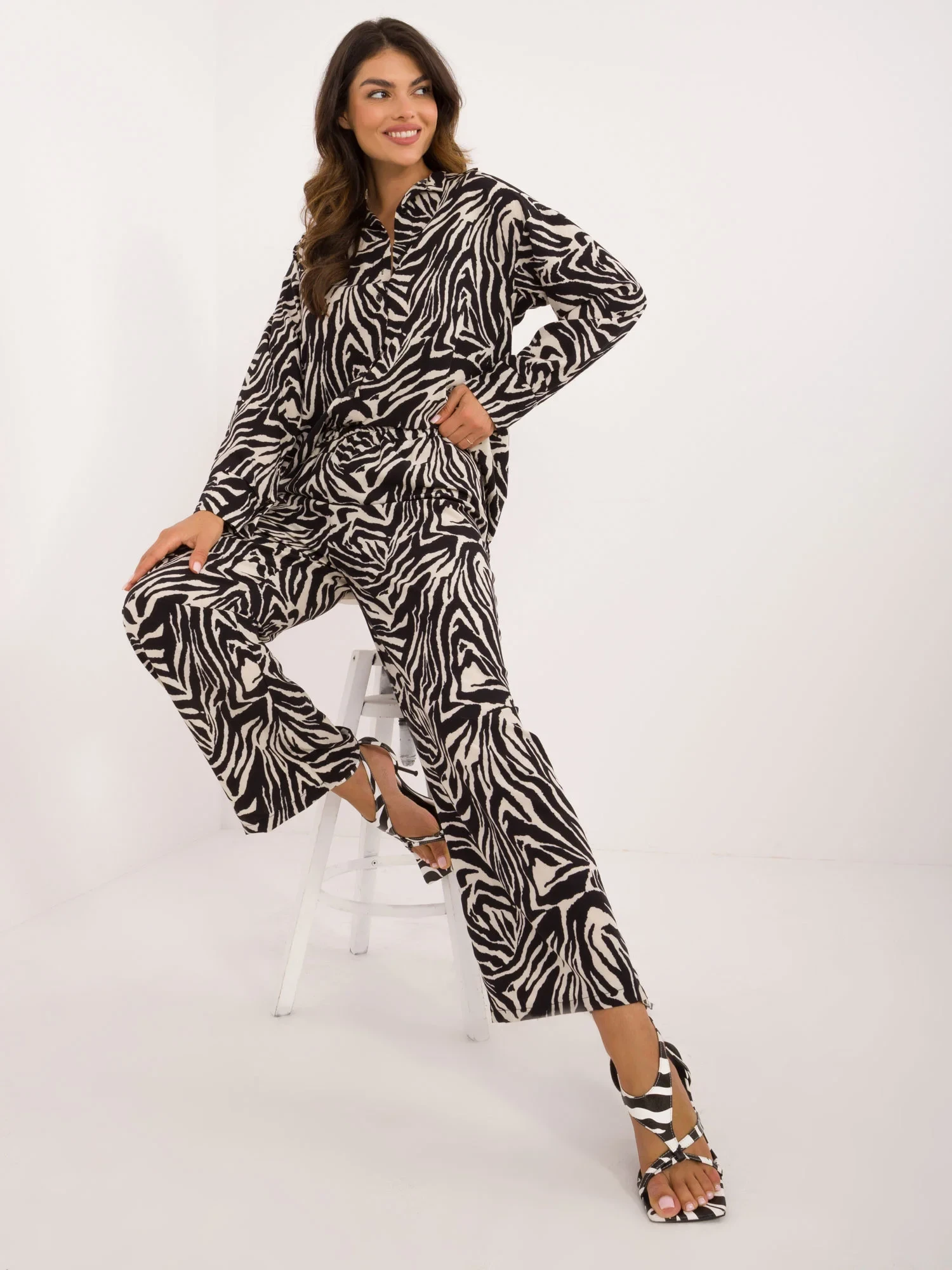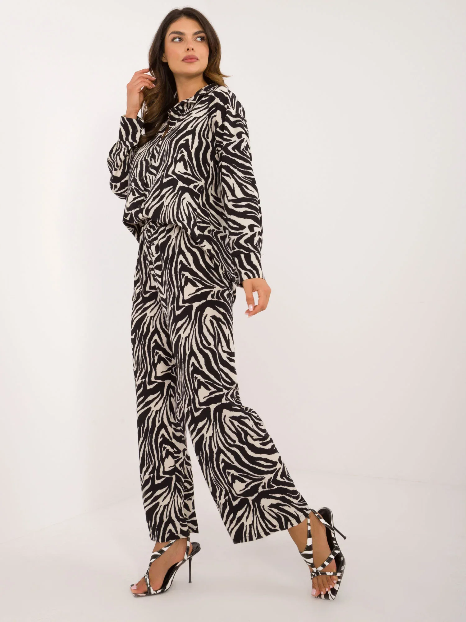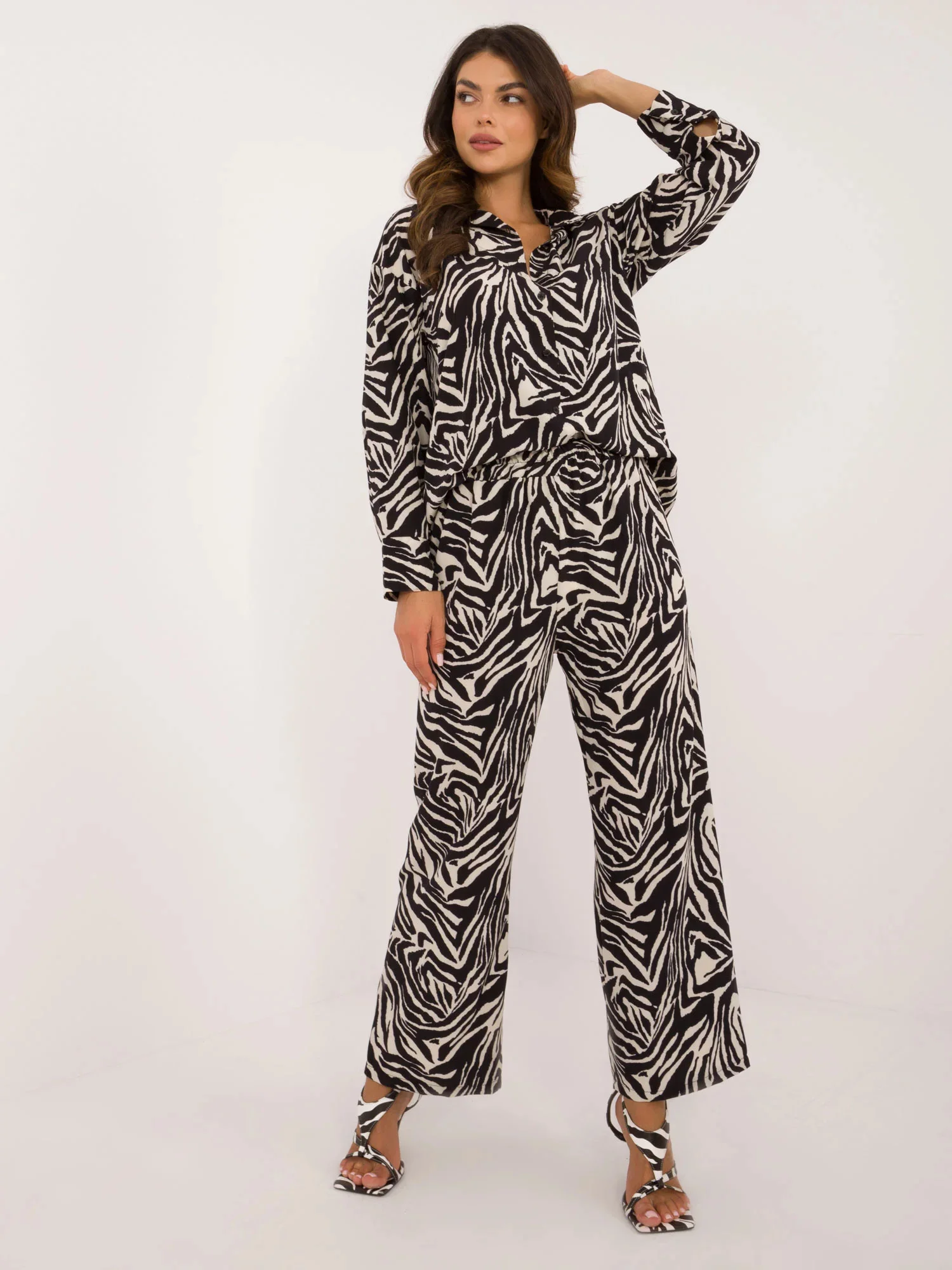 Wymiary kompletu w rozmiarze one size mierzone na płasko: szerokość koszuli pod pachami - 54 cm, długość koszuli - 75 cm, długość rękawa - 56 cm, szerokość spodni w pasie - 37 cm, wysokość stanu - 35 cm, długość spodni - 97 cm.