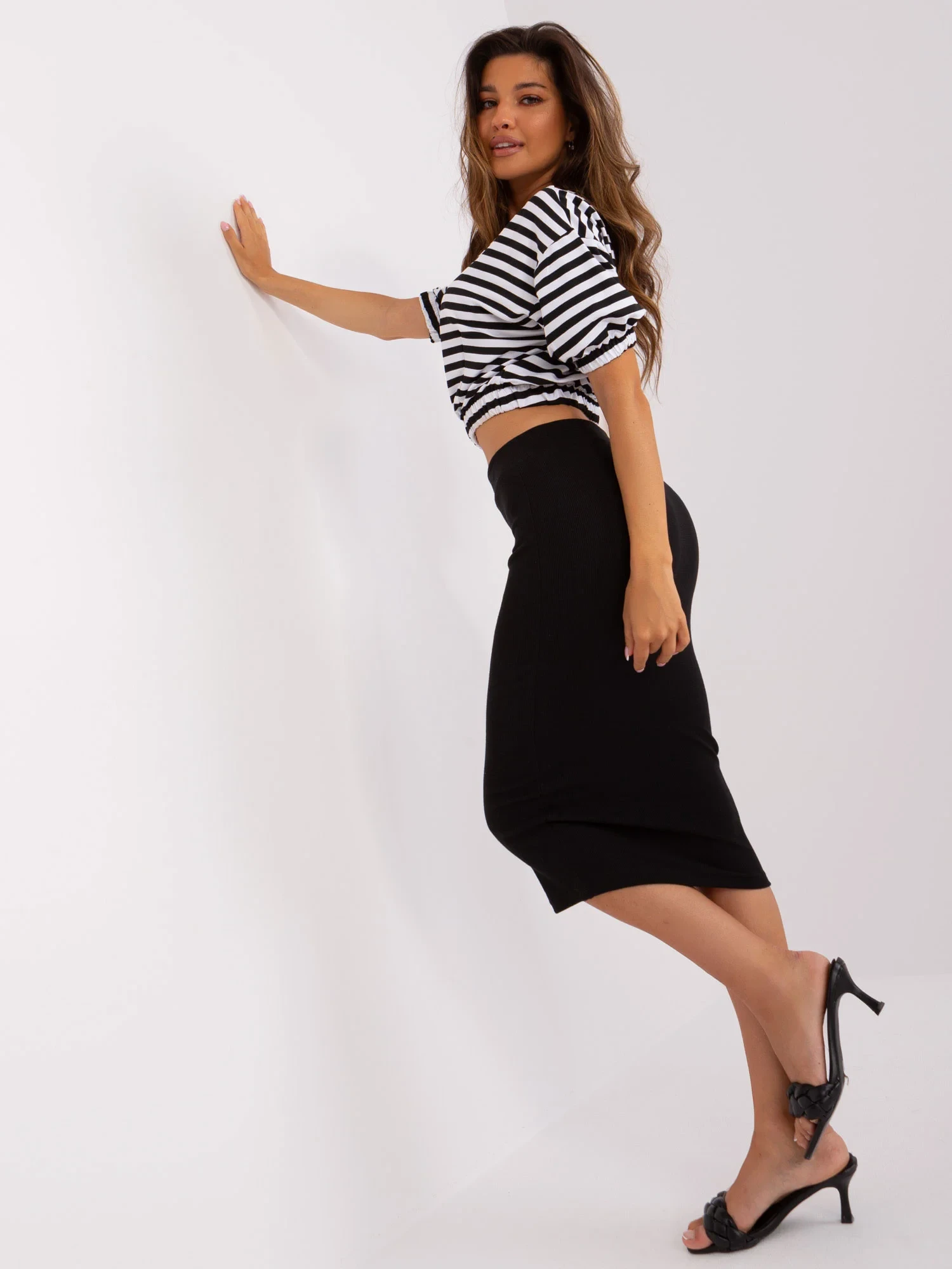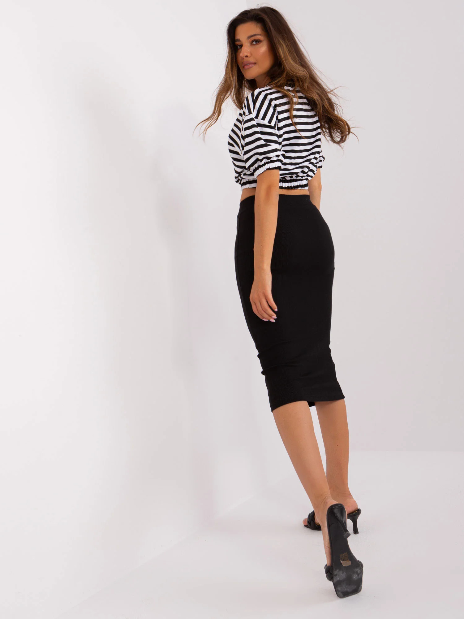 Wymiary kompletu w rozmiarze one size mierzone na płasko: szerokość bluzki pod pachami - 55 cm, długość bluzki - 47 cm, szerokość spódnicy w pasie - 33 cm, długość spódnicy - 74 cm.