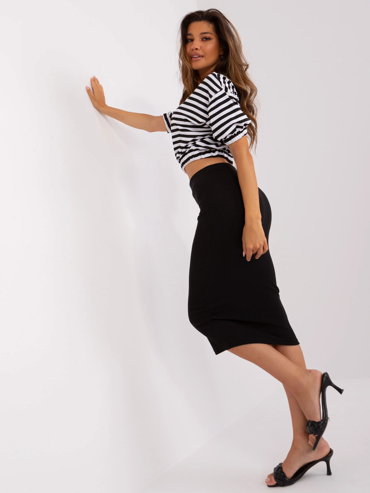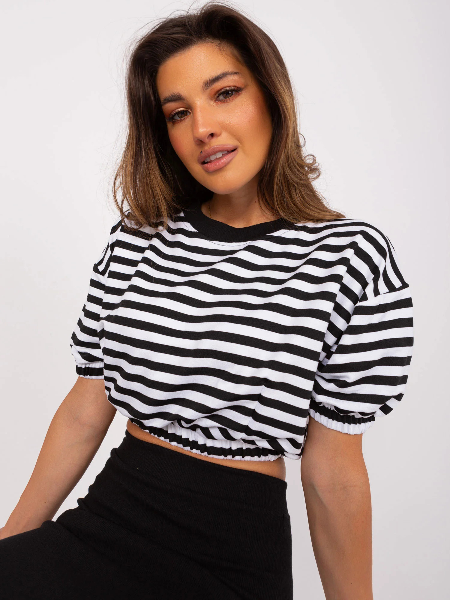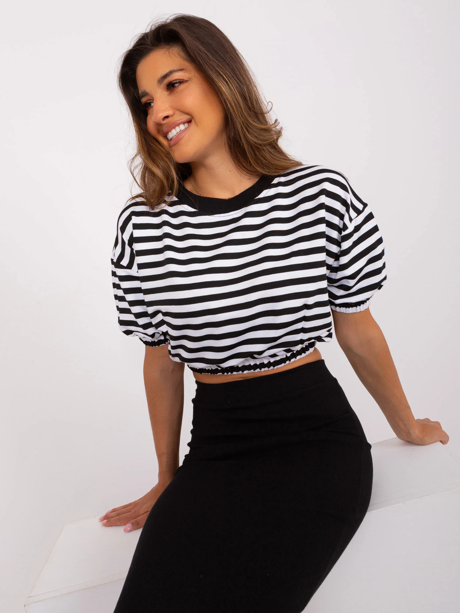 Modelka ma na sobie rozmiar one size. Wymiary modelki: wzrost 173 cm, biust 89 cm, talia 65 cm, biodra 91 cm.