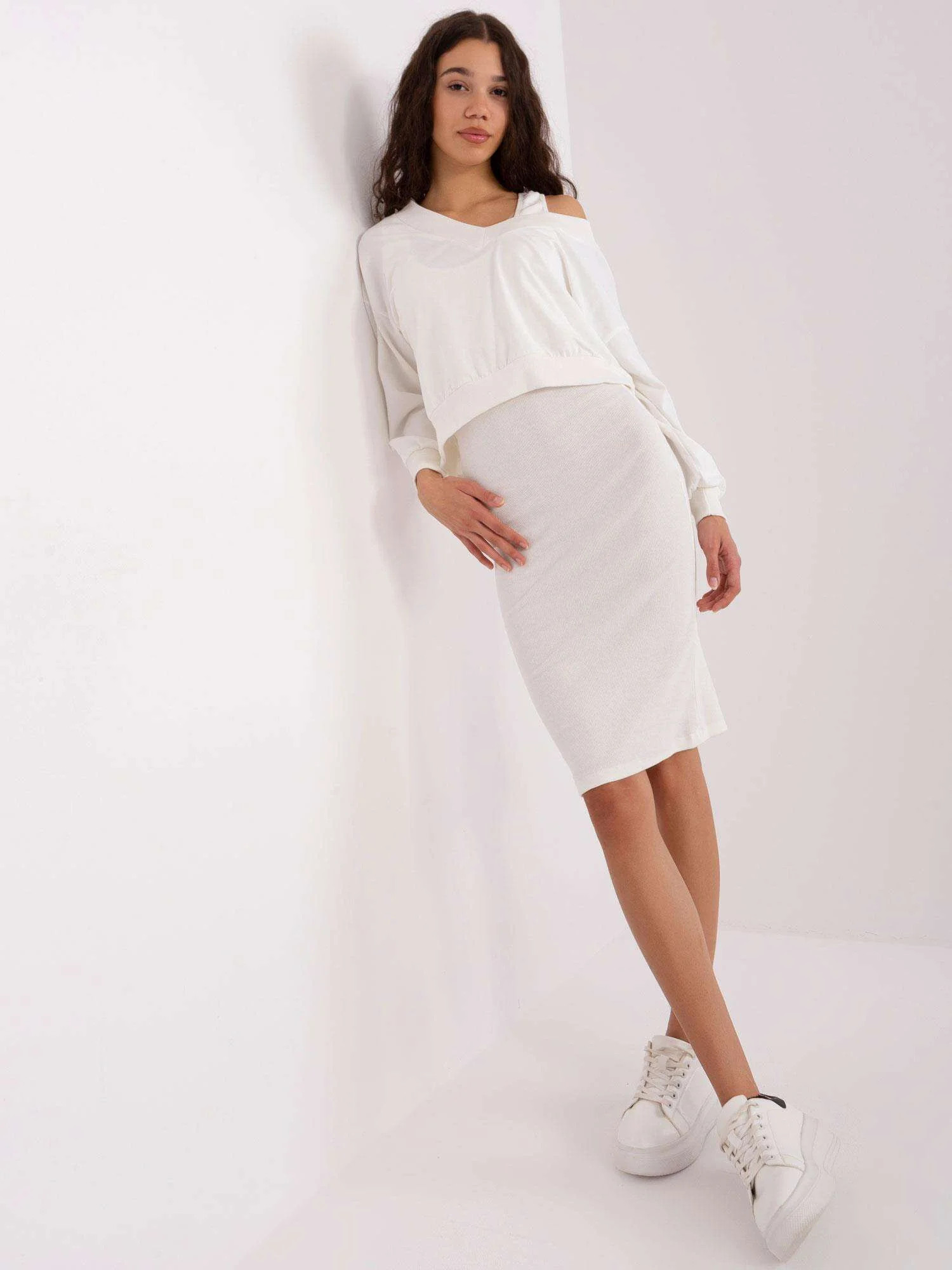 Wymiary kompletu w rozmiarze S mierzone na płasko: szerokość bluzki pachami - 64 cm, długość rękawa - 58 cm, długość bluzki - 57 cm, szerokość sukienki pachami - 42 cm, długość sukienki - 108 cm.