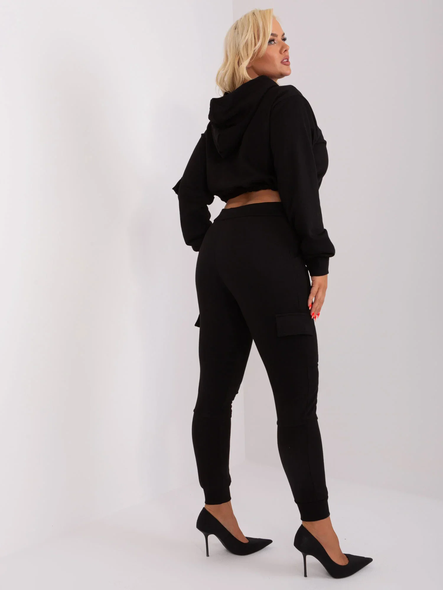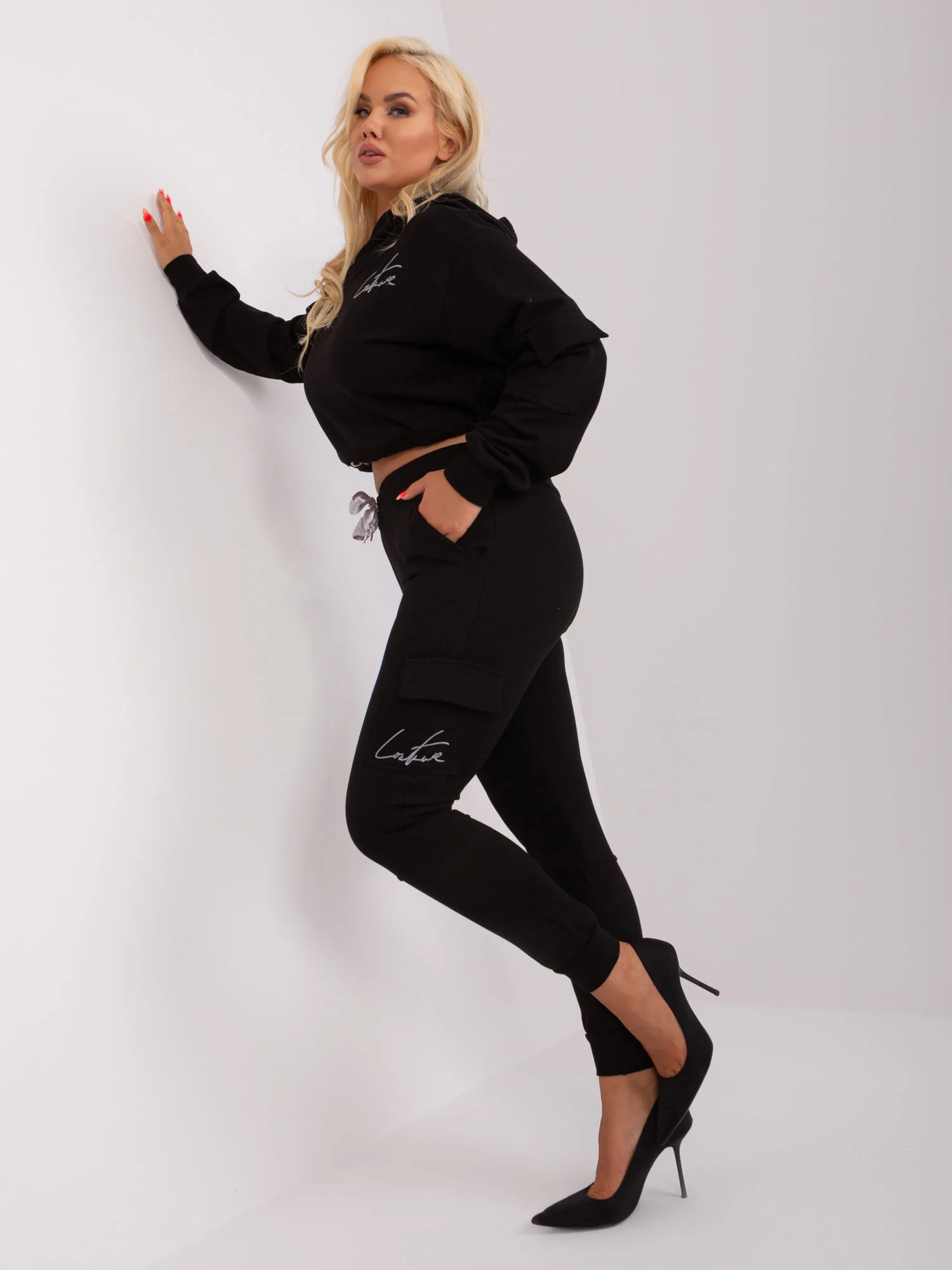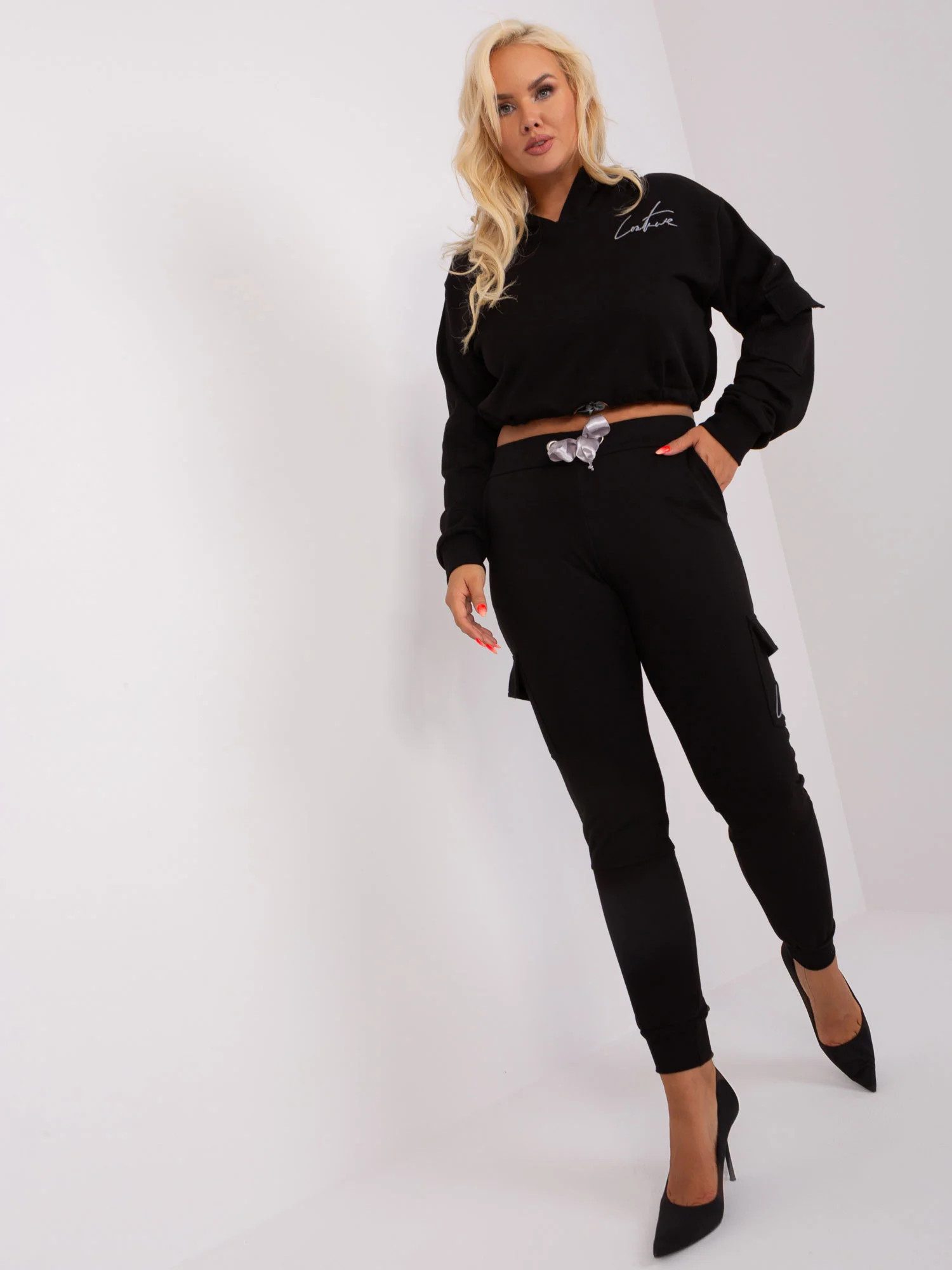 Wymiary kompletu w rozmiarze L mierzone na płasko: szerokość bluzy pod pachami - 60 cm, długość rękawa - 62 cm, długość bluzy - 44 cm, szerokość spodni w pasie - 40 cm, wysokość stanu - 30 cm, długość spodni - 100 cm.