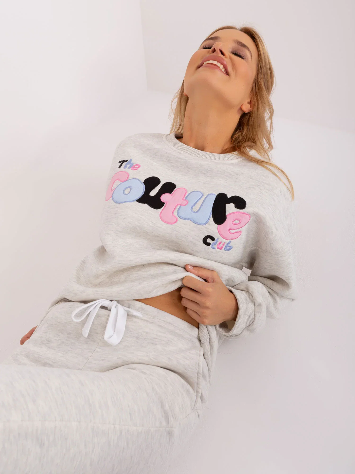 Wymiary kompletu w rozmiarze one size mierzone na płasko: szerokość pod pachami - 60 cm, długość bluzy - 68 cm, długość rękawa - 65 cm, szerokość w pasie - 35 cm, długość spodni - 104 cm.