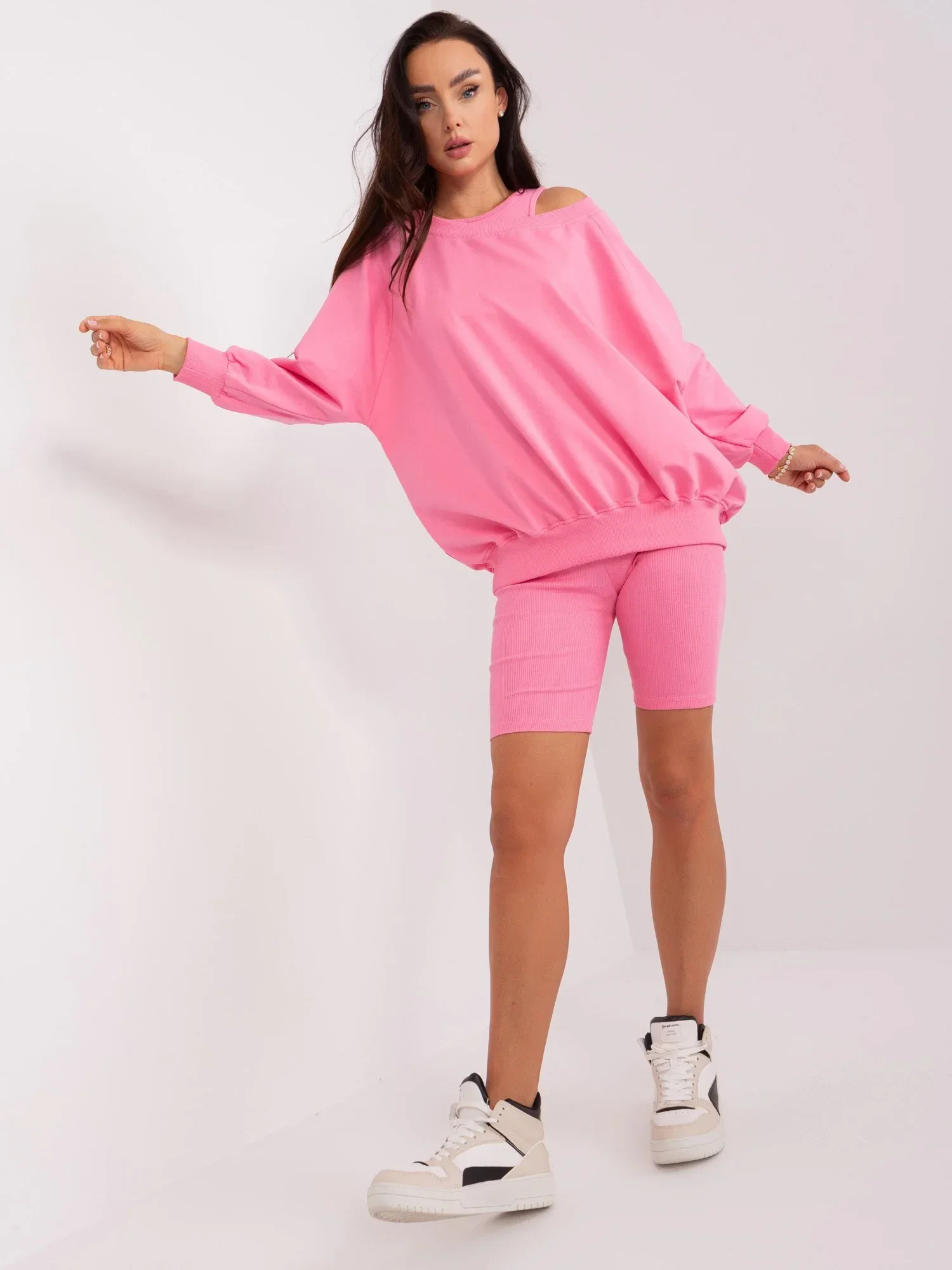 Wymiary kompletu w rozmiarze one size mierzone na płasko: szerokość bluzy pod pachami - 69 cm, długość rękawa - 56 cm, długość bluzy - 68 cm, szerokość topu pod pachami - 32 cm, długość topu - 41 cm, szerokość w pasie - 30 cm, długość kolarek - 46 cm.