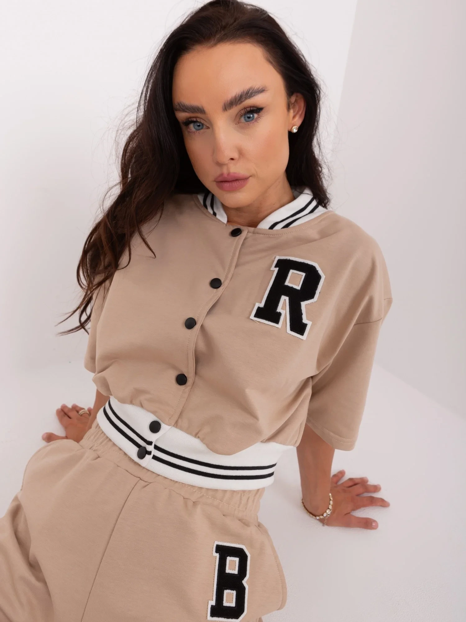 Wymiary kompletu w rozmiarze one size mierzone na płasko: szerokość bluzy pod pachami - 52 cm, długość rękawa - 22 cm, długość bluzy - 46 cm, szerokość w pasie - 30 cm, długość szortów - 39 cm.
