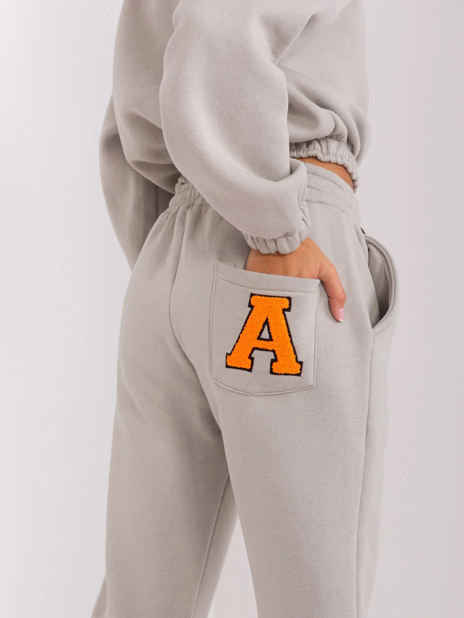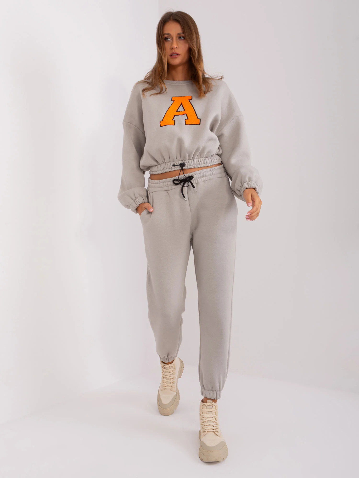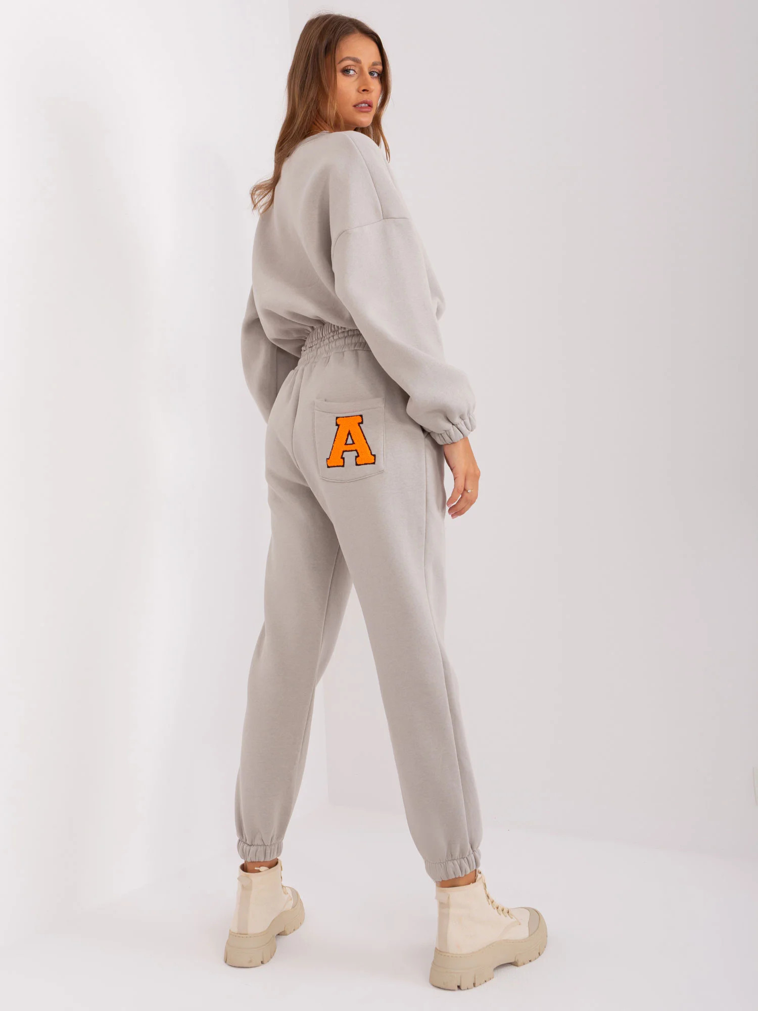Wymiary kompletu w rozmiarze one size mierzone na płasko: szerokość bluzy pod pachami - 58 cm, długość rękawa - 60 cm, długość bluzy - 50 cm, szerokość spodni w pasie - 38 cm, wysokość stanu - 29 cm, długość spodni - 93 cm.
