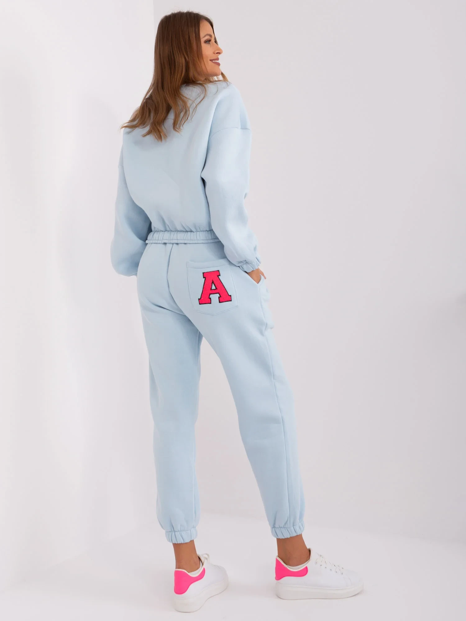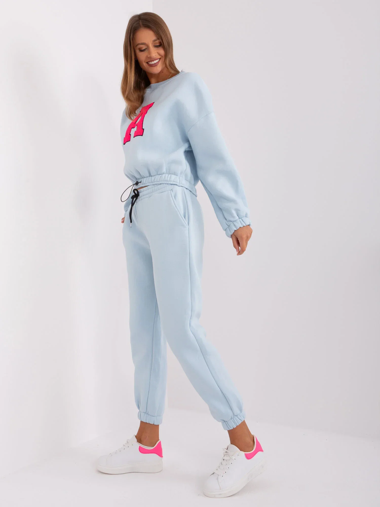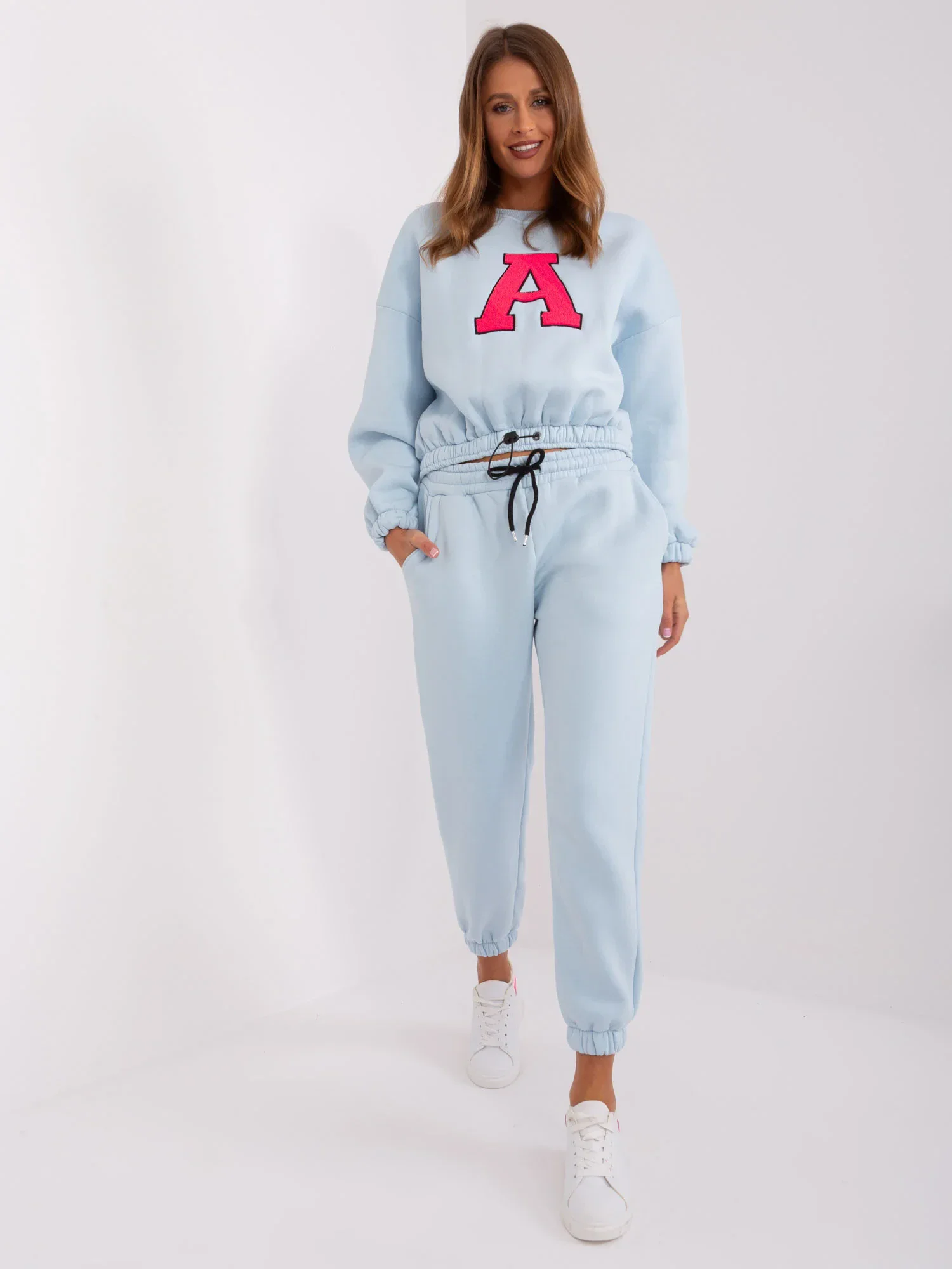 Wymiary kompletu w rozmiarze one size mierzone na płasko: szerokość bluzy pod pachami - 58 cm, długość rękawa - 60 cm, długość bluzy - 50 cm, szerokość spodni w pasie - 38 cm, wysokość stanu - 29 cm, długość spodni - 93 cm.
