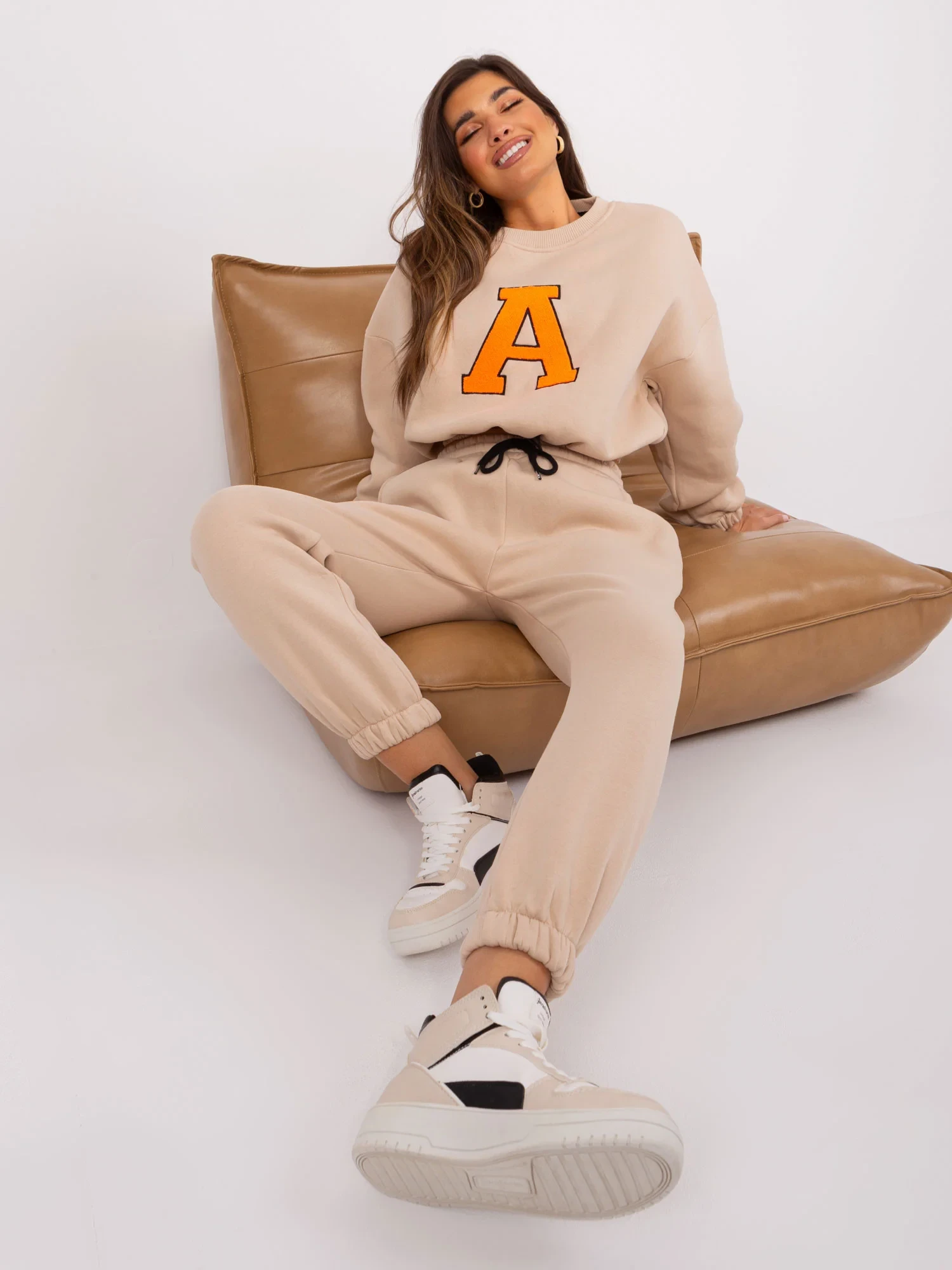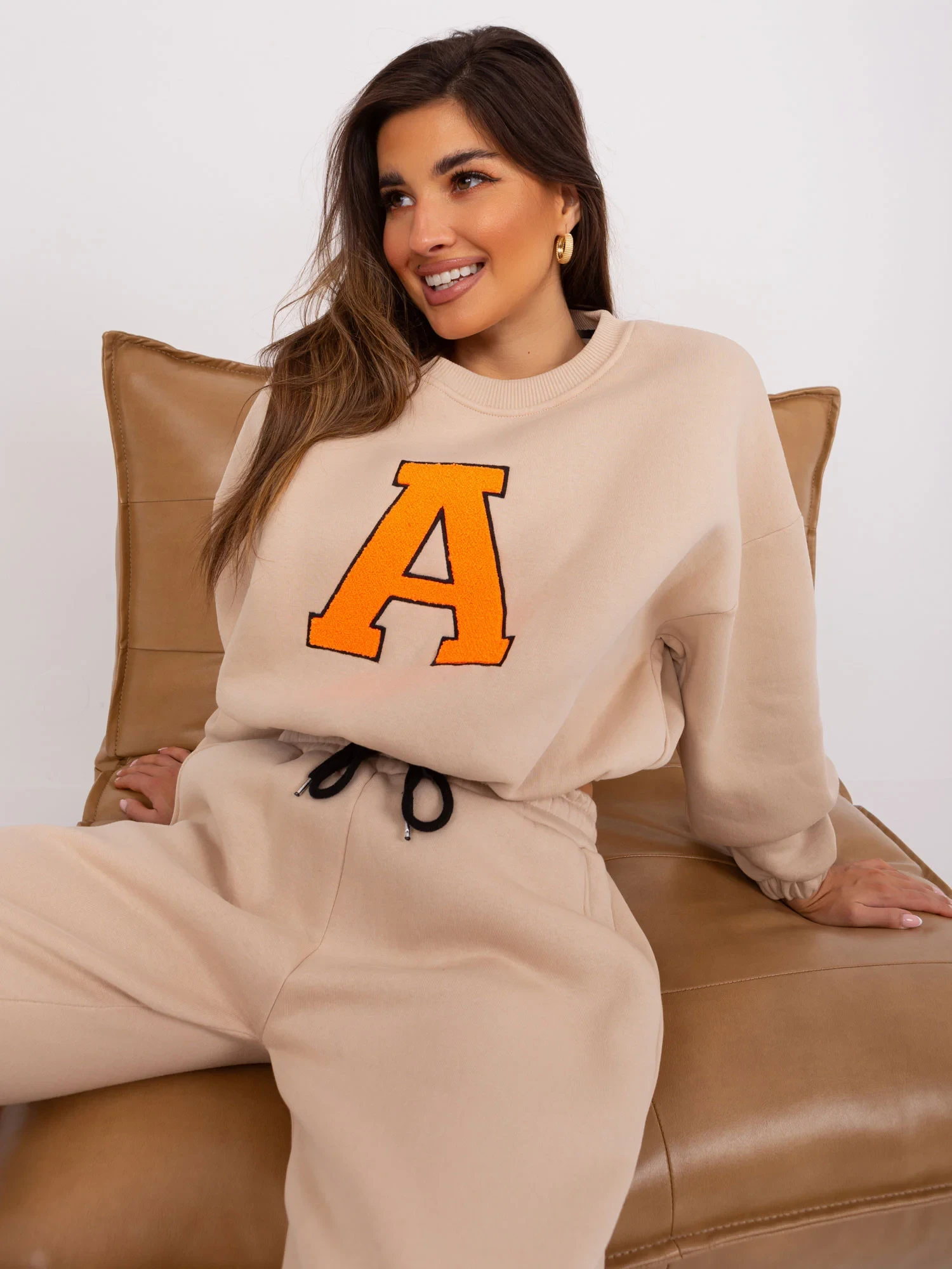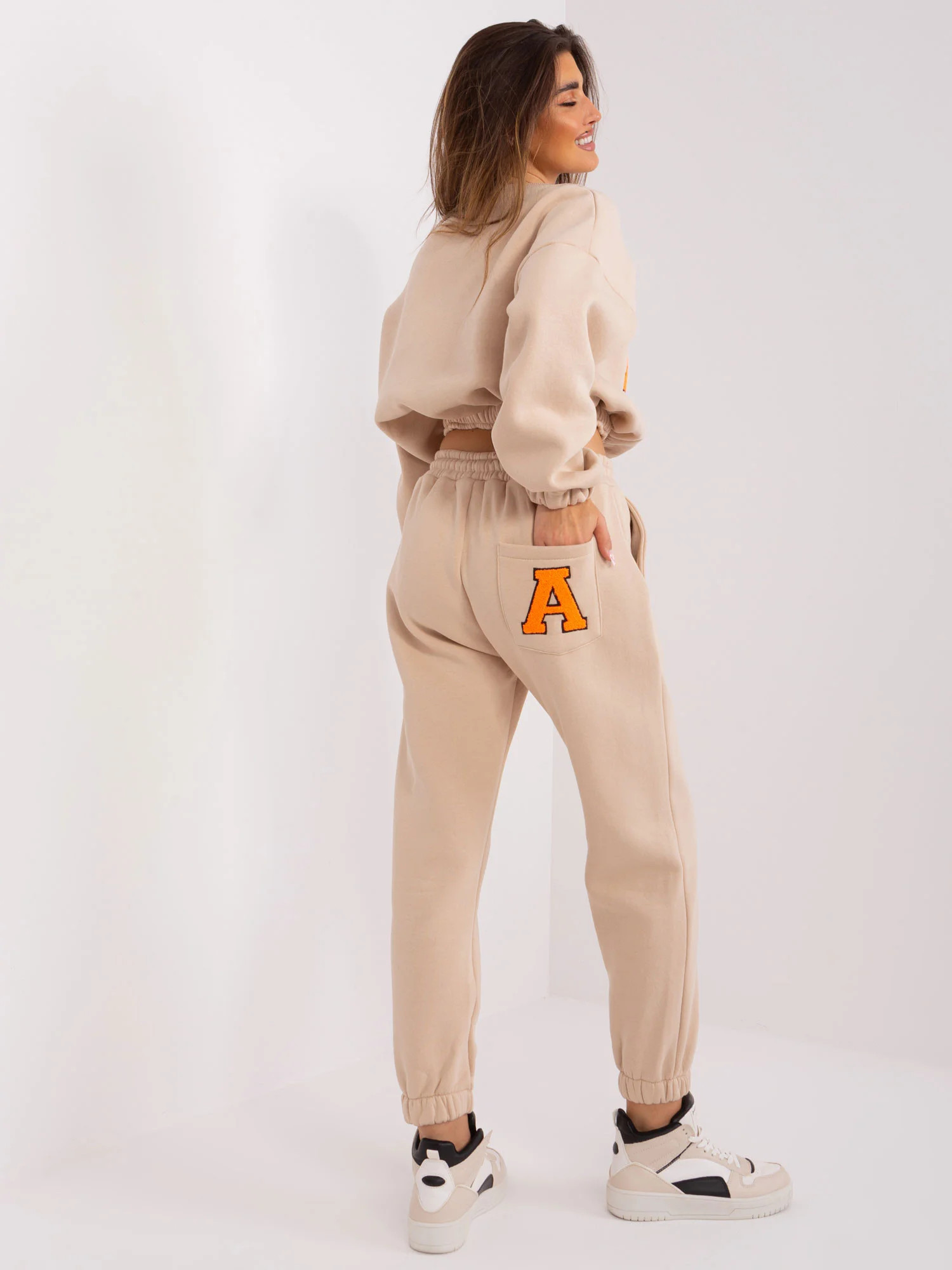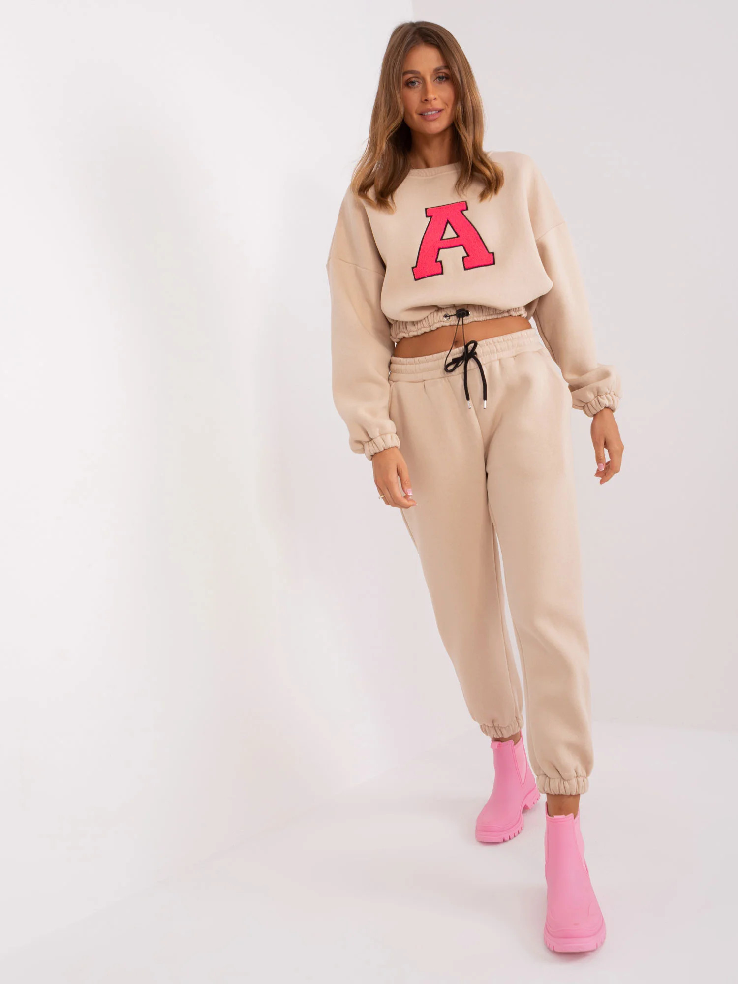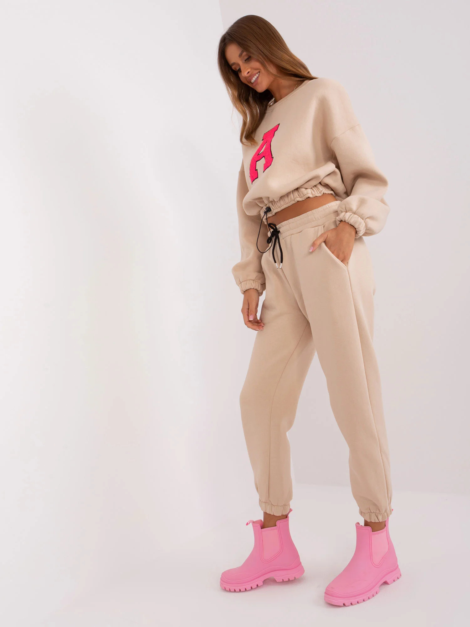 Wymiary kompletu w rozmiarze one size mierzone na płasko: szerokość bluzy pod pachami - 58 cm, długość rękawa - 60 cm, długość bluzy - 50 cm, szerokość spodni w pasie - 38 cm, wysokość stanu - 29 cm, długość spodni - 93 cm.