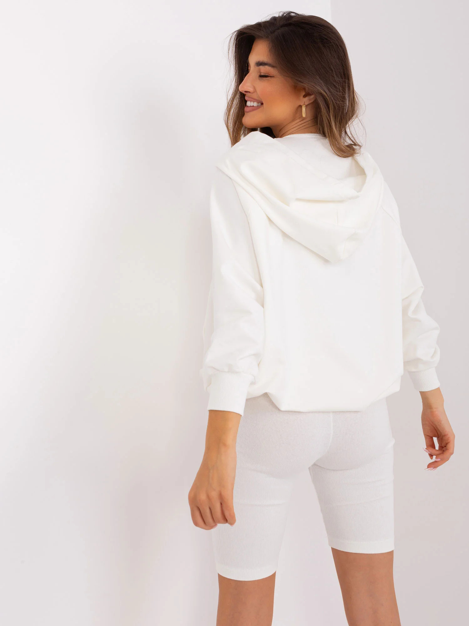 Wymiary kompletu w rozmiarze one size mierzone na płasko: szerokość bluzy pod pachami - 65 cm, długość rękawa - 59 cm, długość bluzy - 63 cm, szerokość topu pod pachami - 29 cm, długość topu - 42 cm, szerokość w pasie - 29 cm, długość kolarek - 47 cm.