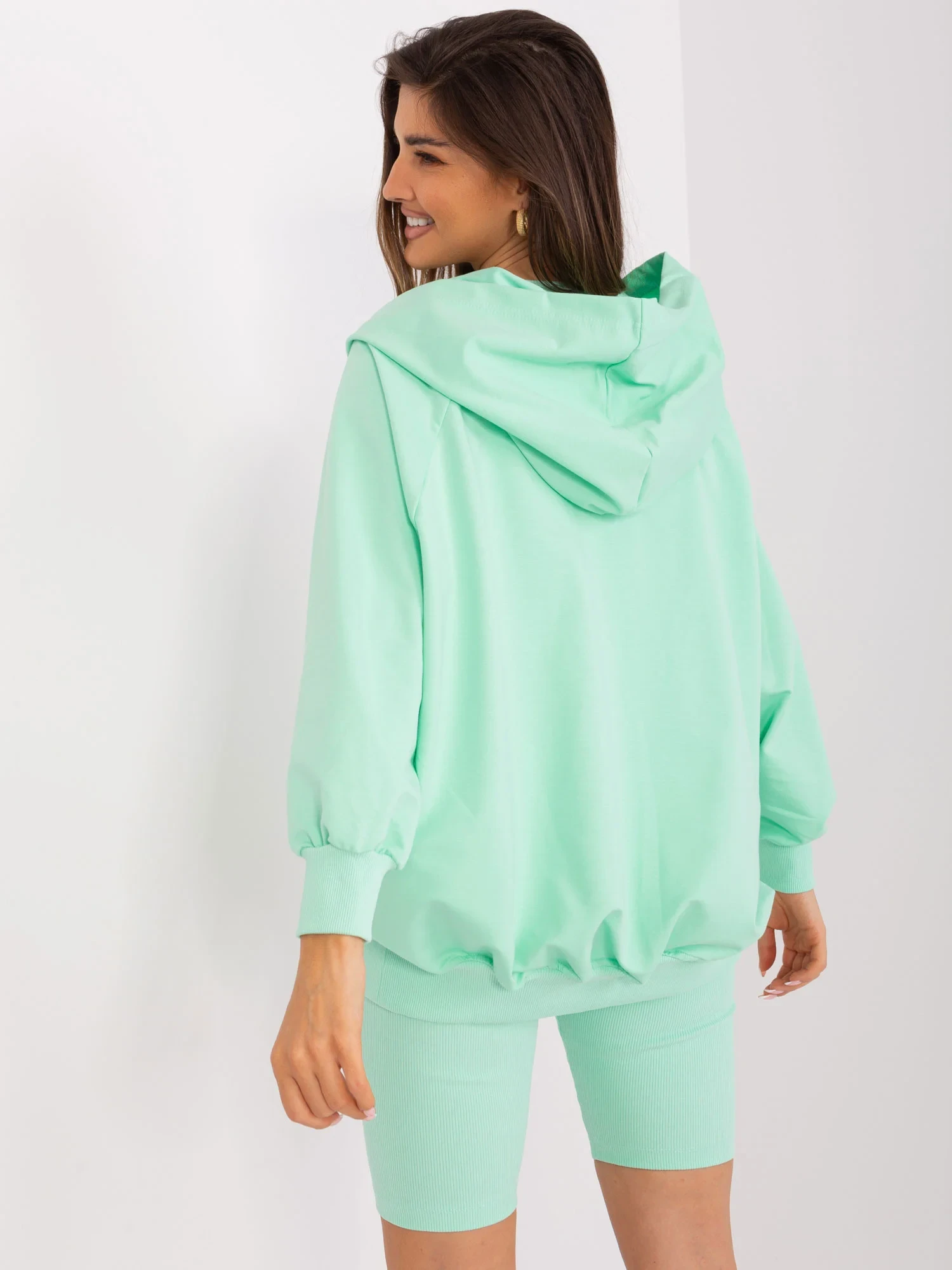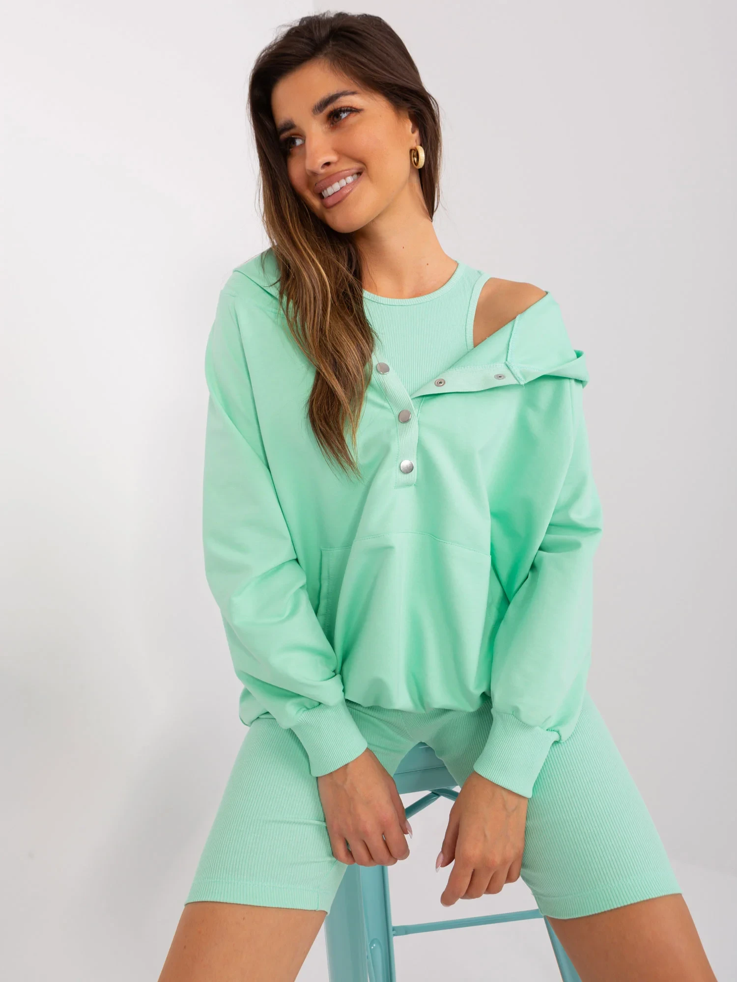 Wymiary kompletu w rozmiarze one size mierzone na płasko: szerokość bluzy pod pachami - 65 cm, długość rękawa - 59 cm, długość bluzy - 63 cm, szerokość topu pod pachami - 29 cm, długość topu - 42 cm, szerokość w pasie - 29 cm, długość kolarek - 47 cm.
